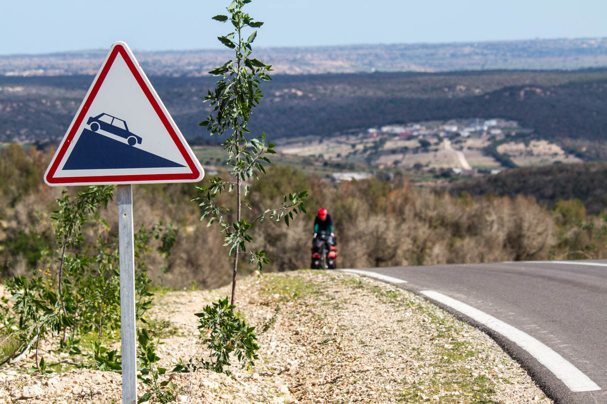 We push past the sand until we can ride again. The sand trucks are on the move and we stay behind one until we reach the section that is paved back up to the main road. It is steep at the last part and then we immediately have another long climb; the first of many today. Though the climbing is tough, we get awesome rewards with a tailwind on a downhill.