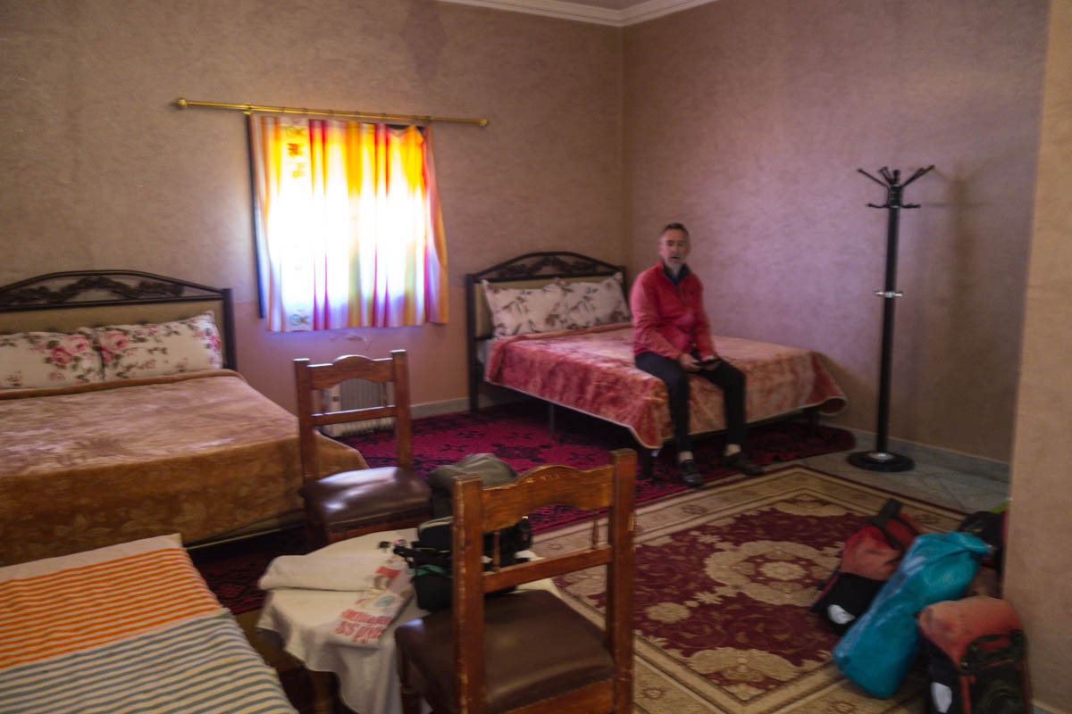 When we arrive in Telouet we stop at a small restaurant and order some food. Kitchens are pretty slow in Morocco, so Patrick walks off to check on some accommodations. The place recommended in the Lonely Planet guide is nowhere to be found, but there is a nice-looking hotel with very friendly hosts. After looking at a couple of rooms and negotiating a price we get a nice room for 200Dh.