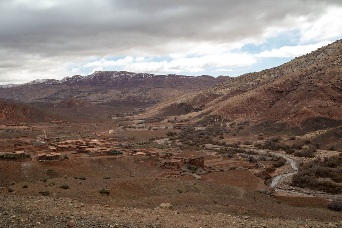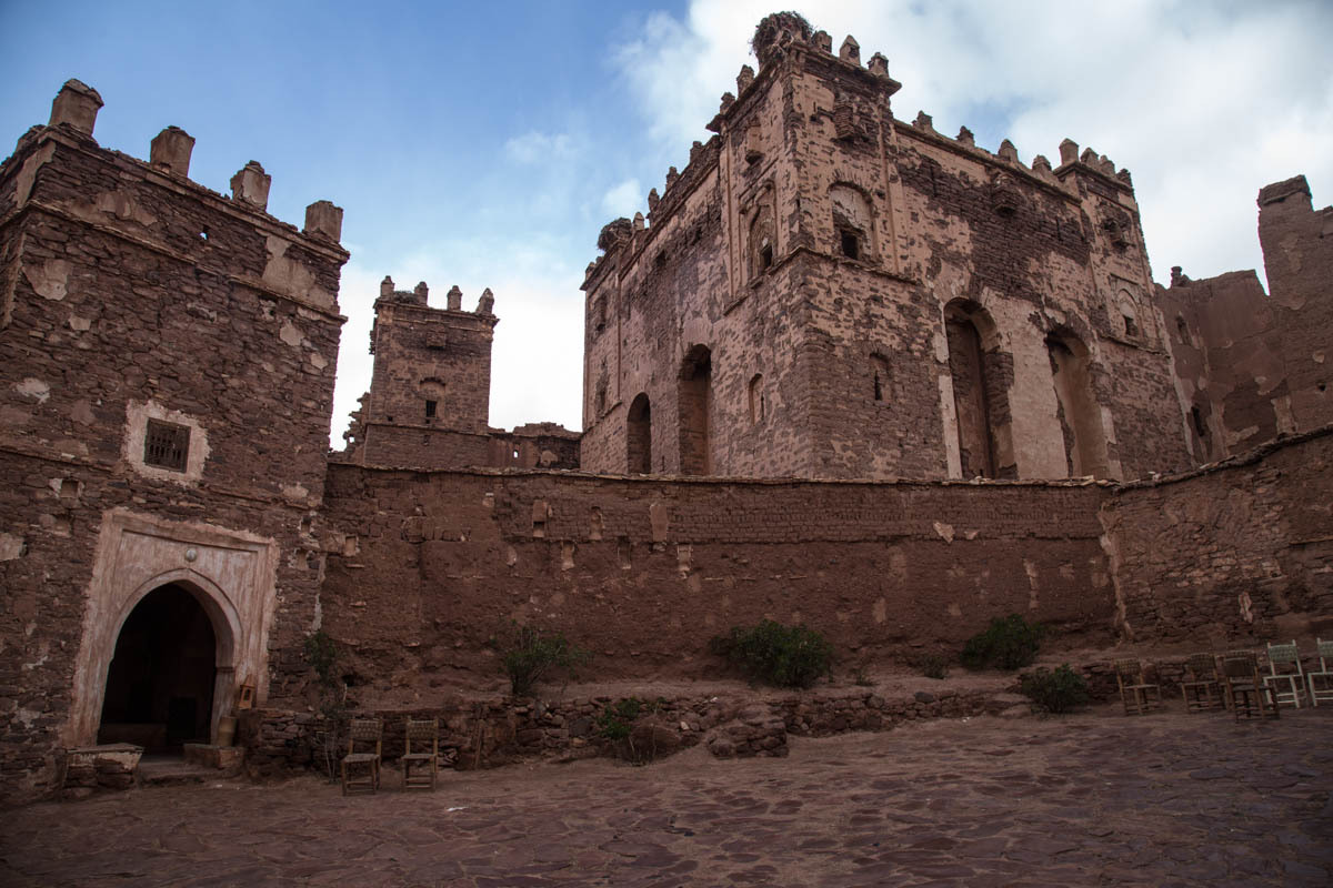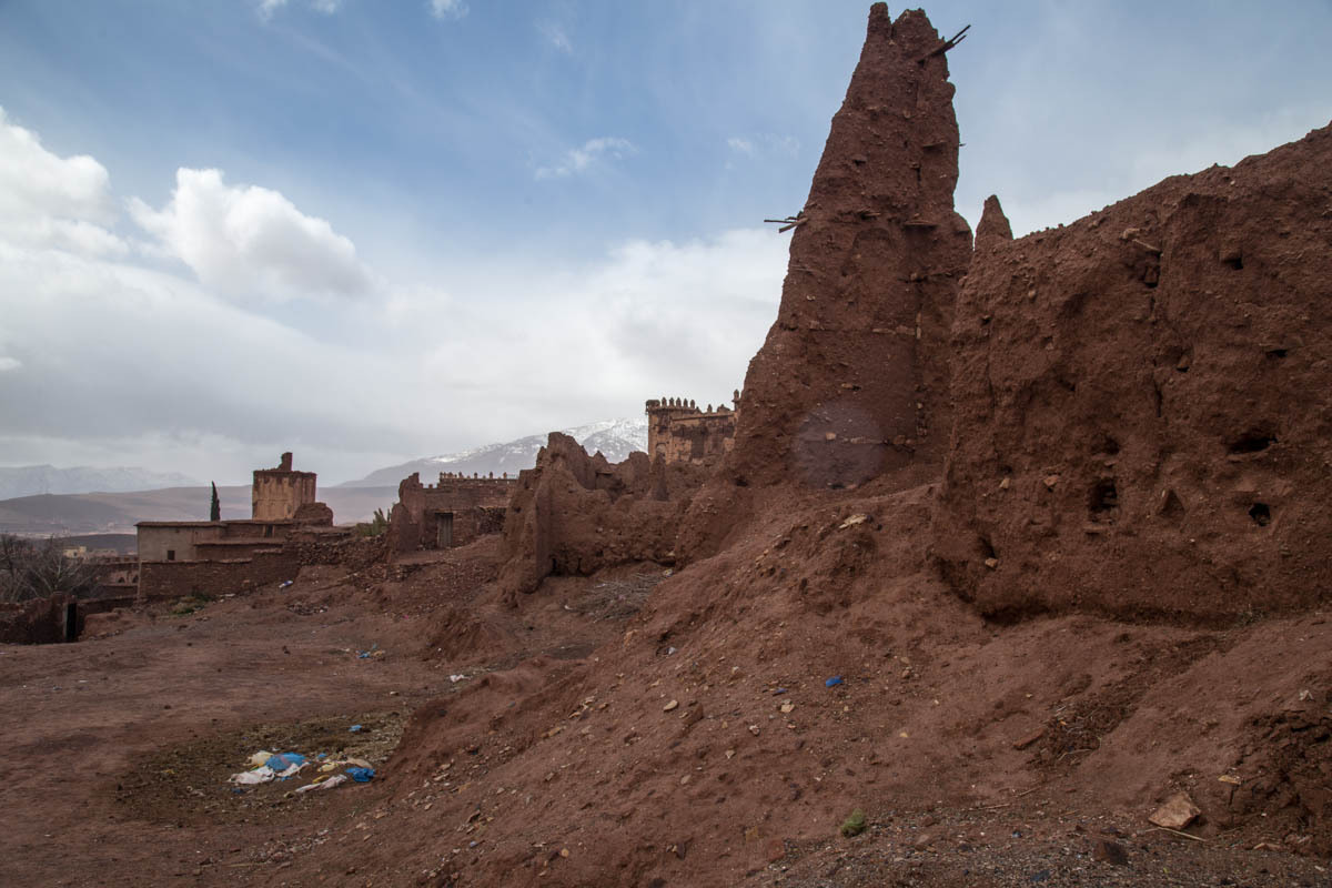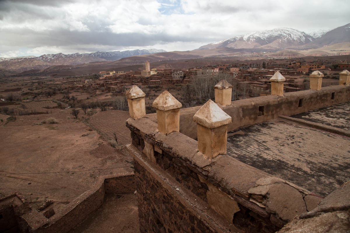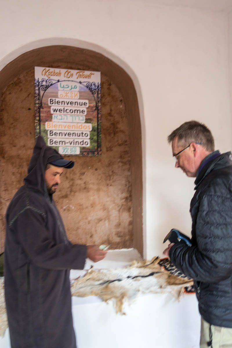 After we are settled in we decide to first go check out the famous Kasbah of Telouet. It is a little further then we expected, and the wind has blown in some low hanging rain clouds. The cook of the hotels sees us trying to decide whether we want to walk over in the rain, and quickly offers us a ride in his car. People in this part of Morocco do make a living of tourism, but gestures like this are not about making money, he truly wants to help us have a good experience, and does not ask for money. Of course we give him a tip. The Kasbah was once quite the place, the pasha that ruled this land built himself quite a castle. Inside are old pictures of him with Charles the Gaulle and Winston Churchill. Most of the building is already ruined, or slowly decaying, but a couple of large rooms upstairs show the level of detail and craftsmanship that was put into the finishes inside.