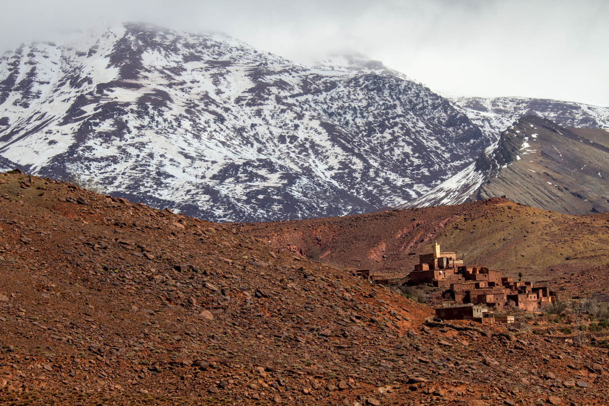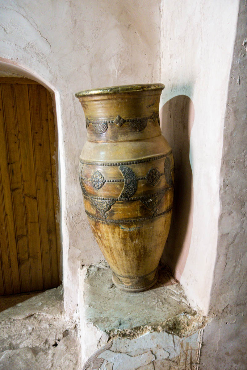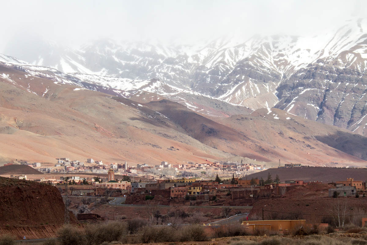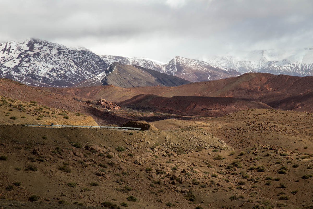 After we are settled in we decide to first go check out the famous Kasbah of Telouet. It is a little further then we expected, and the wind has blown in some low hanging rain clouds. The cook of the hotels sees us trying to decide whether we want to walk over in the rain, and quickly offers us a ride in his car. People in this part of Morocco do make a living of tourism, but gestures like this are not about making money, he truly wants to help us have a good experience, and does not ask for money. Of course we give him a tip. The Kasbah was once quite the place, the pasha that ruled this land built himself quite a castle. Inside are old pictures of him with Charles the Gaulle and Winston Churchill. Most of the building is already ruined, or slowly decaying, but a couple of large rooms upstairs show the level of detail and craftsmanship that was put into the finishes inside.