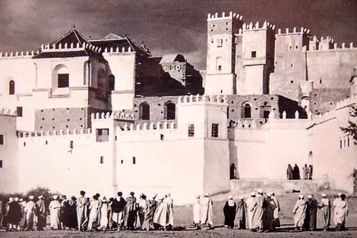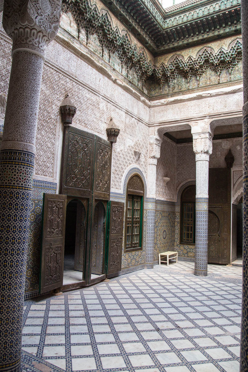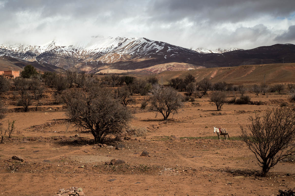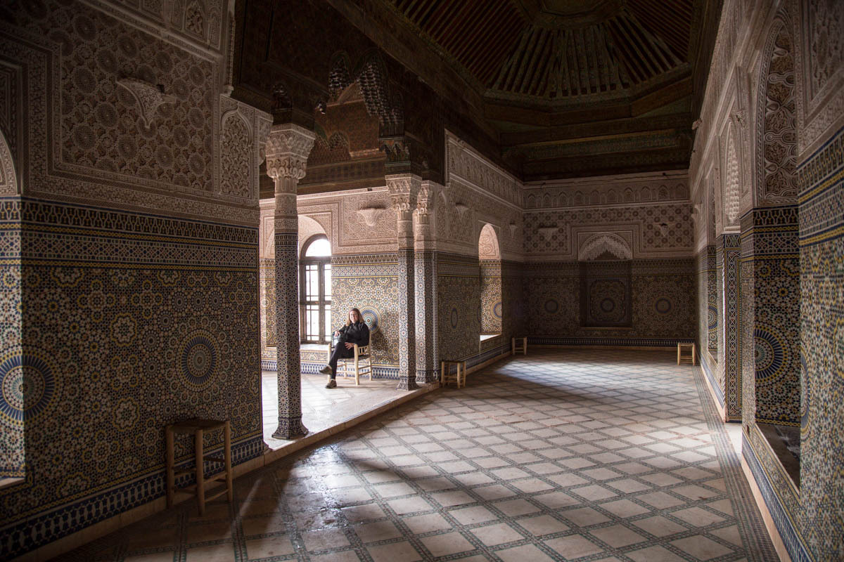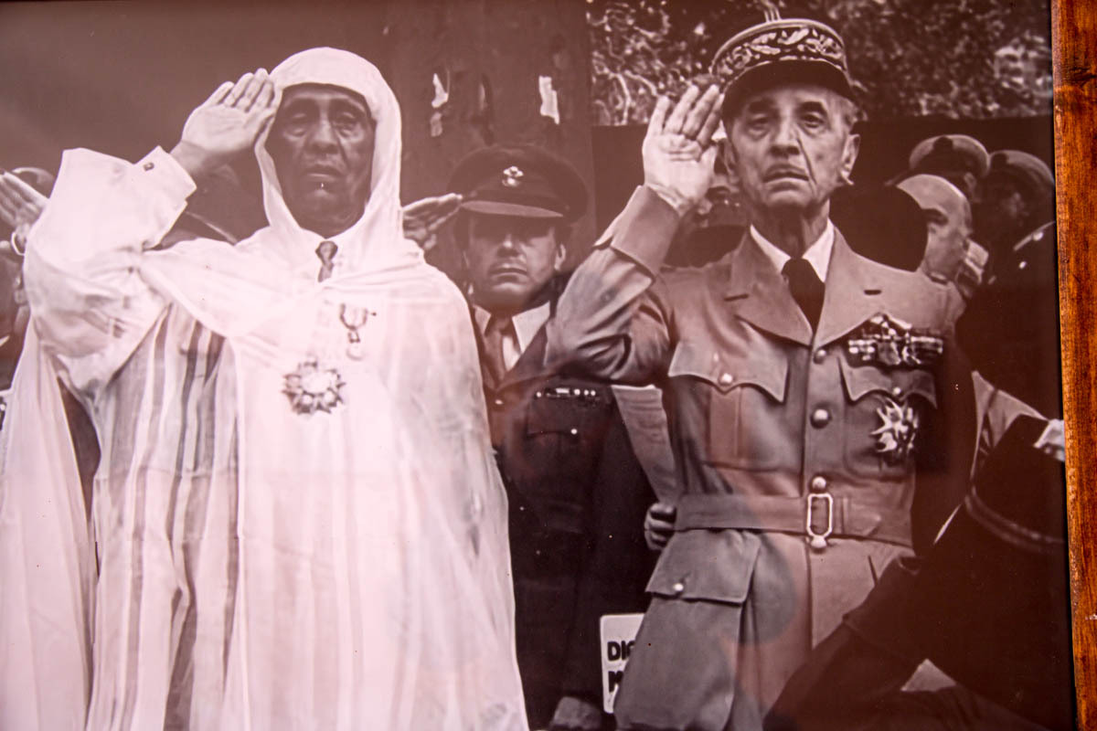 After we are settled in we decide to first go check out the famous Kasbah of Telouet. It is a little further then we expected, and the wind has blown in some low hanging rain clouds. The cook of the hotels sees us trying to decide whether we want to walk over in the rain, and quickly offers us a ride in his car. People in this part of Morocco do make a living of tourism, but gestures like this are not about making money, he truly wants to help us have a good experience, and does not ask for money. Of course we give him a tip. The Kasbah was once quite the place, the pasha that ruled this land built himself quite a castle. Inside are old pictures of him with Charles the Gaulle and Winston Churchill. Most of the building is already ruined, or slowly decaying, but a couple of large rooms upstairs show the level of detail and craftsmanship that was put into the finishes inside.
