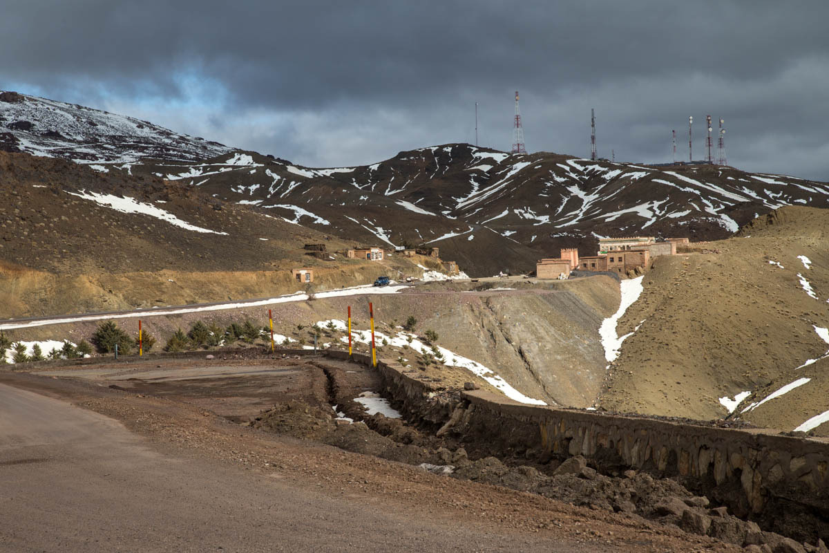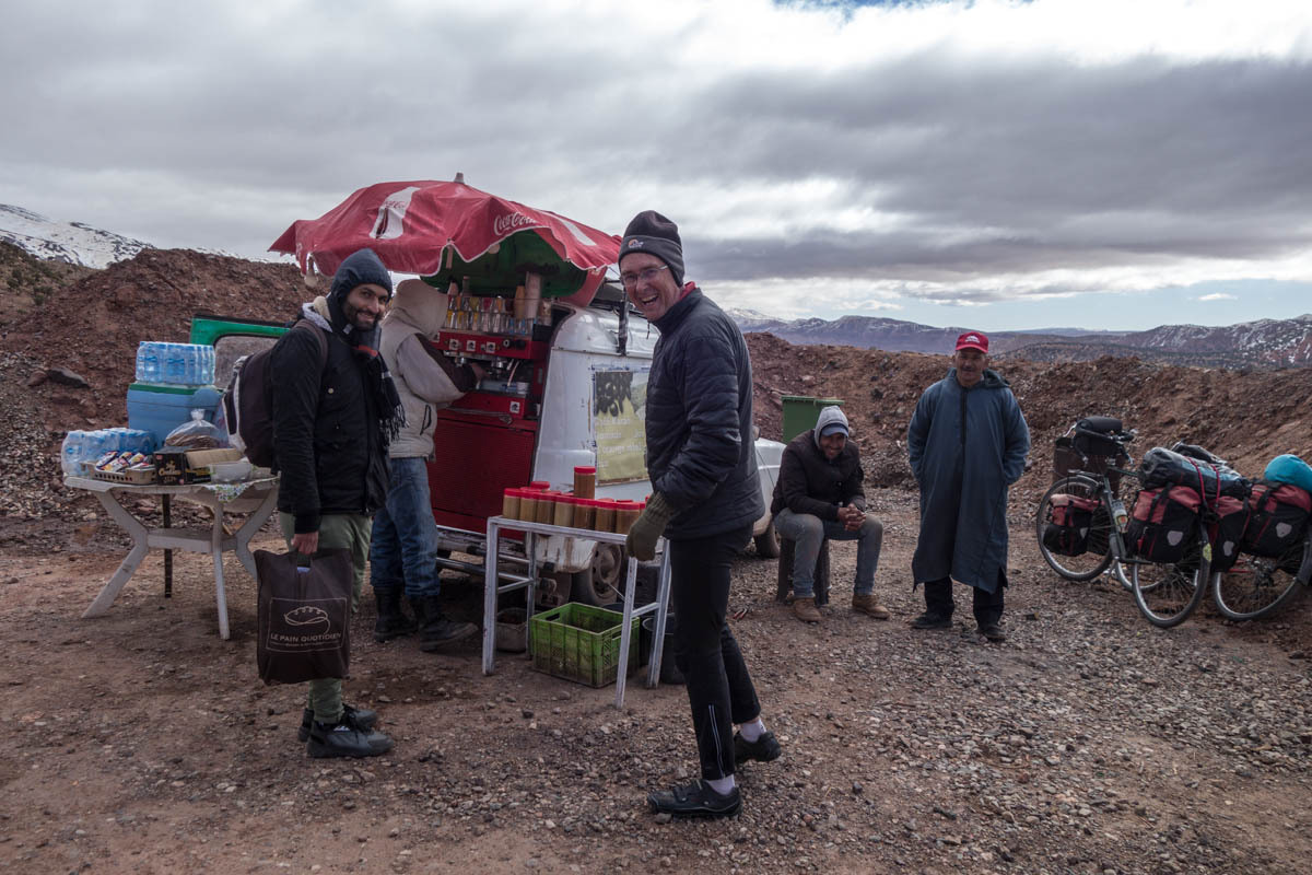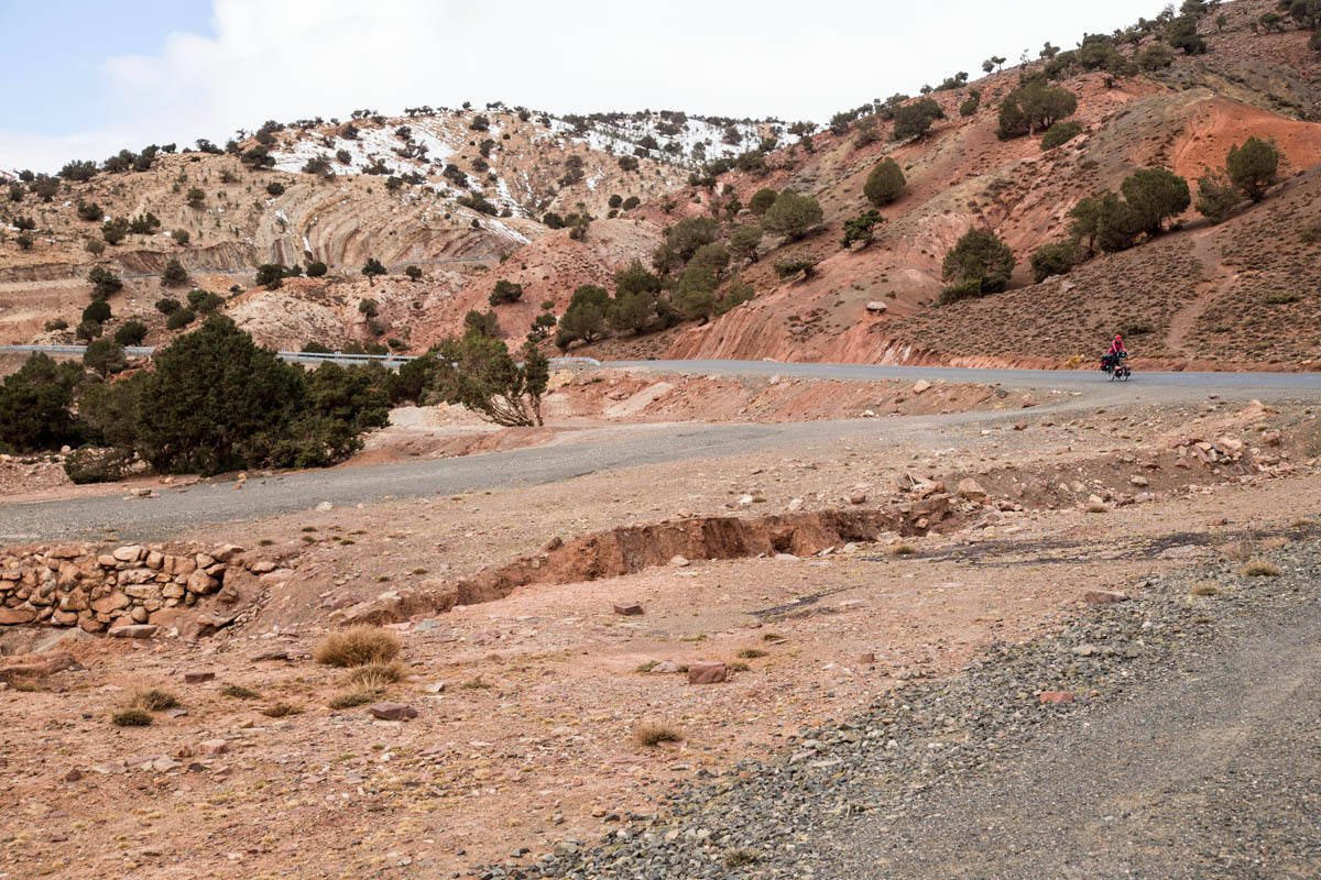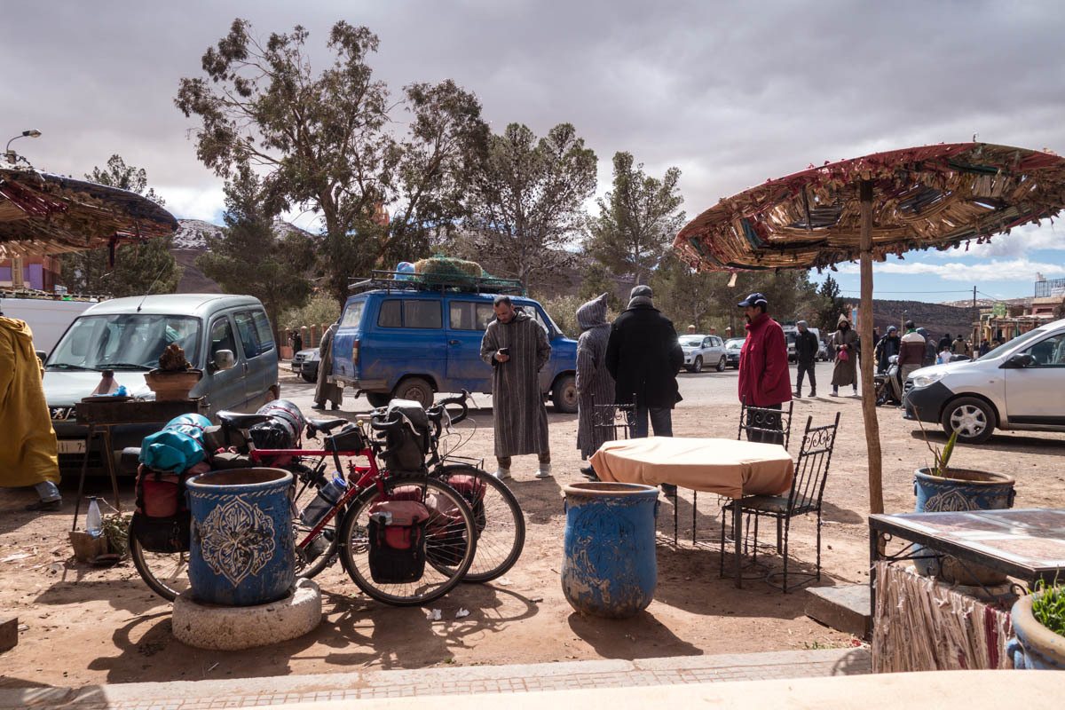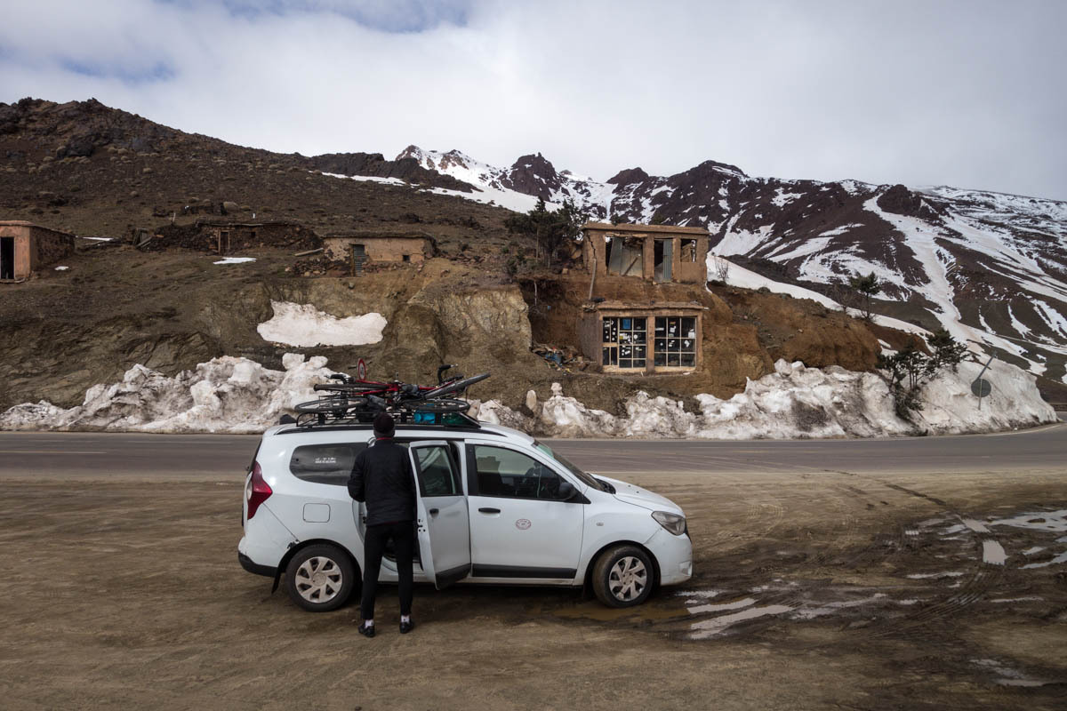 At Zerkten, Patrick negotiates a Grand Taxi to the top of the pass for 150dh $15US). The guy starts out asking 300Dh, Patrick counter offers 100. Another guy gets involved and the asking price first drops to 200, then to 150 with the caveat that we won’t leave for at least a half hour. That time will probably be spent to find additional passengers. We ride up the road a little further to see if there are other taxi stands, but no luck. When we slowly return the taxi comes driving towards us. The 150Dh price is again confirmed and we have a deal leaving right now. Panniers go in the back, and the bikes on the roof rack, and off we go. The road slowly rises for a long time up a valley, then the last 3-5 km are steeper switchbacks. There’s road construction and the taking out of many curves, straightening the road and making it steeper. At the summit, there is a strong cold wind.