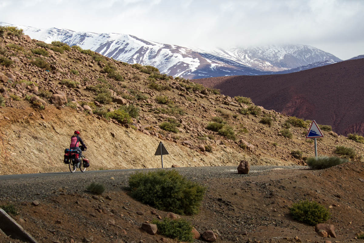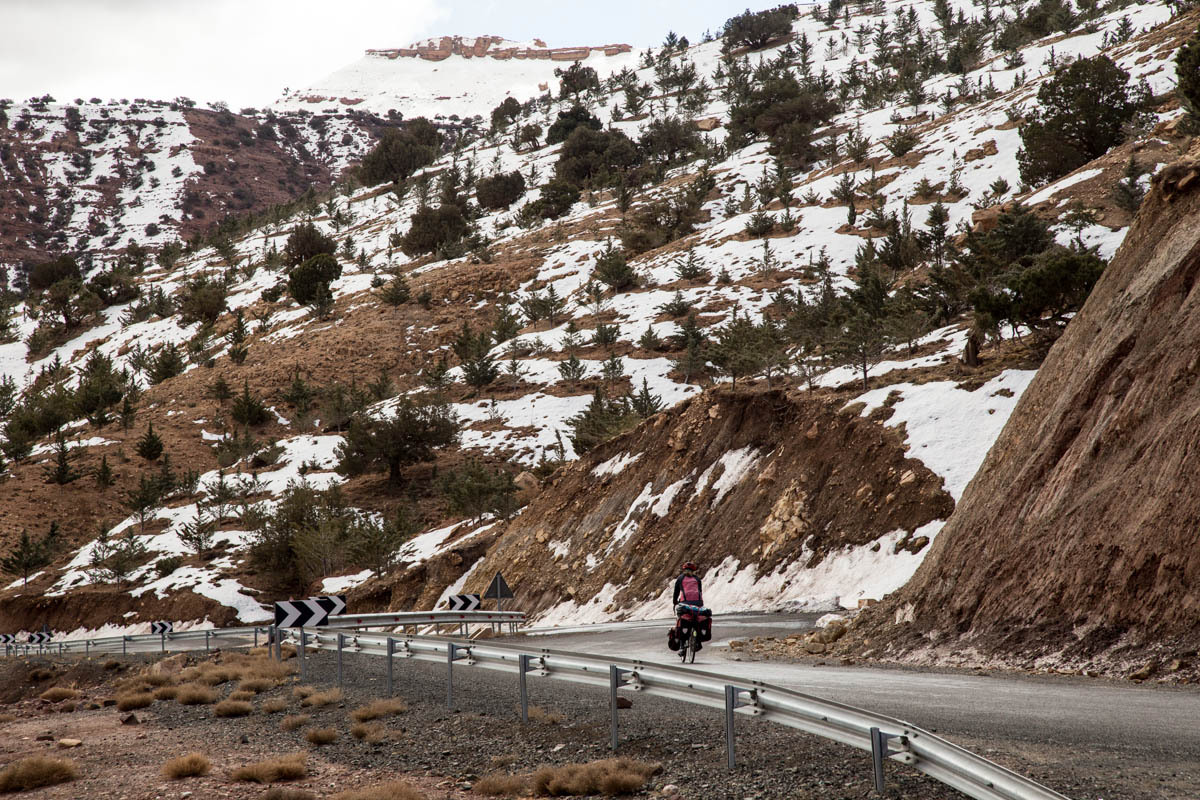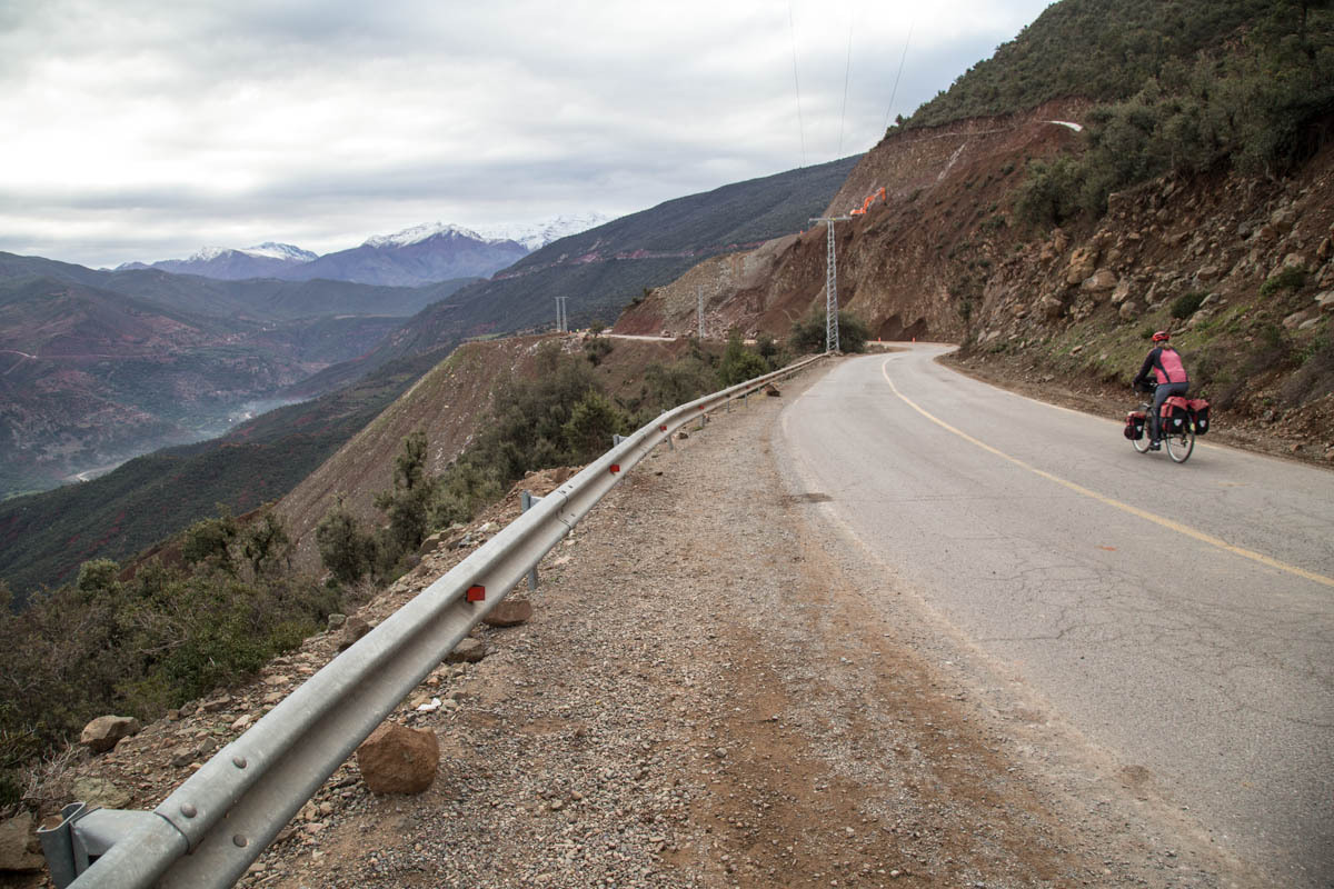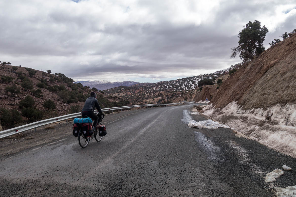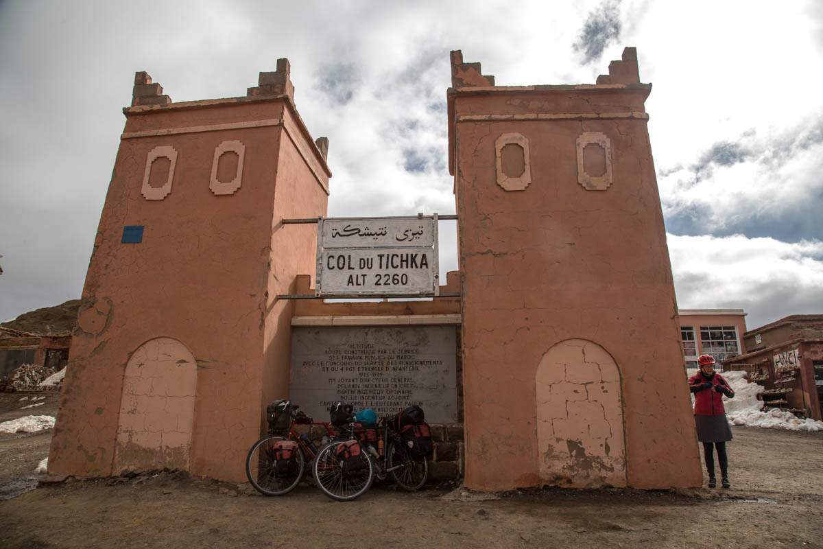 At Zerkten, Patrick negotiates a Grand Taxi to the top of the pass for 150dh $15US). The guy starts out asking 300Dh, Patrick counter offers 100. Another guy gets involved and the asking price first drops to 200, then to 150 with the caveat that we won’t leave for at least a half hour. That time will probably be spent to find additional passengers. We ride up the road a little further to see if there are other taxi stands, but no luck. When we slowly return the taxi comes driving towards us. The 150Dh price is again confirmed and we have a deal leaving right now. Panniers go in the back, and the bikes on the roof rack, and off we go. The road slowly rises for a long time up a valley, then the last 3-5 km are steeper switchbacks. There’s road construction and the taking out of many curves, straightening the road and making it steeper. At the summit, there is a strong cold wind.