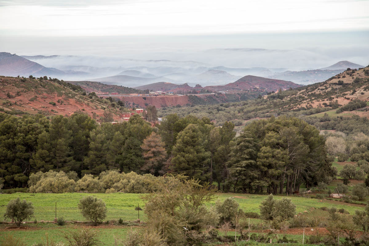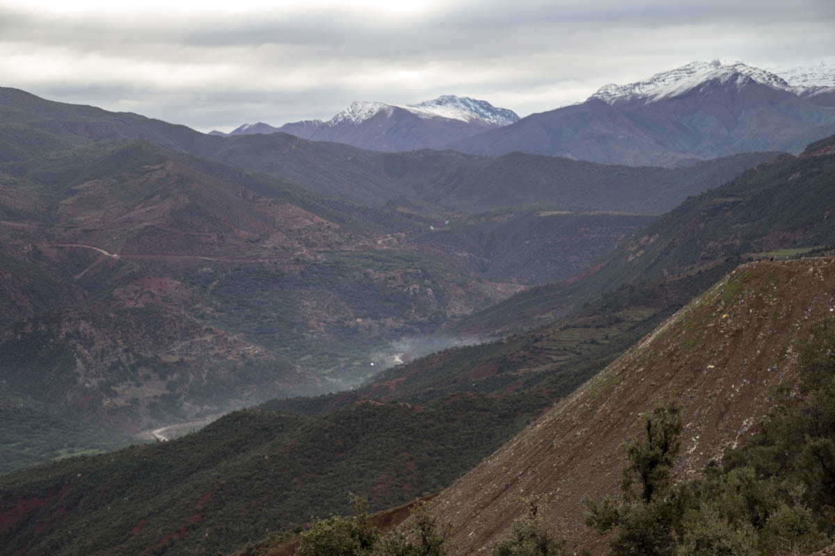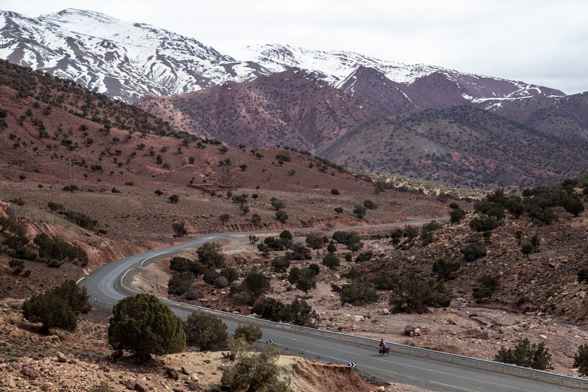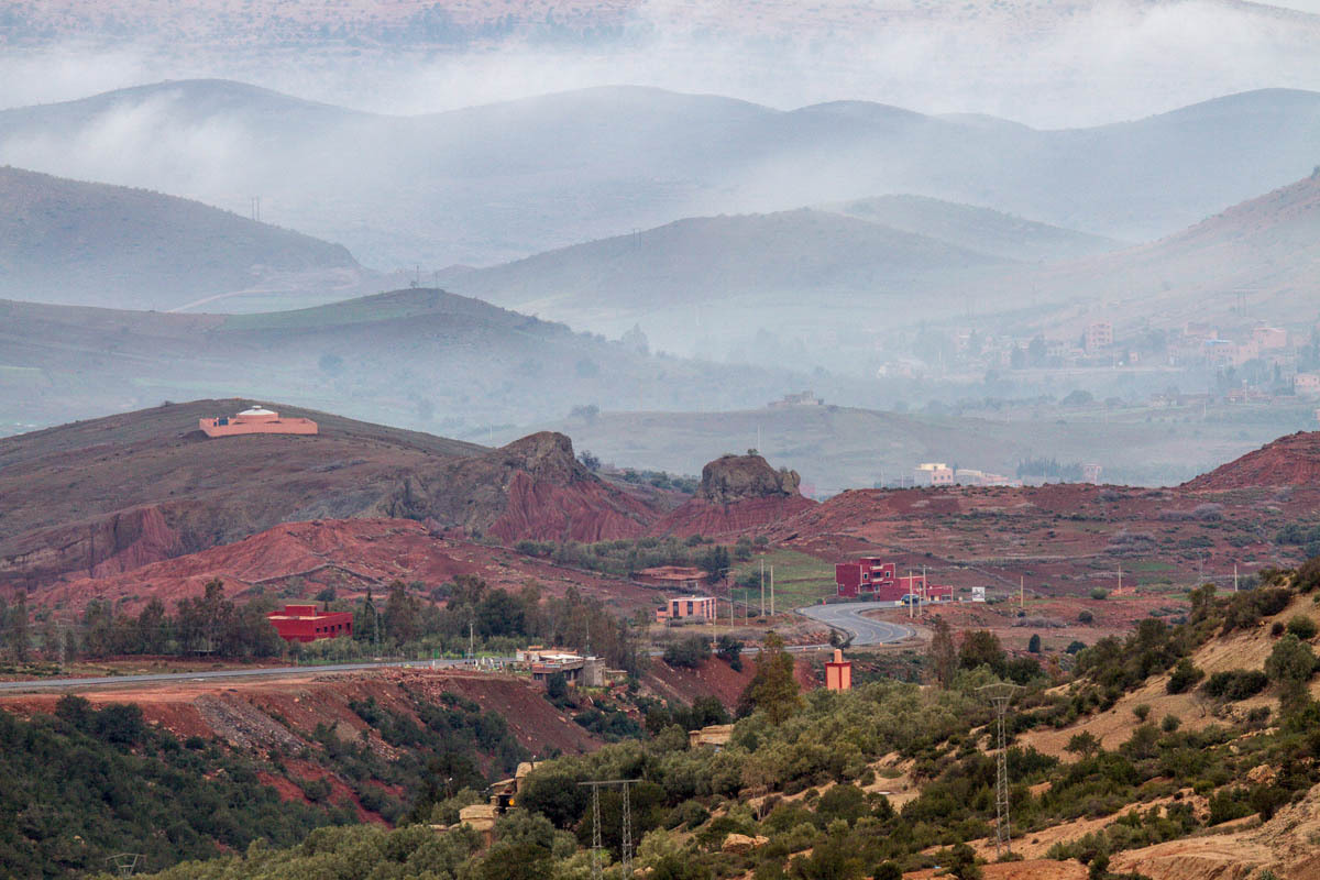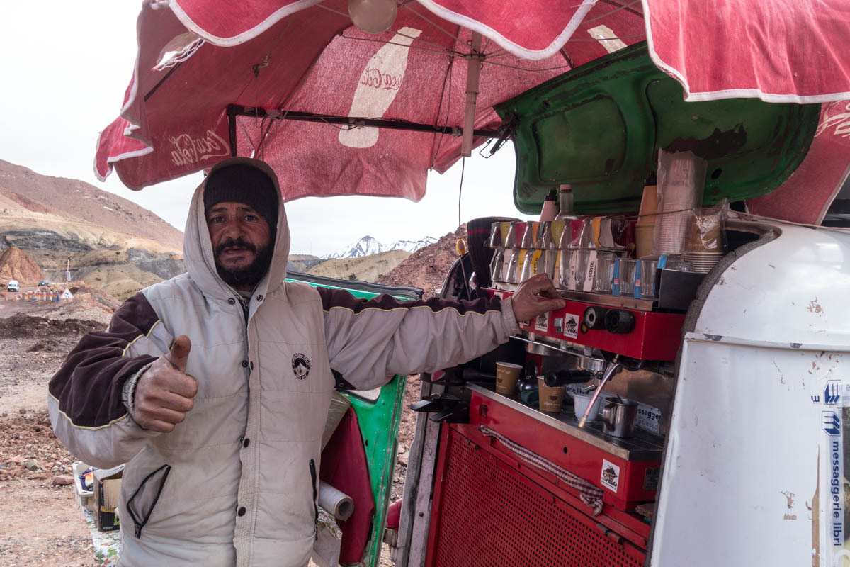 At Zerkten, Patrick negotiates a Grand Taxi to the top of the pass for 150dh $15US). The guy starts out asking 300Dh, Patrick counter offers 100. Another guy gets involved and the asking price first drops to 200, then to 150 with the caveat that we won’t leave for at least a half hour. That time will probably be spent to find additional passengers. We ride up the road a little further to see if there are other taxi stands, but no luck. When we slowly return the taxi comes driving towards us. The 150Dh price is again confirmed and we have a deal leaving right now. Panniers go in the back, and the bikes on the roof rack, and off we go. The road slowly rises for a long time up a valley, then the last 3-5 km are steeper switchbacks. There’s road construction and the taking out of many curves, straightening the road and making it steeper. At the summit, there is a strong cold wind.
