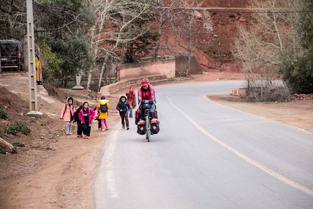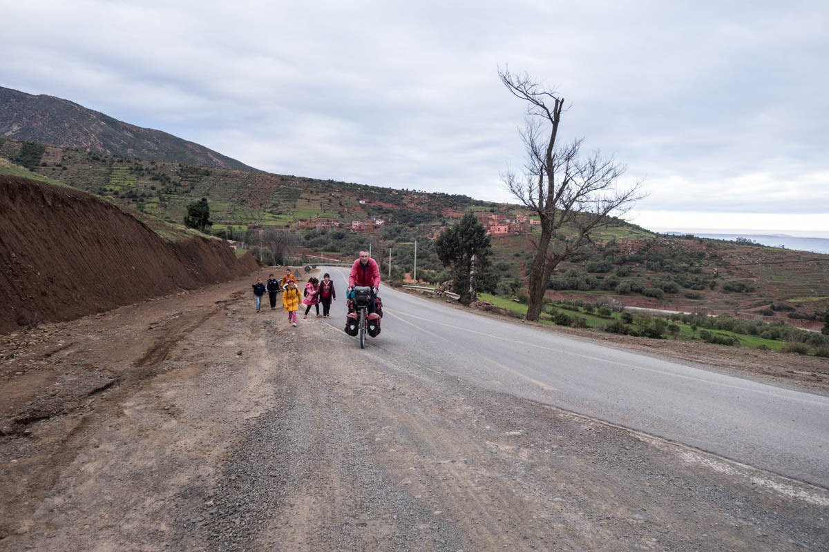 On the climb up to Toufliht, we pick up school children who walk along side of us. Just staring, not asking for anything. Patrick high-fives some of them and in return they push the bike for a bit.