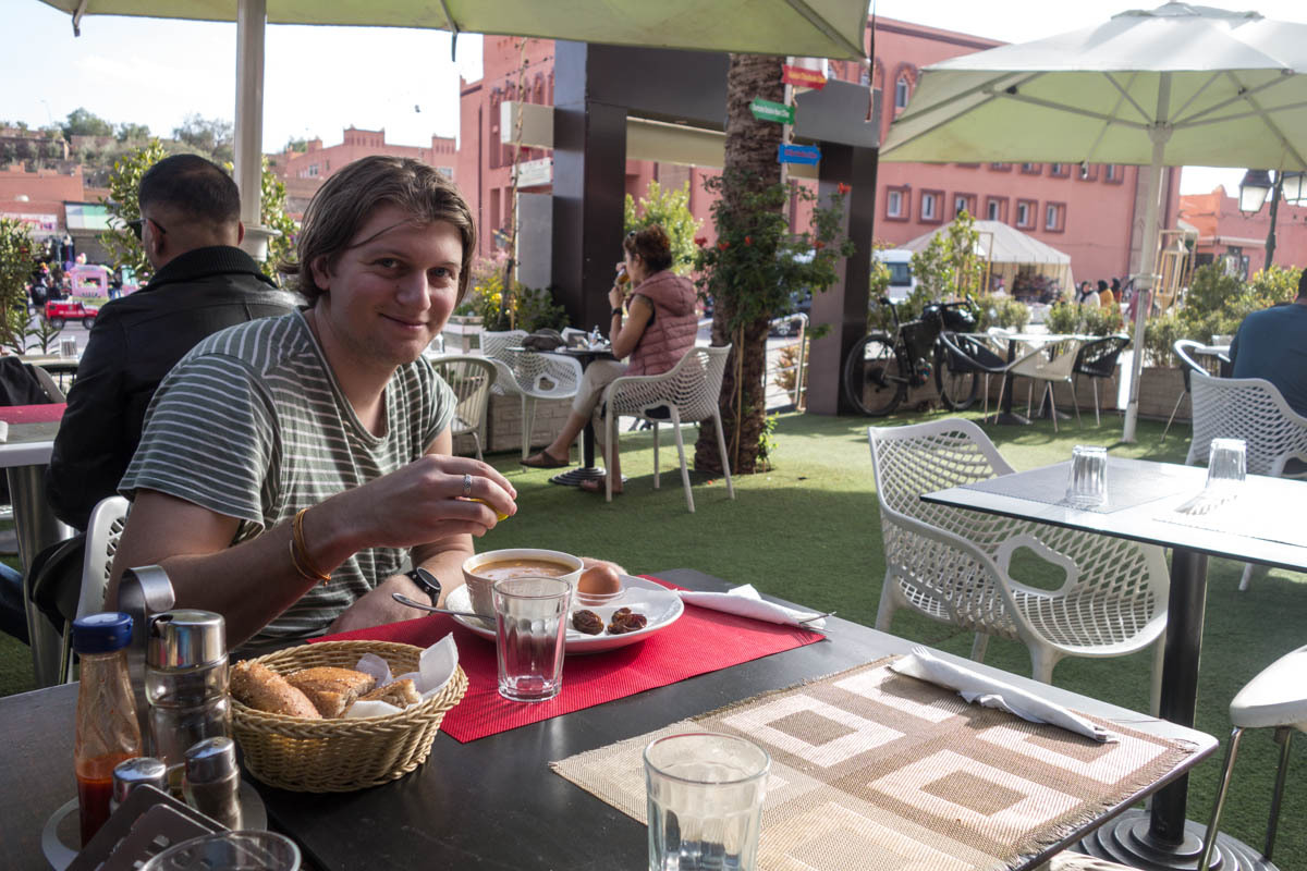 For dinner we make another taxi ride to downtown, first a stop at the Carrefour supermarket for some supplies, then an ATM, then back to the restaurant we ate last night since they had good food. As we sit there we notice a bikepacker guy, he joins us at our table. Xander is from the States and flew over for a seven day, crazy mileage bikepack trip through the desert to Agadir.