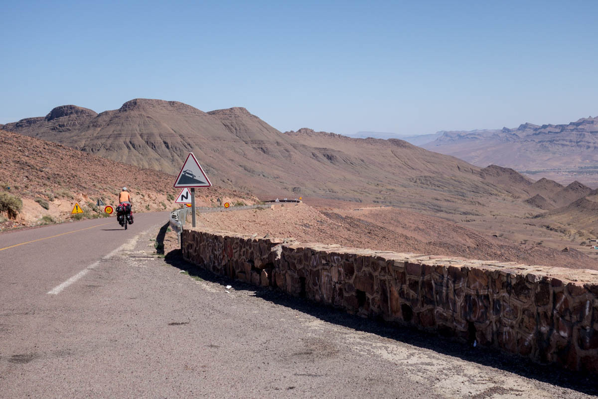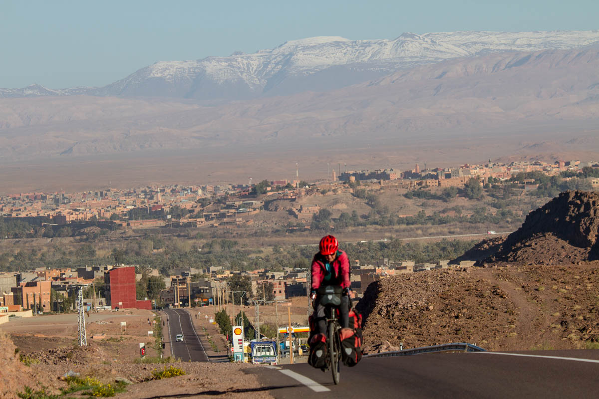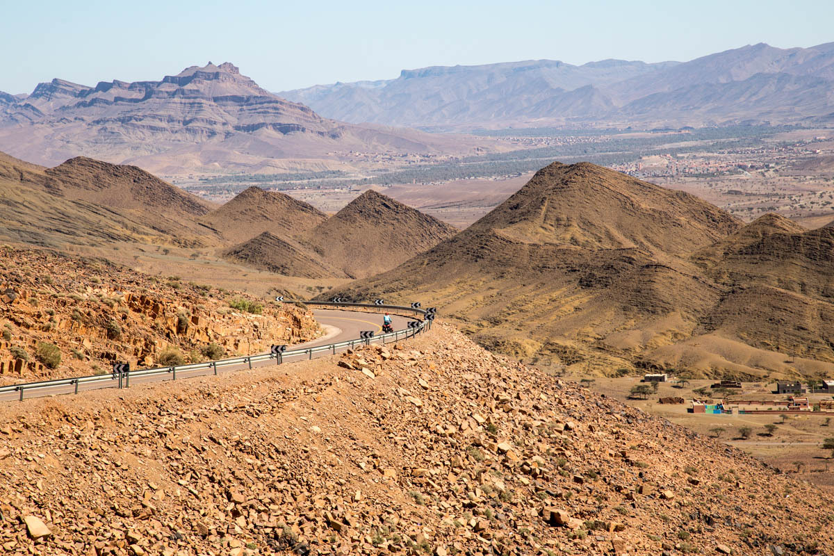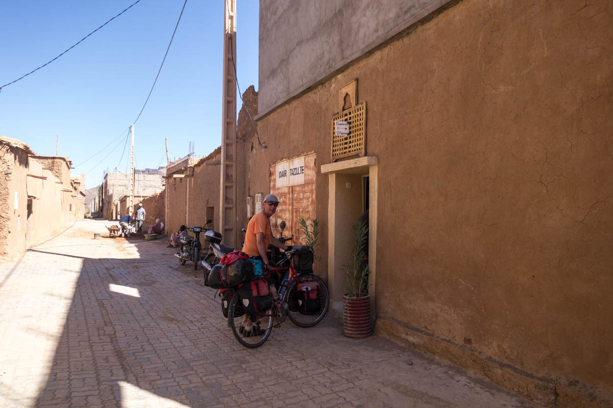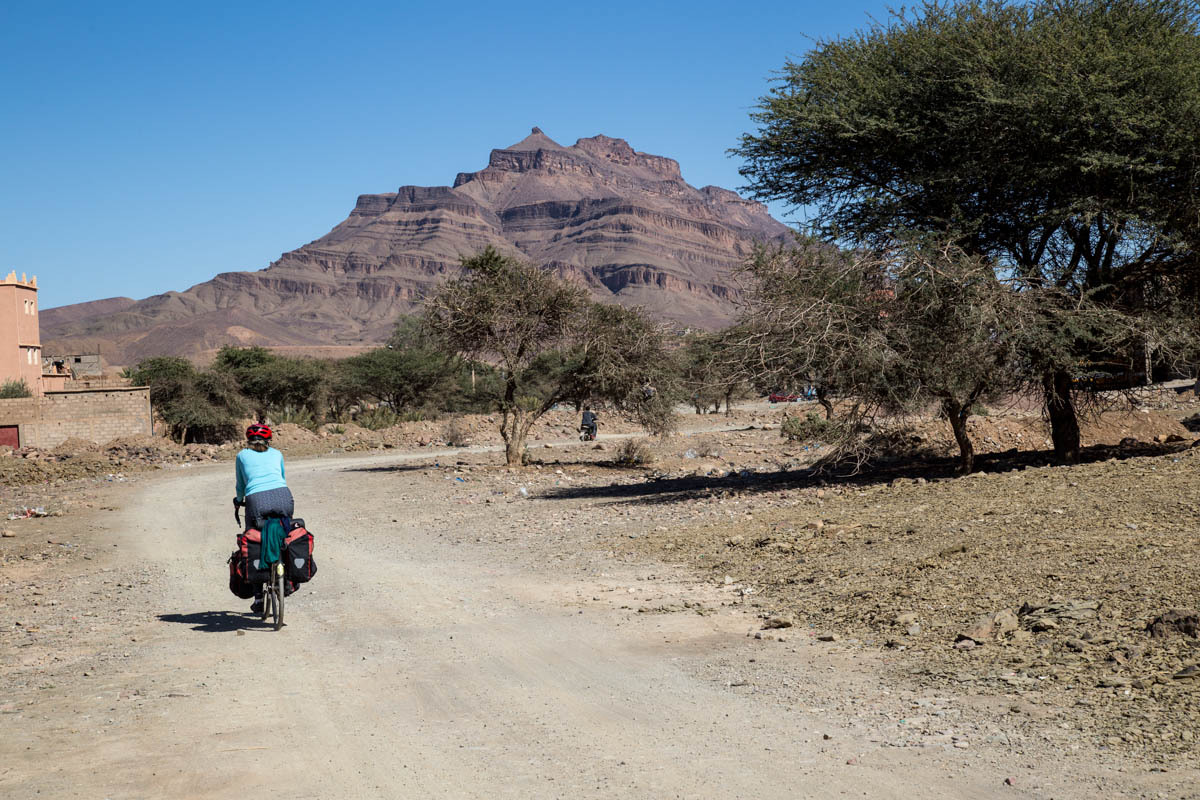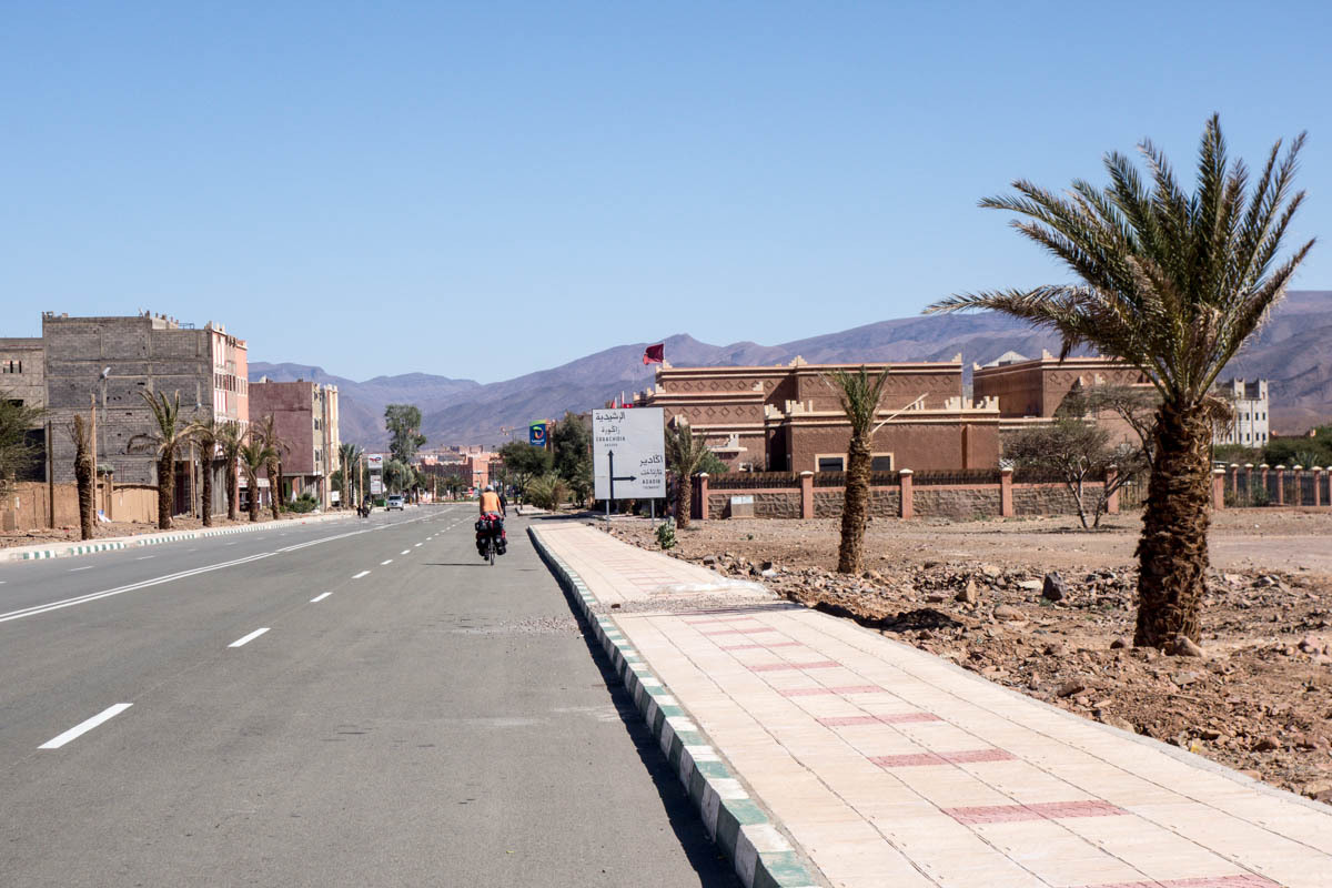 After the break we push up the pass pretty good. At the top there is a great view back to the High Atlas Mountains and during the downhill there are terrific views of craggy canyons and red mountains. The mountain behind Agdz with its typical top that resembles the top of a tagine dish is visible from a long ways. We cruise the 20 km downhill at a pretty good pace. Just before the town we see another cyclists climbing towards us. The tailwind that has been helping us so well today is making his going tough. Again we chat for a while, he’s from Poland.