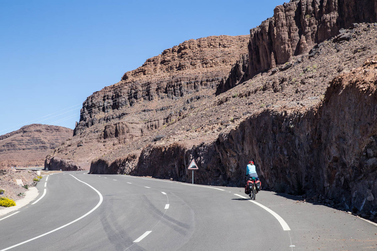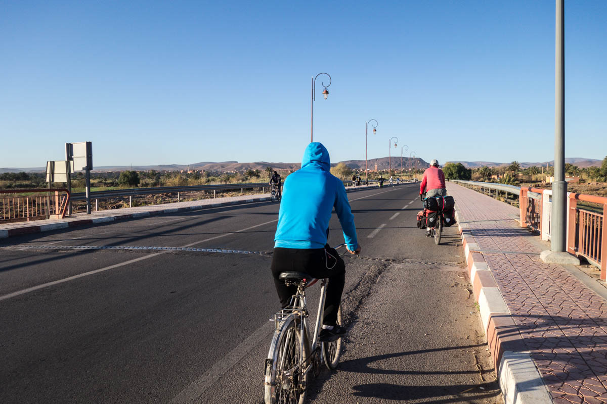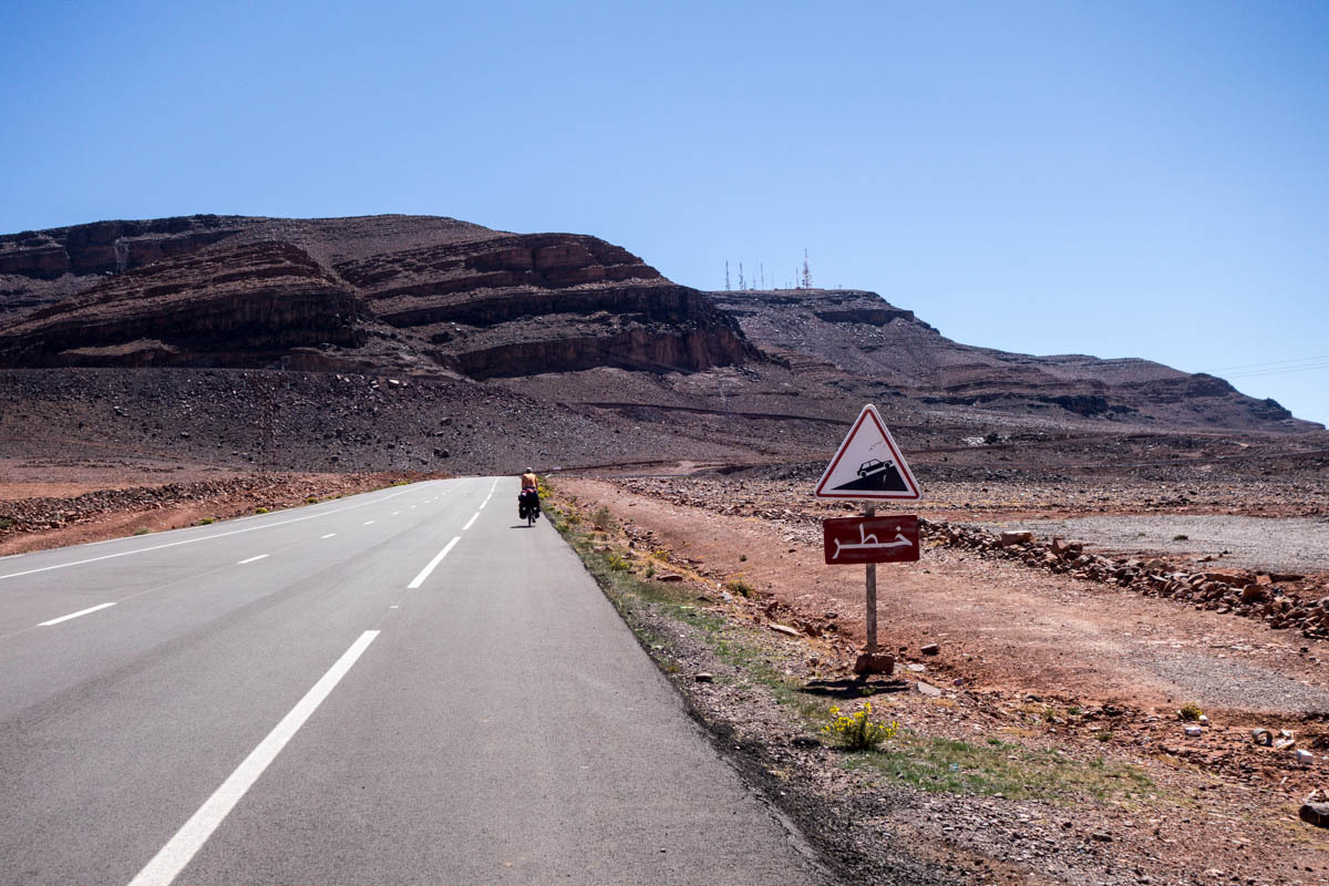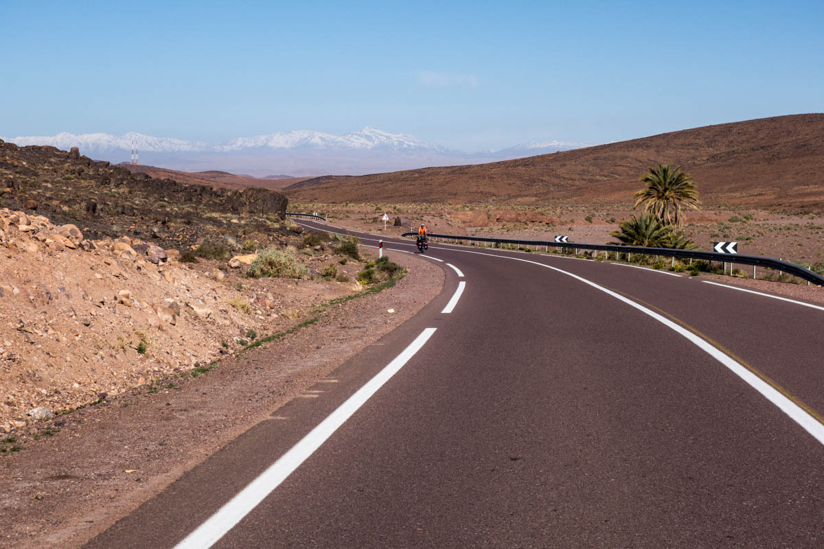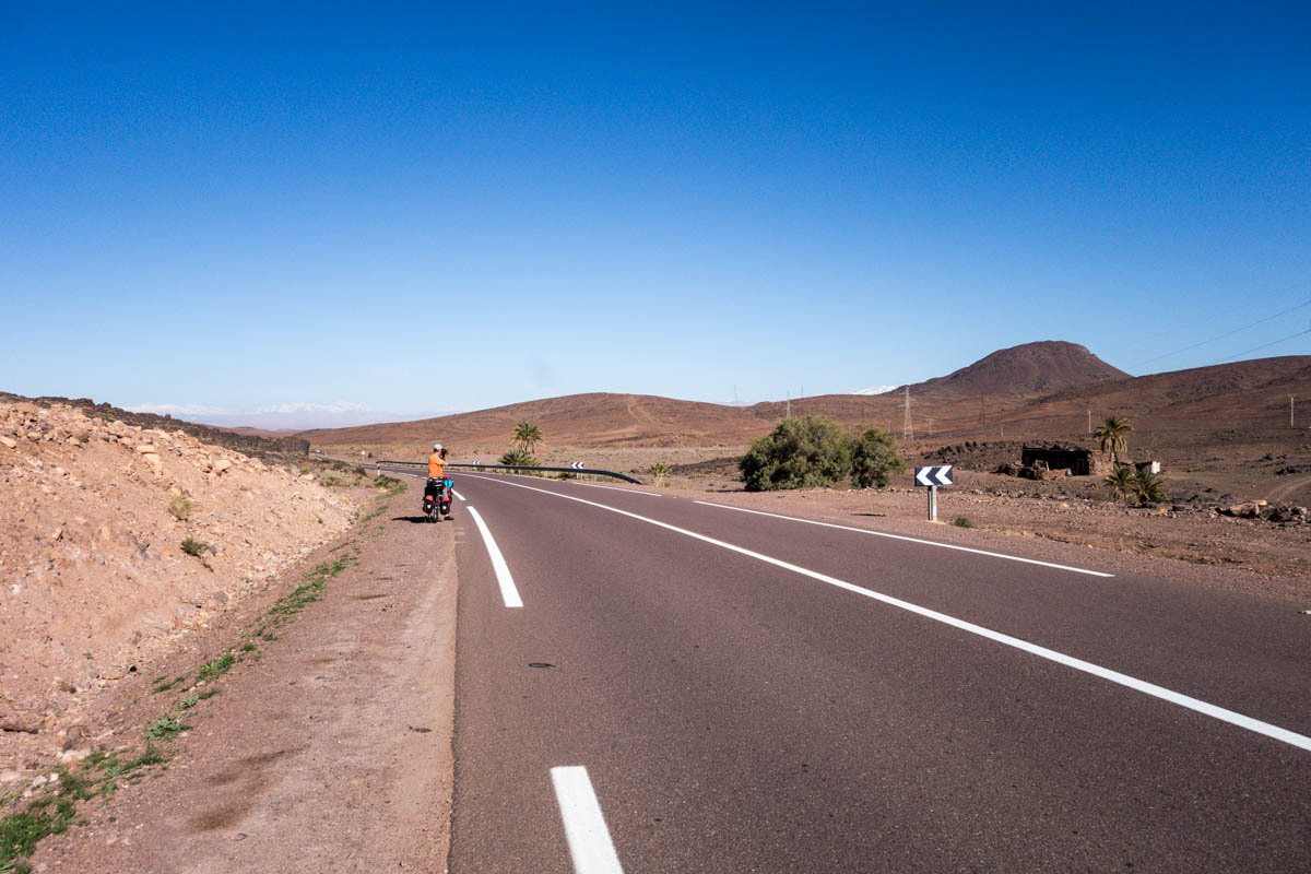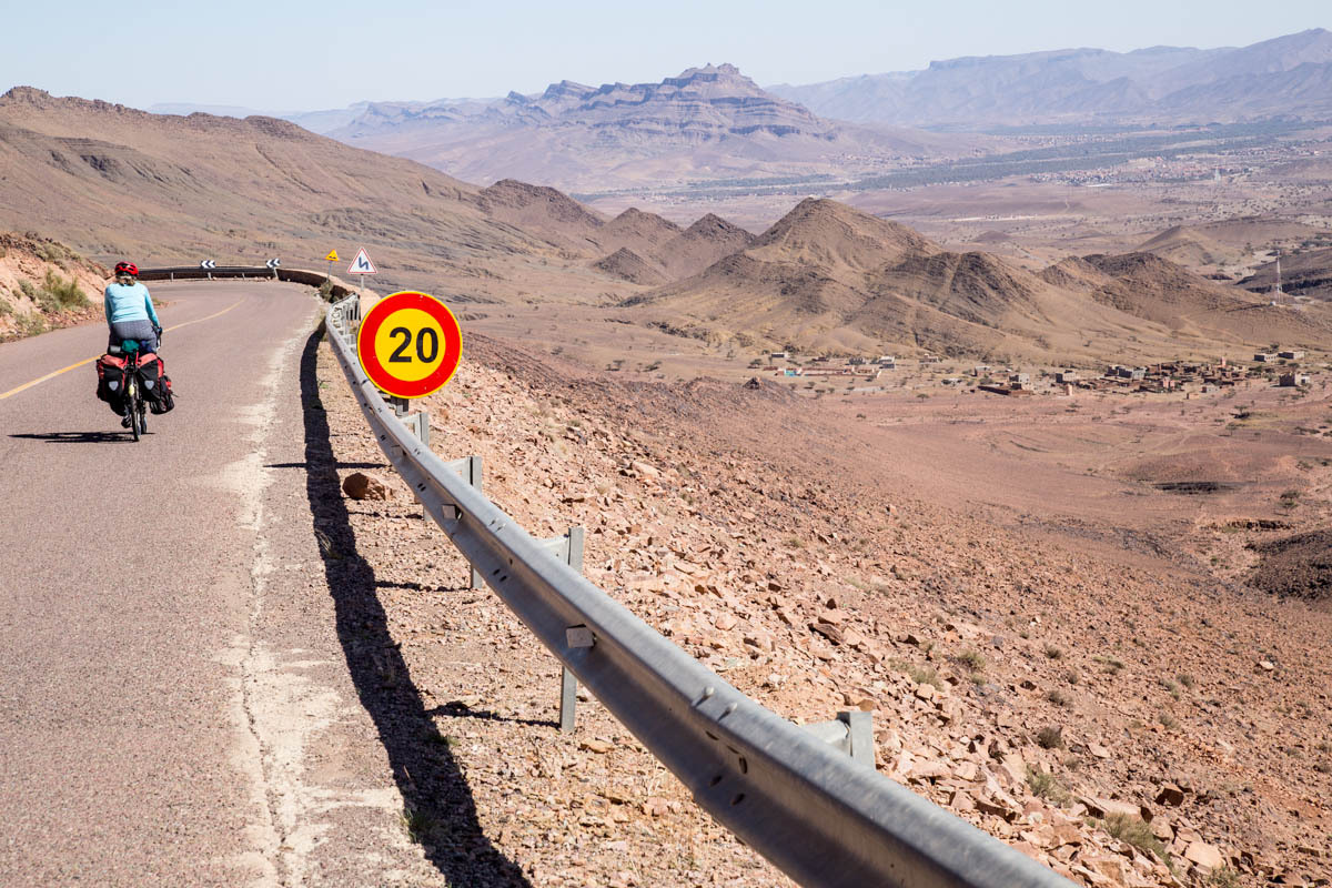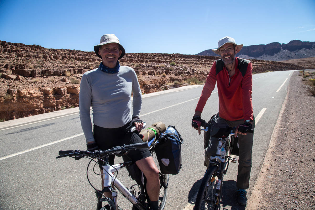 After the break we push up the pass pretty good. At the top there is a great view back to the High Atlas Mountains and during the downhill there are terrific views of craggy canyons and red mountains. The mountain behind Agdz with its typical top that resembles the top of a tagine dish is visible from a long ways. We cruise the 20 km downhill at a pretty good pace. Just before the town we see another cyclists climbing towards us. The tailwind that has been helping us so well today is making his going tough. Again we chat for a while, he’s from Poland.