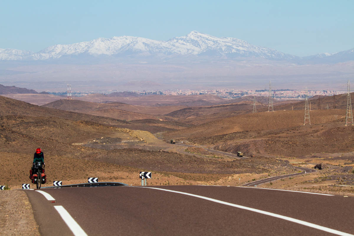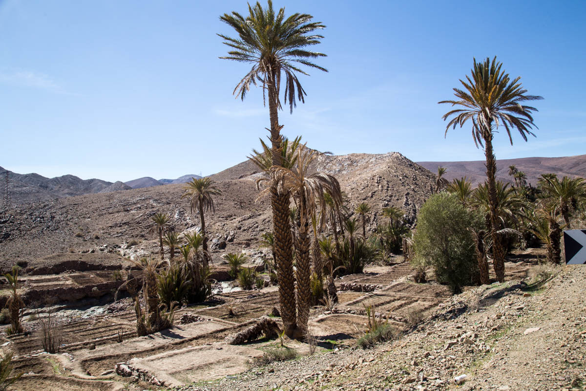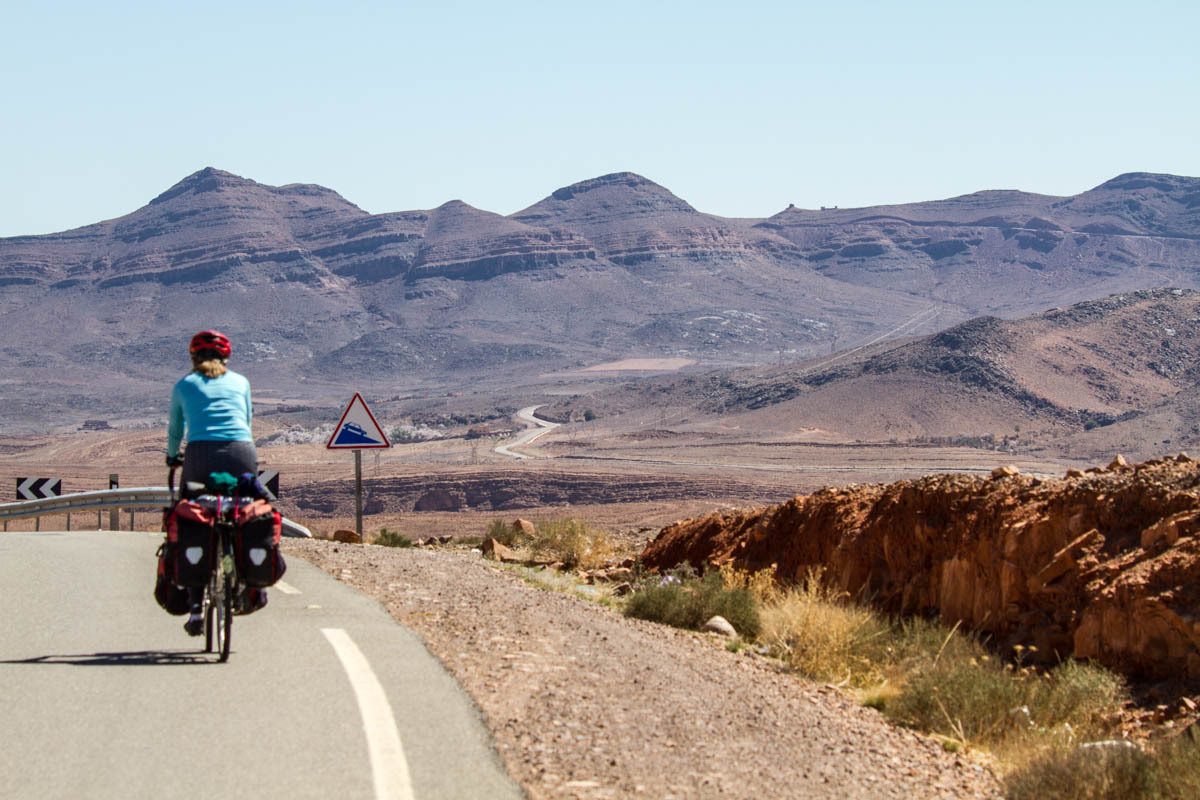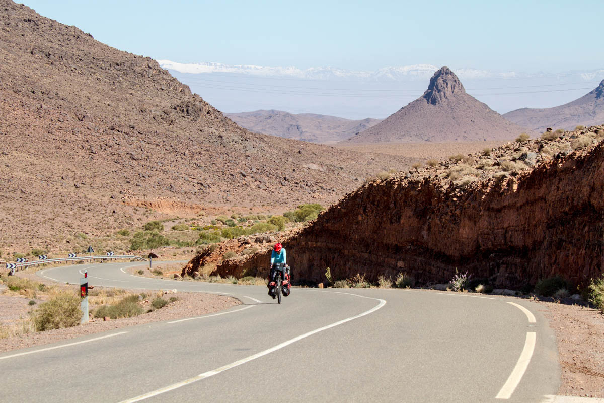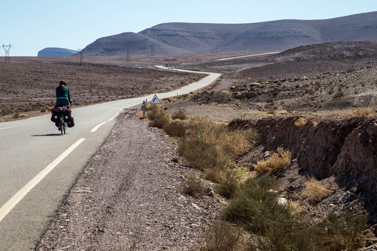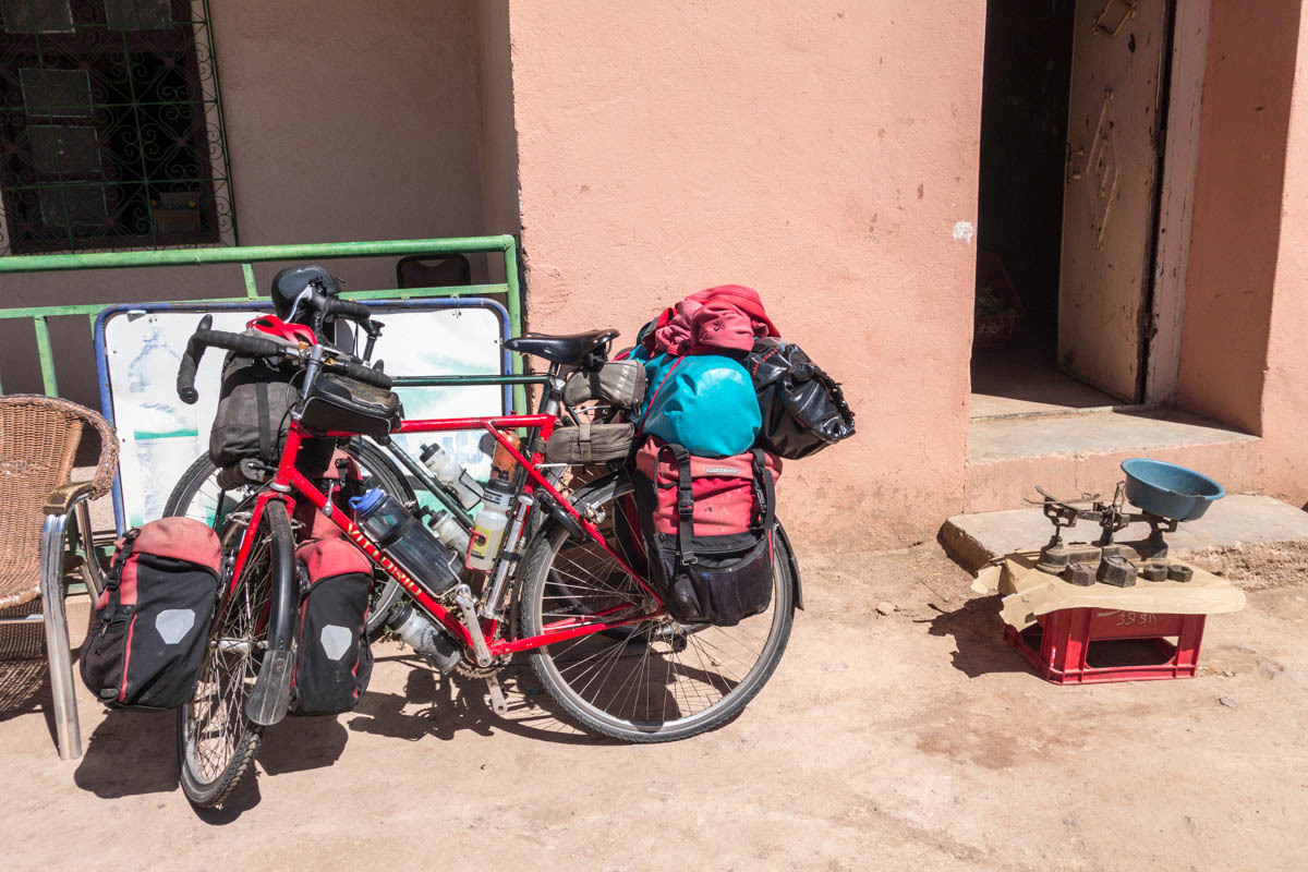 After the break we push up the pass pretty good. At the top there is a great view back to the High Atlas Mountains and during the downhill there are terrific views of craggy canyons and red mountains. The mountain behind Agdz with its typical top that resembles the top of a tagine dish is visible from a long ways. We cruise the 20 km downhill at a pretty good pace. Just before the town we see another cyclists climbing towards us. The tailwind that has been helping us so well today is making his going tough. Again we chat for a while, he’s from Poland.