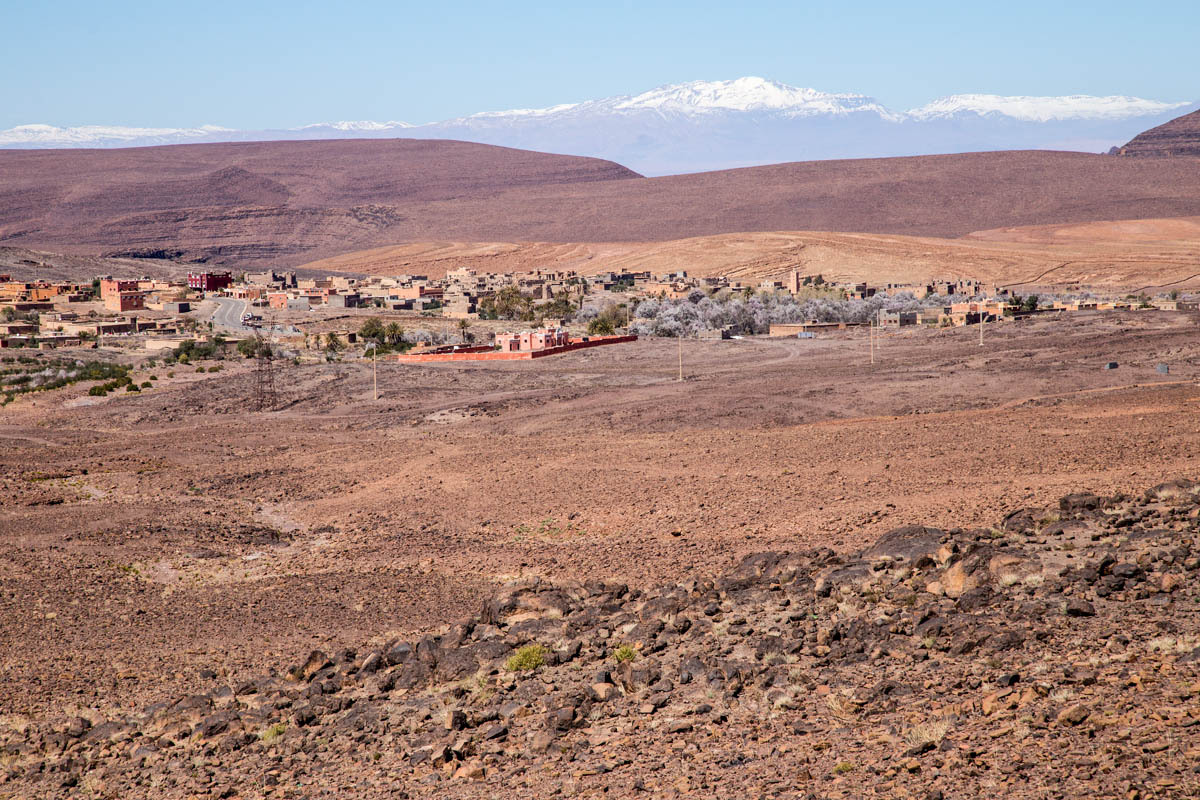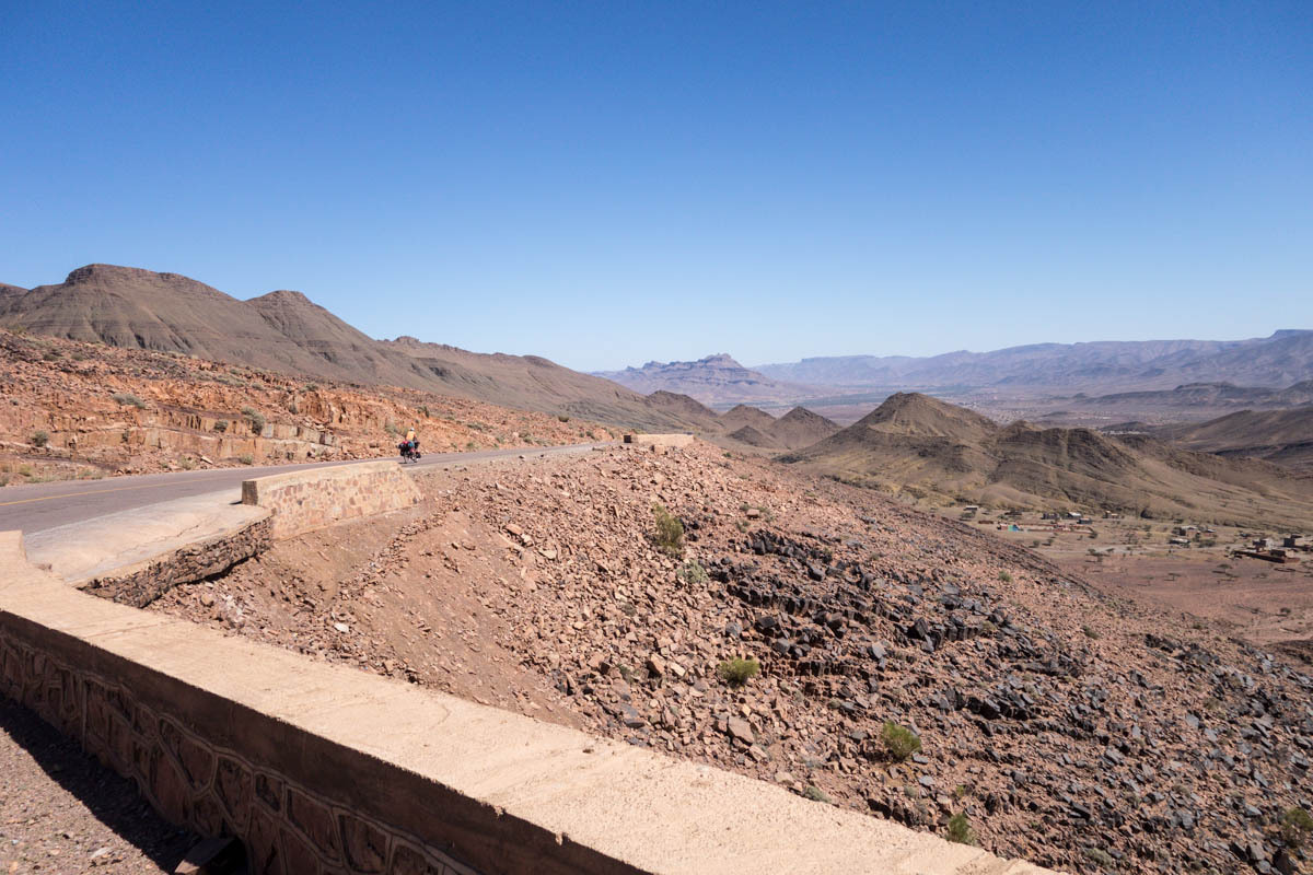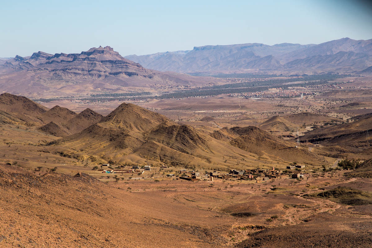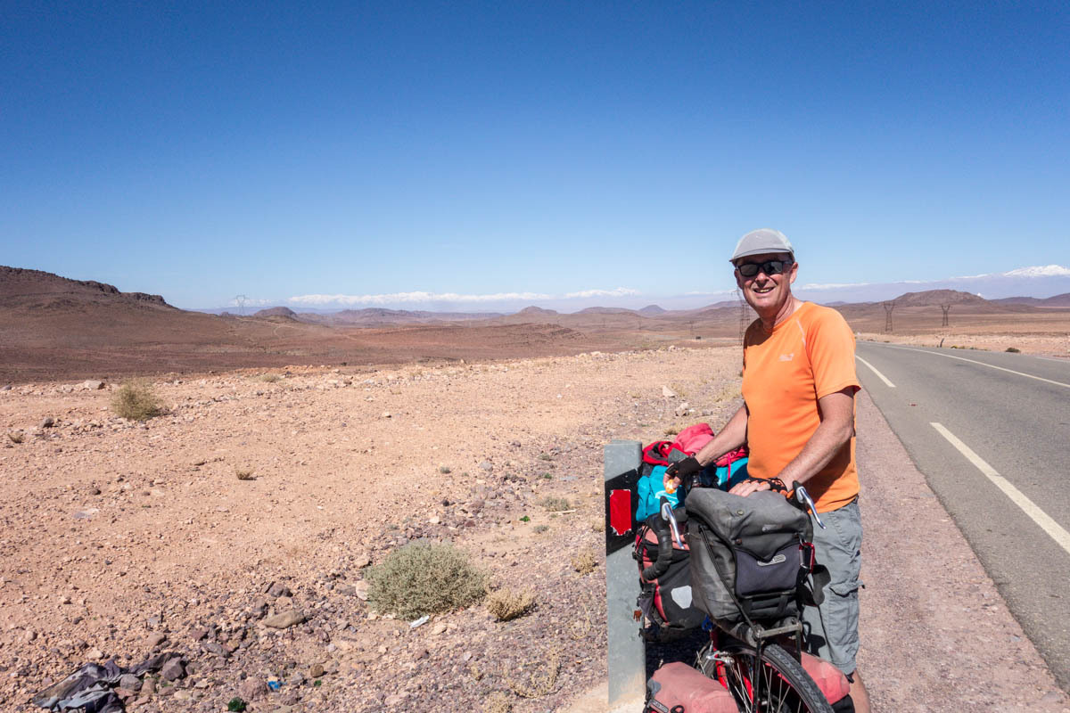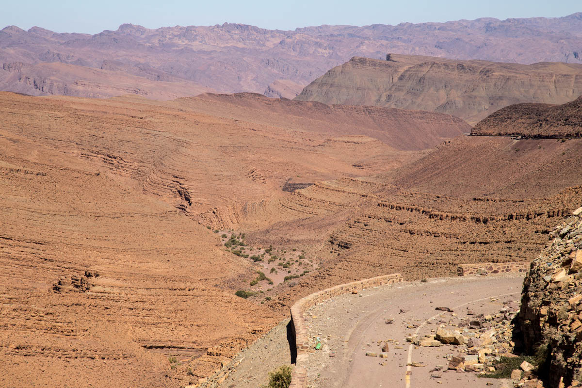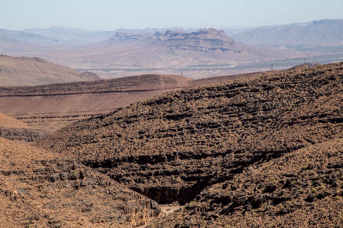 After the break we push up the pass pretty good. At the top there is a great view back to the High Atlas Mountains and during the downhill there are terrific views of craggy canyons and red mountains. The mountain behind Agdz with its typical top that resembles the top of a tagine dish is visible from a long ways. We cruise the 20 km downhill at a pretty good pace. Just before the town we see another cyclists climbing towards us. The tailwind that has been helping us so well today is making his going tough. Again we chat for a while, he’s from Poland.