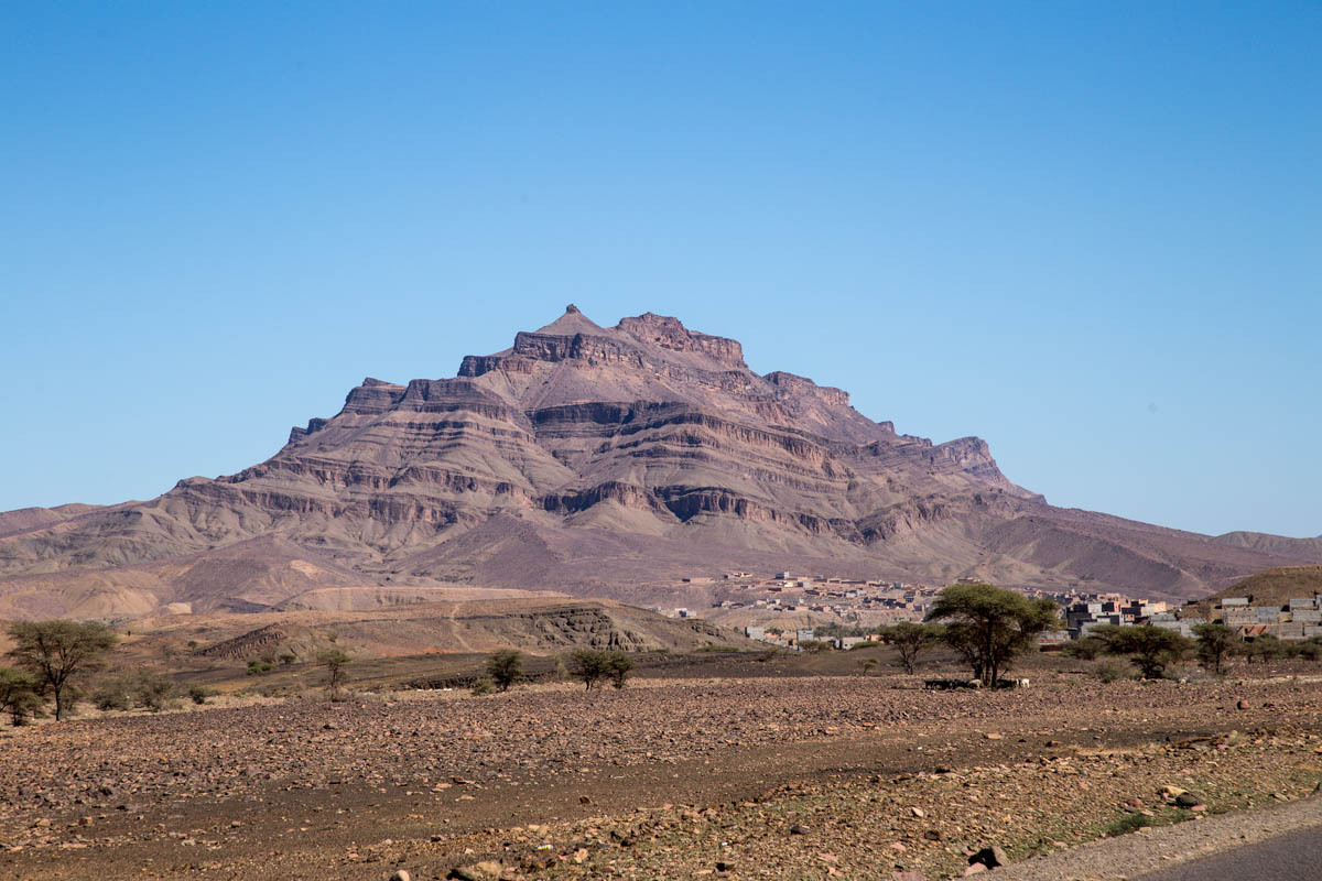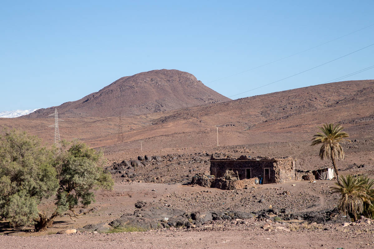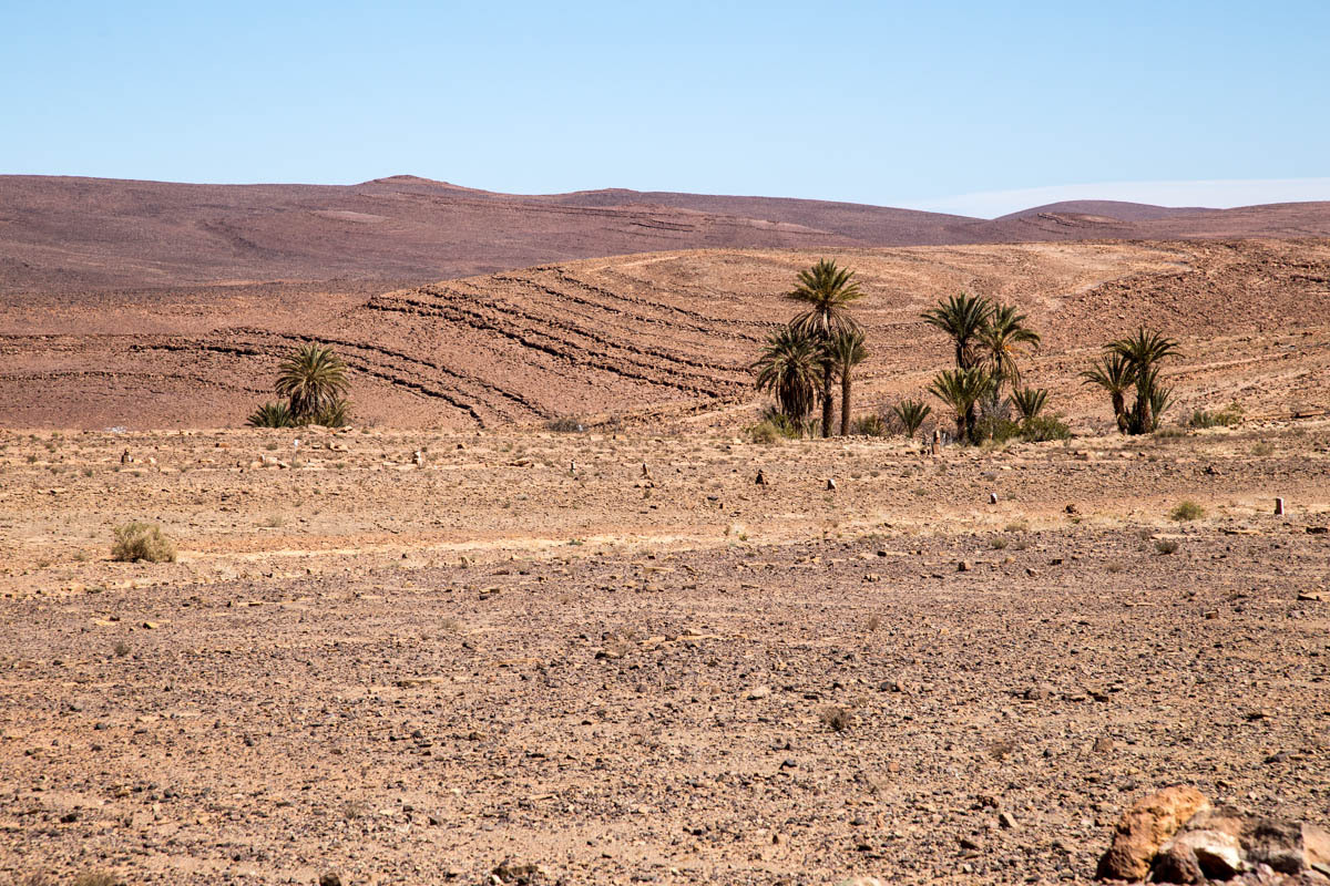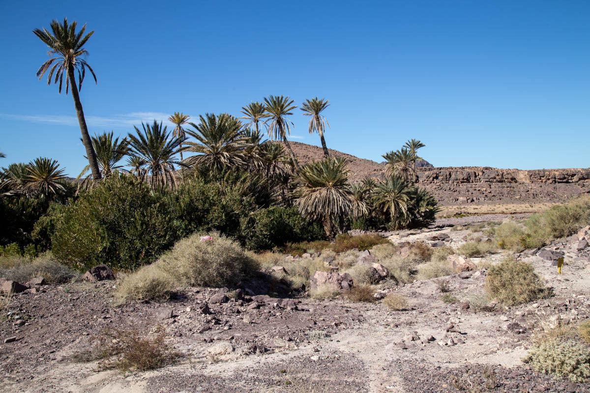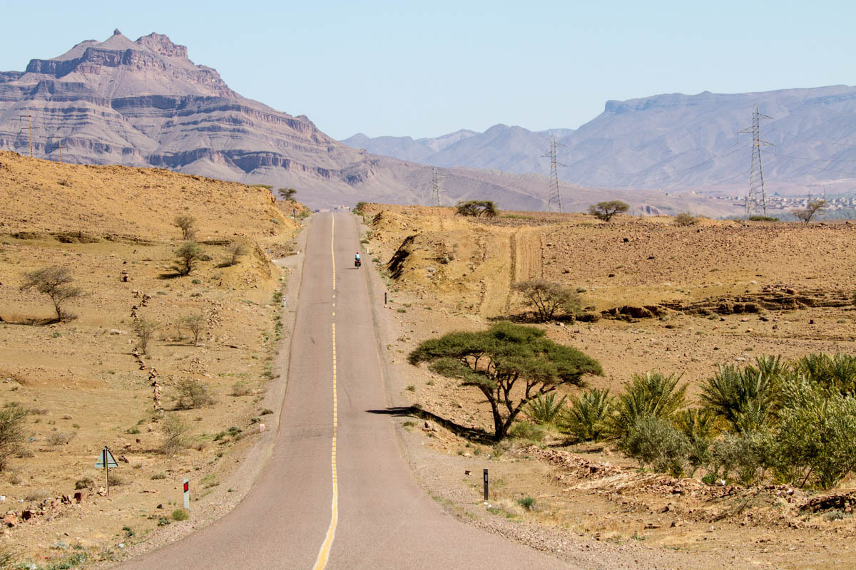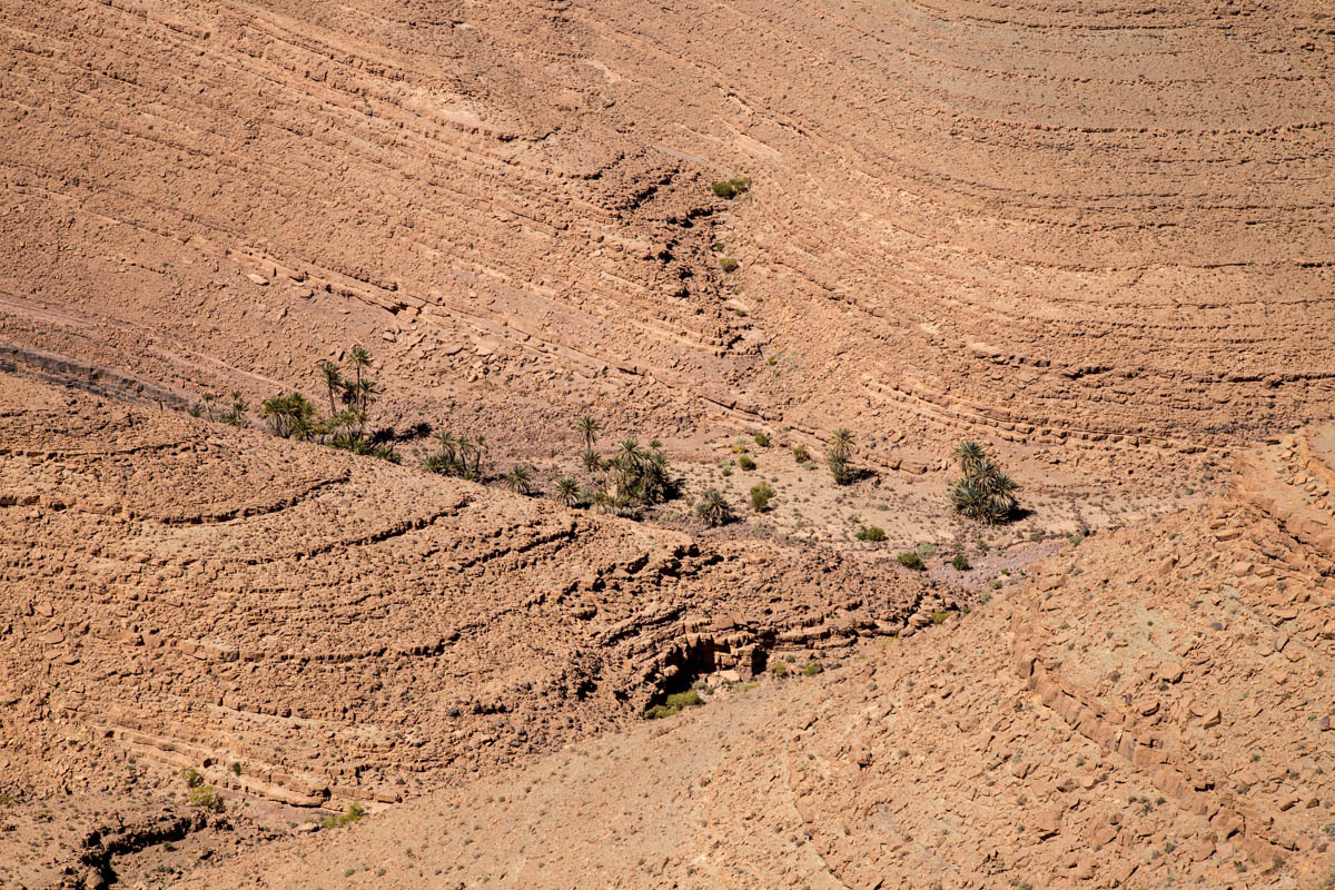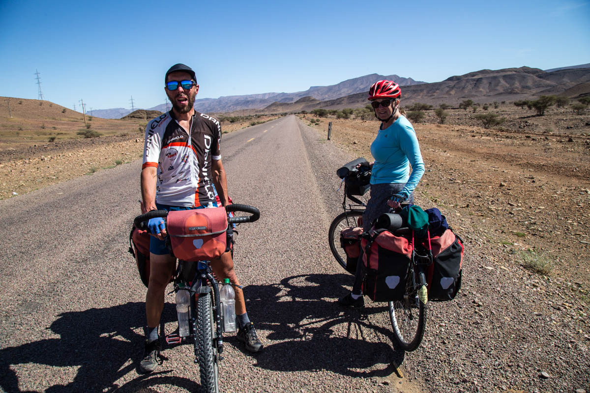 After the break we push up the pass pretty good. At the top there is a great view back to the High Atlas Mountains and during the downhill there are terrific views of craggy canyons and red mountains. The mountain behind Agdz with its typical top that resembles the top of a tagine dish is visible from a long ways. We cruise the 20 km downhill at a pretty good pace. Just before the town we see another cyclists climbing towards us. The tailwind that has been helping us so well today is making his going tough. Again we chat for a while, he’s from Poland.