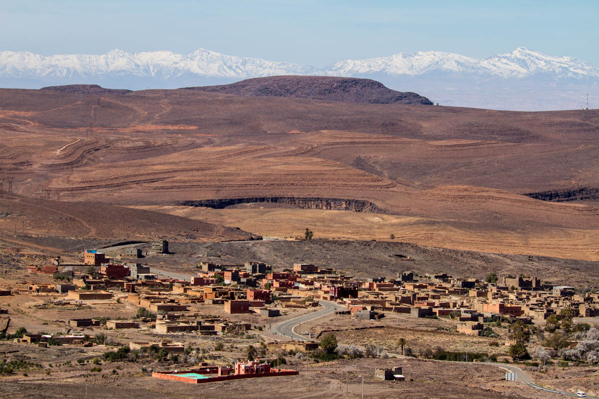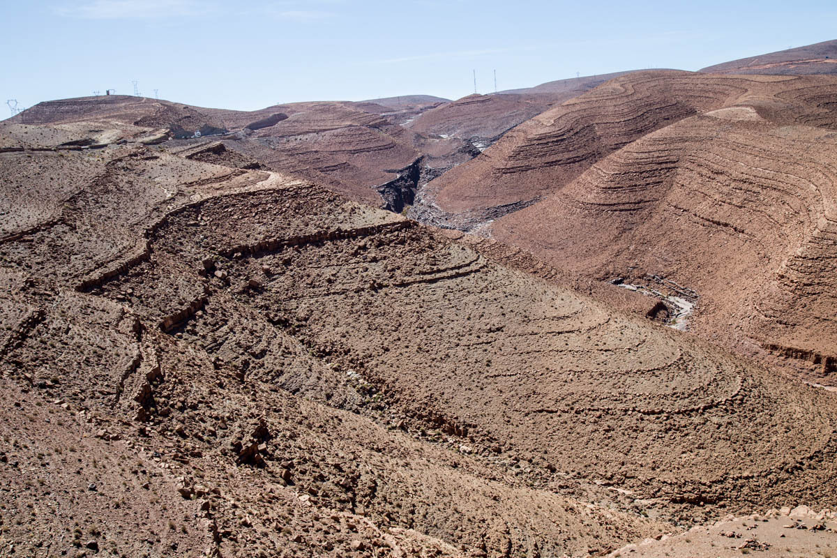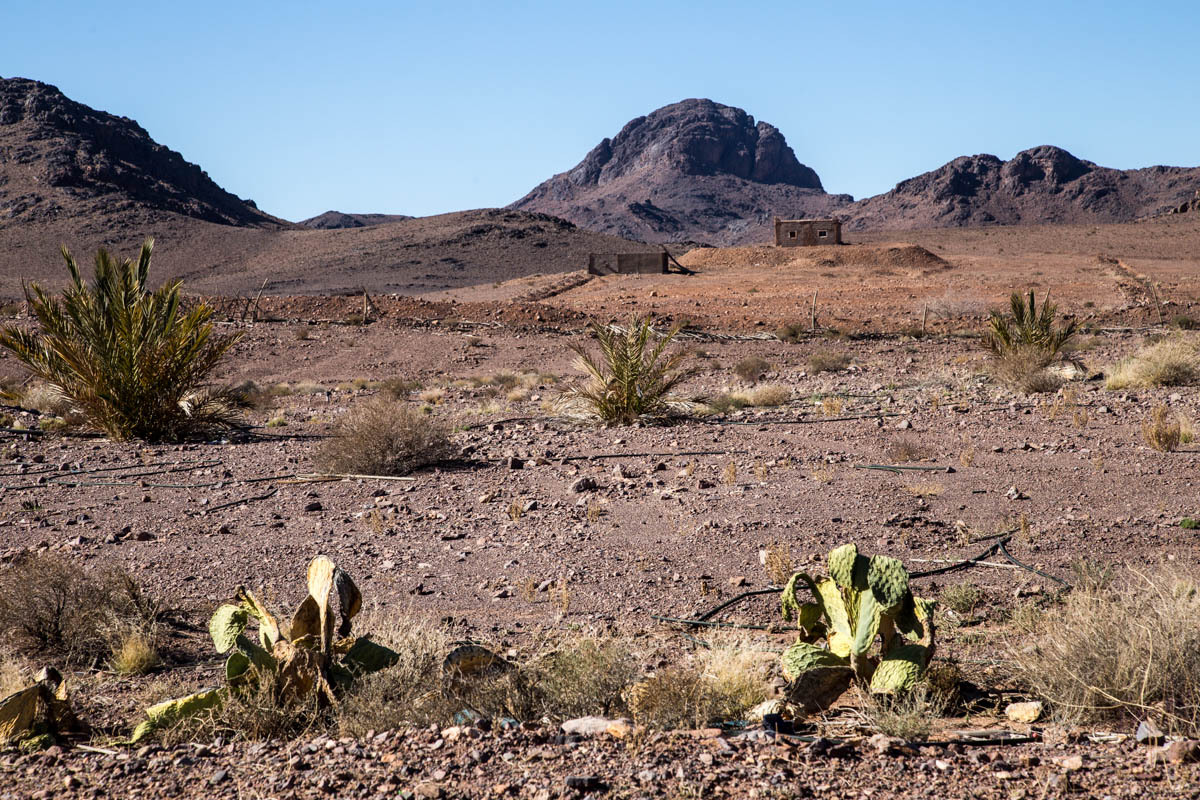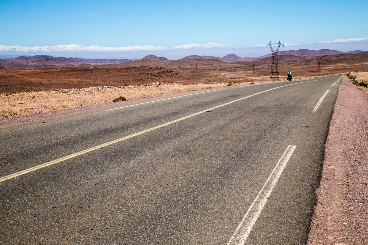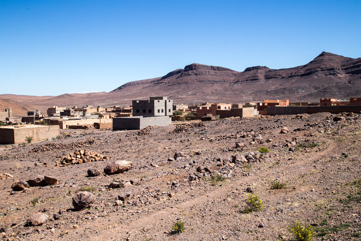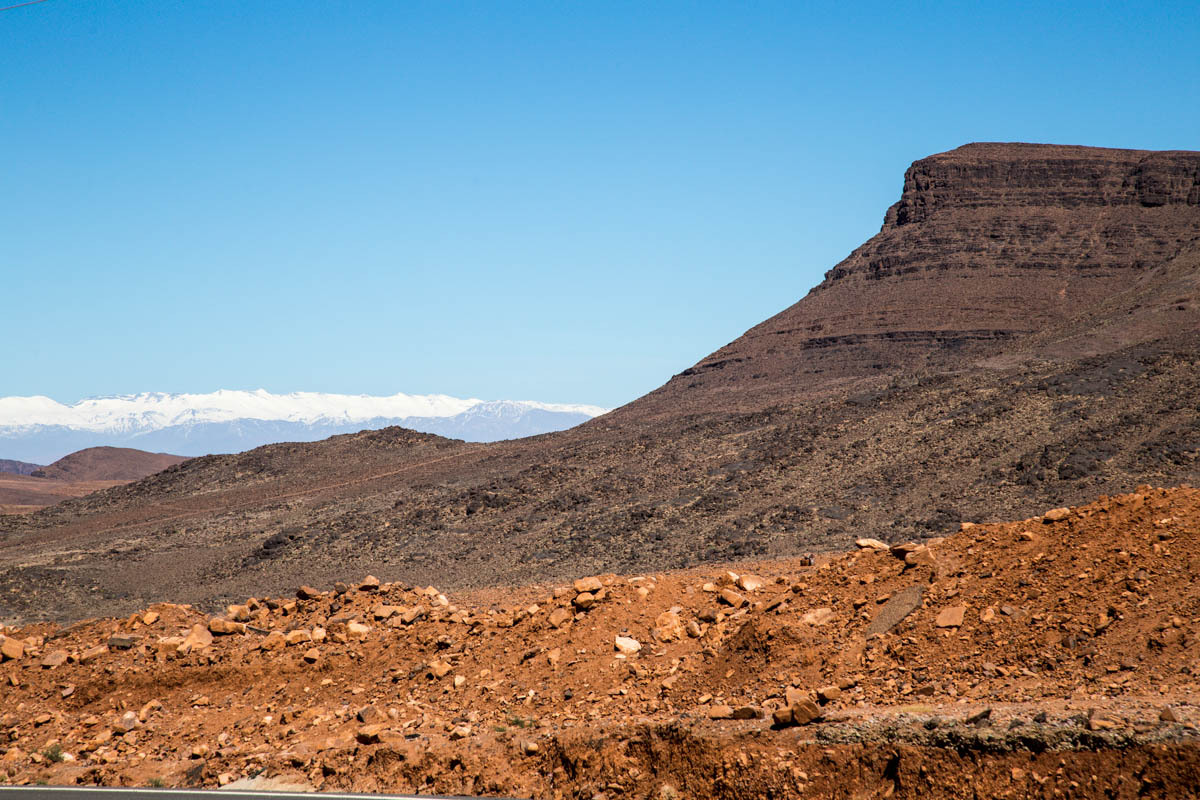 After the break we push up the pass pretty good. At the top there is a great view back to the High Atlas Mountains and during the downhill there are terrific views of craggy canyons and red mountains. The mountain behind Agdz with its typical top that resembles the top of a tagine dish is visible from a long ways. We cruise the 20 km downhill at a pretty good pace. Just before the town we see another cyclists climbing towards us. The tailwind that has been helping us so well today is making his going tough. Again we chat for a while, he’s from Poland.