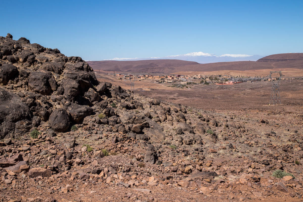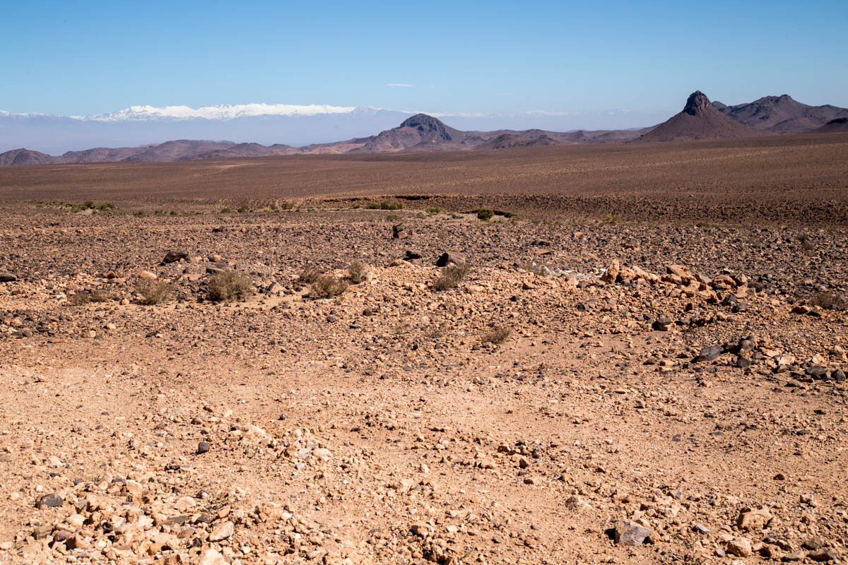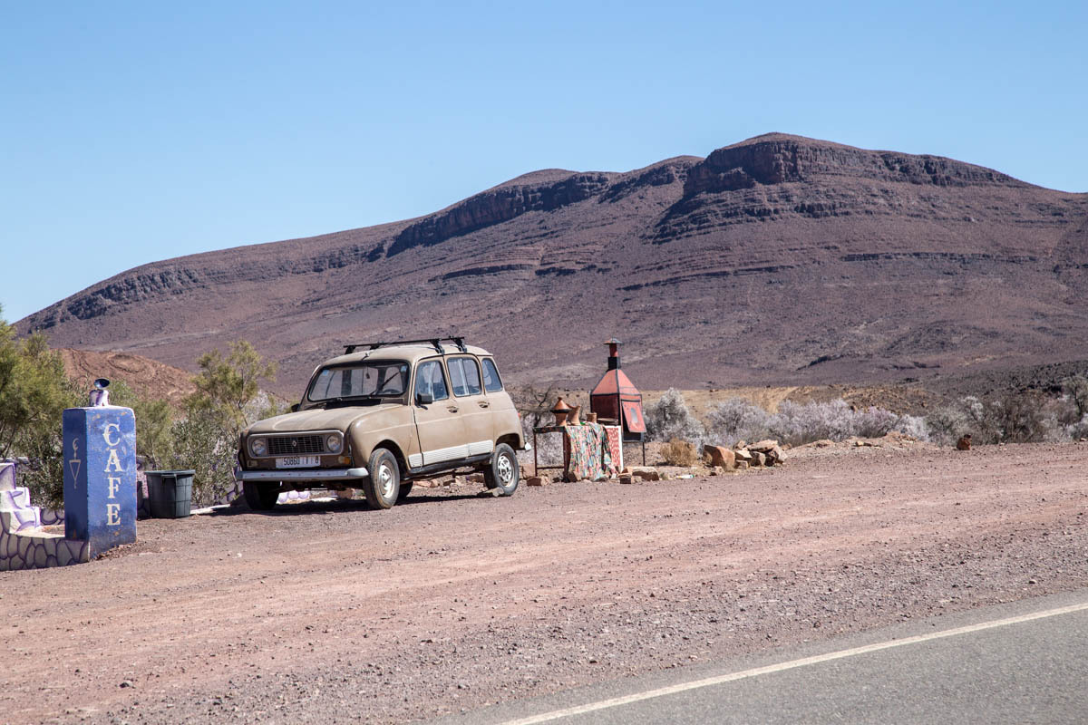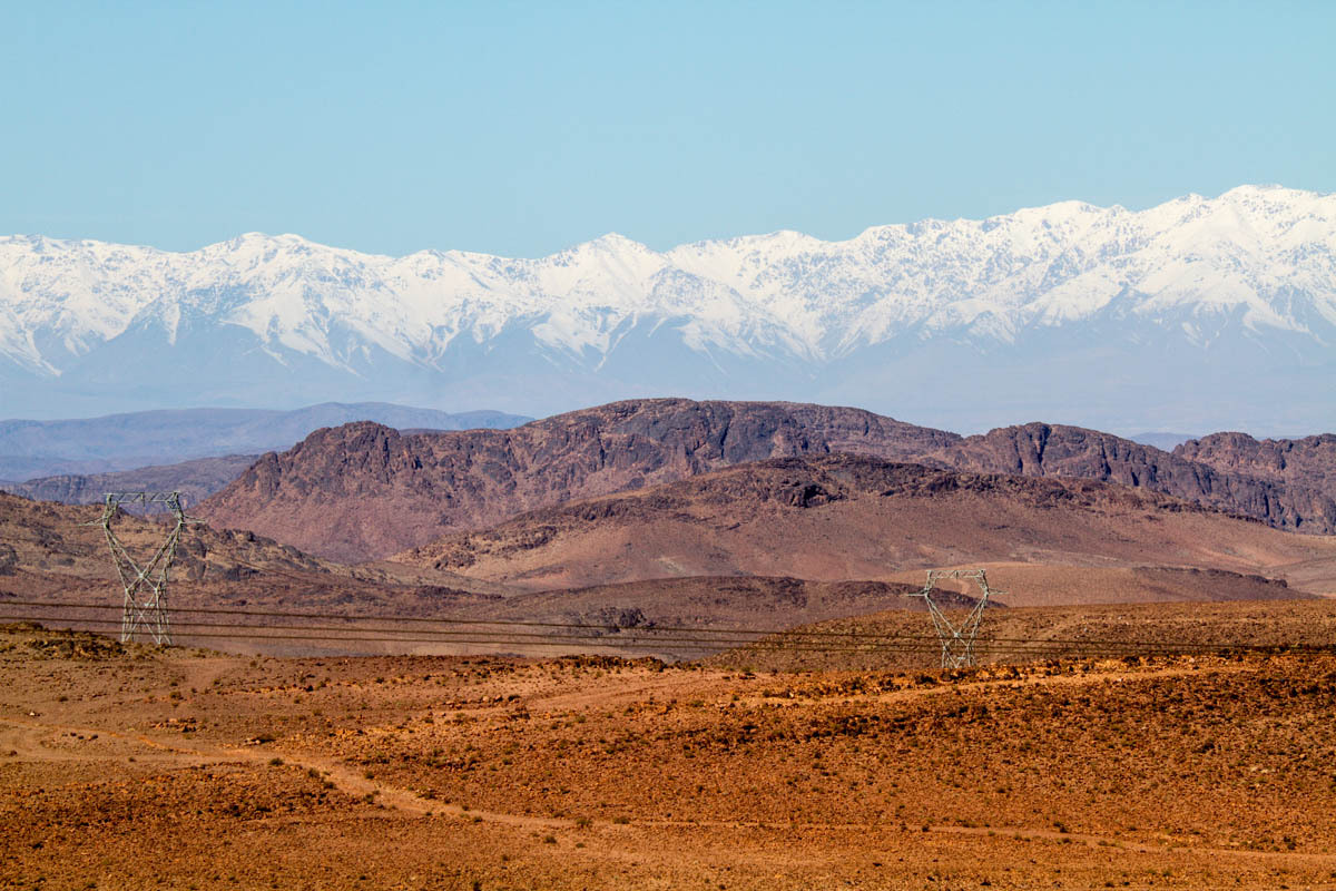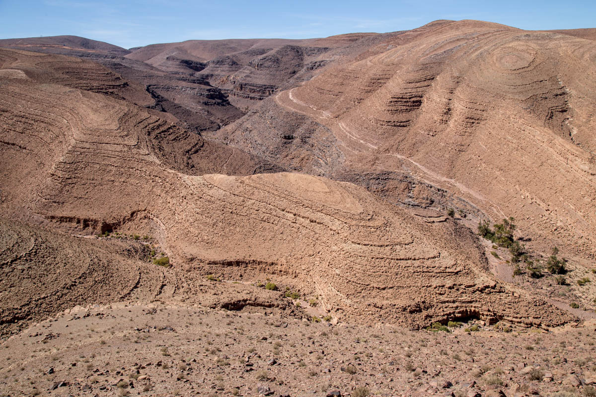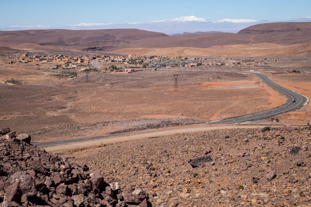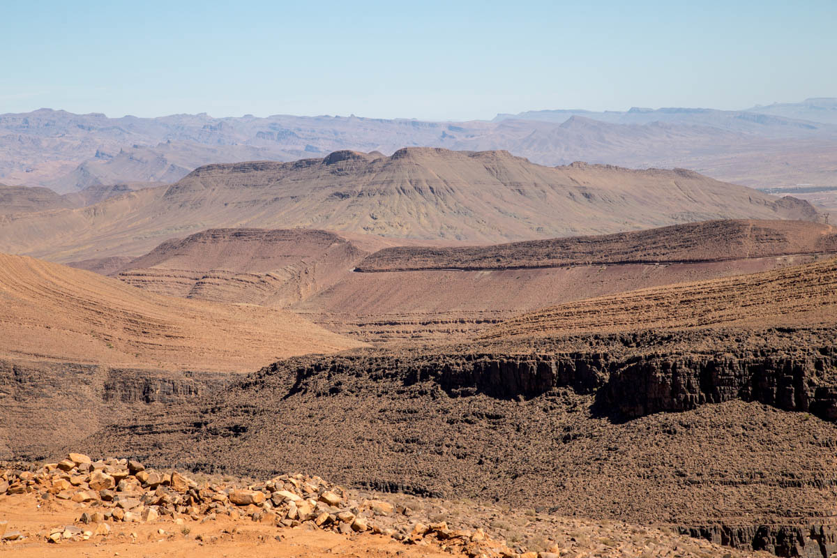 After the break we push up the pass pretty good. At the top there is a great view back to the High Atlas Mountains and during the downhill there are terrific views of craggy canyons and red mountains. The mountain behind Agdz with its typical top that resembles the top of a tagine dish is visible from a long ways. We cruise the 20 km downhill at a pretty good pace. Just before the town we see another cyclists climbing towards us. The tailwind that has been helping us so well today is making his going tough. Again we chat for a while, he’s from Poland.