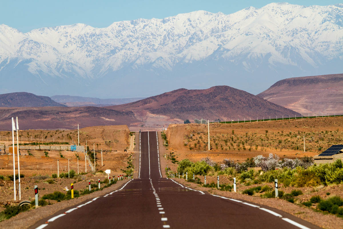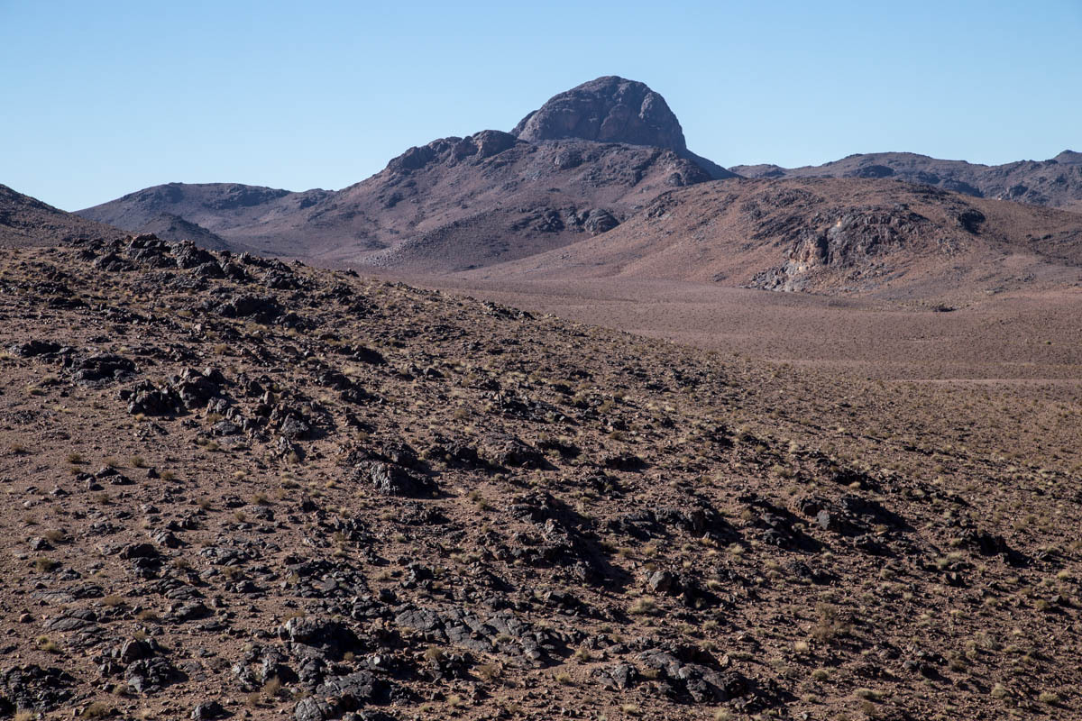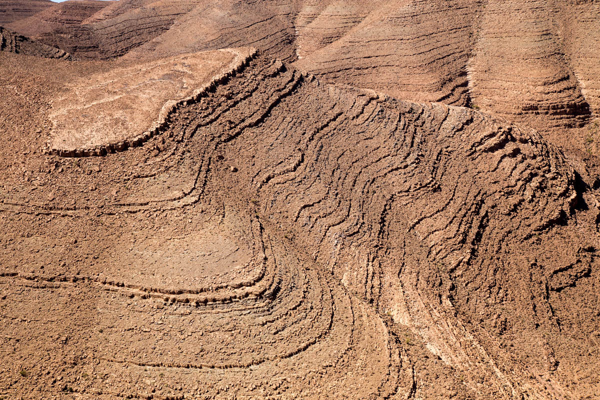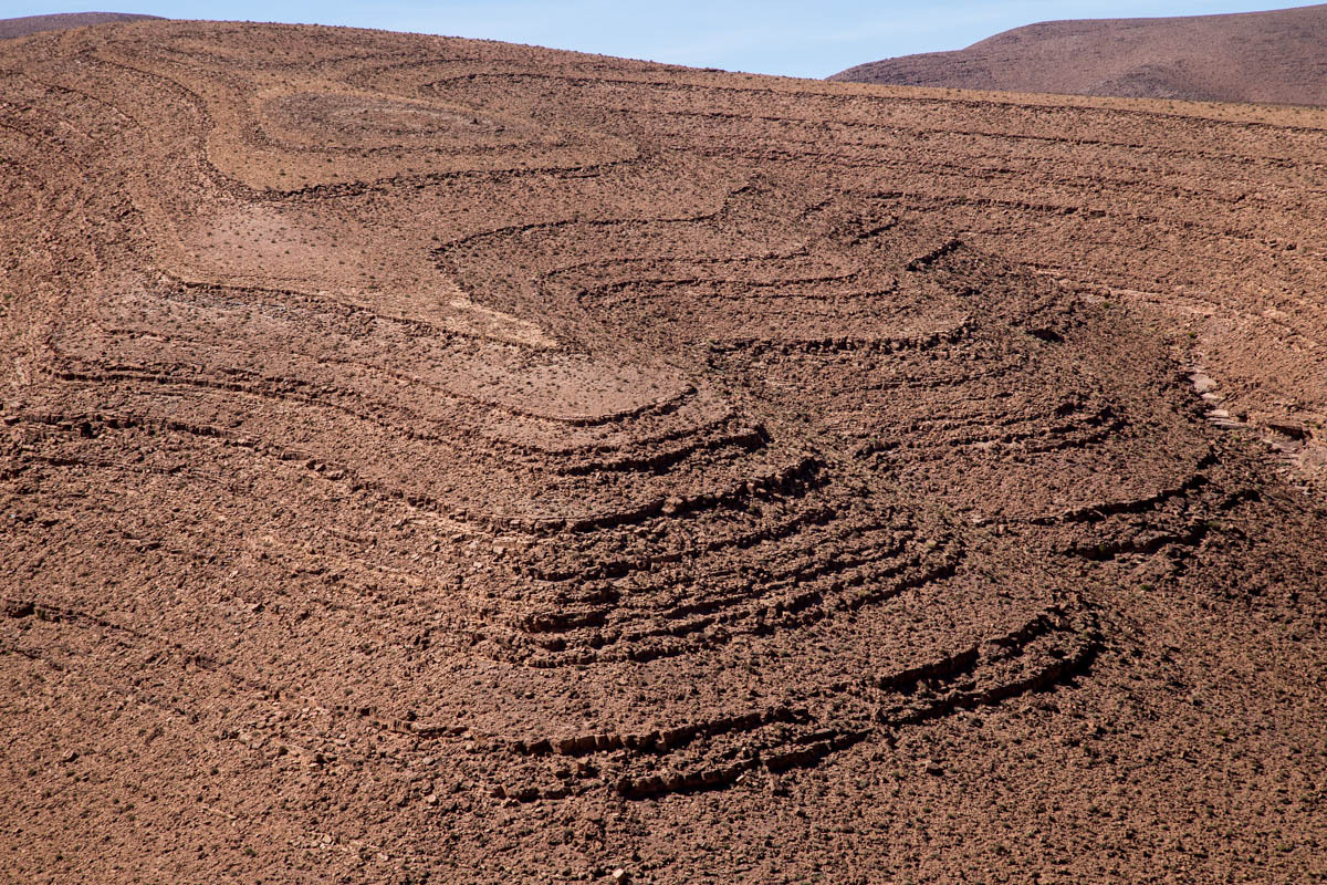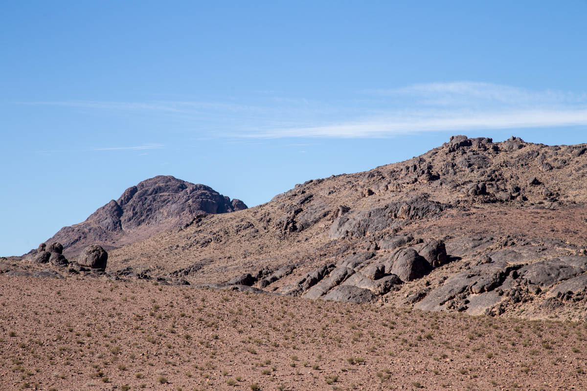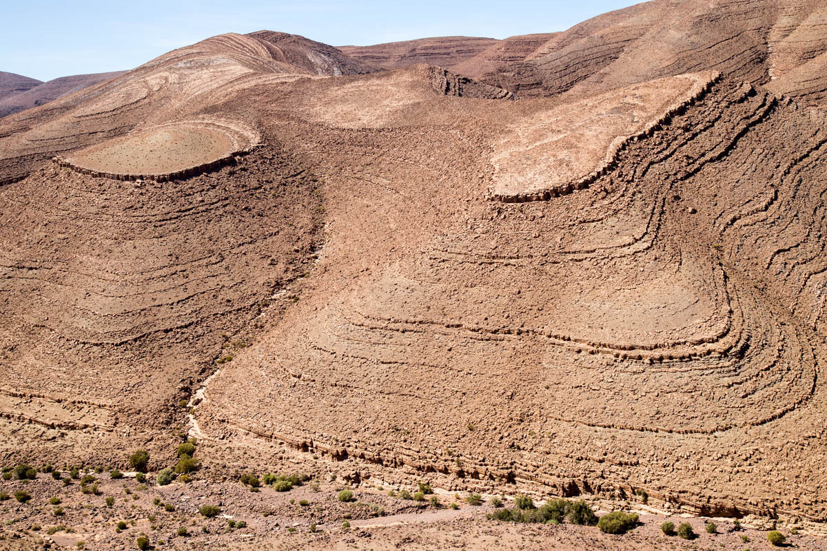 After the break we push up the pass pretty good. At the top there is a great view back to the High Atlas Mountains and during the downhill there are terrific views of craggy canyons and red mountains. The mountain behind Agdz with its typical top that resembles the top of a tagine dish is visible from a long ways. We cruise the 20 km downhill at a pretty good pace. Just before the town we see another cyclists climbing towards us. The tailwind that has been helping us so well today is making his going tough. Again we chat for a while, he’s from Poland.