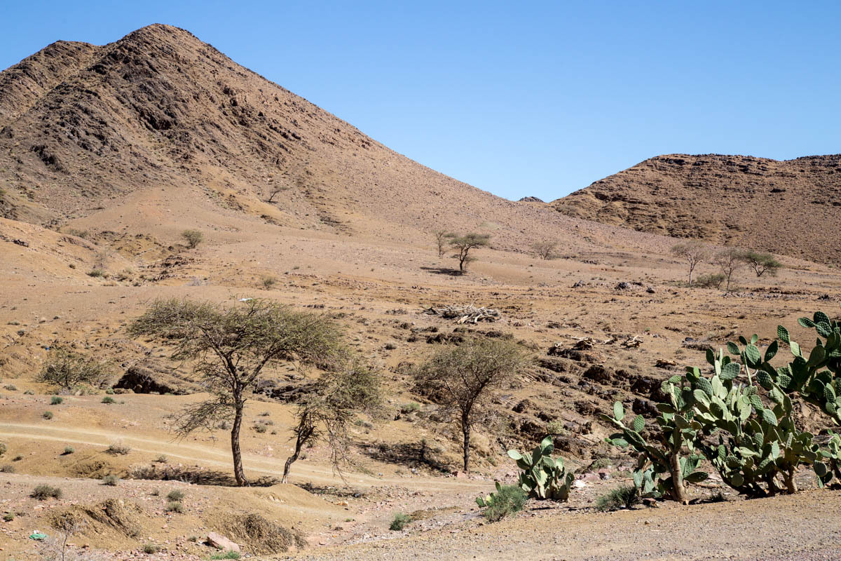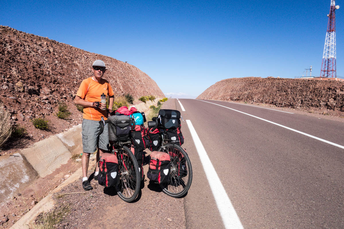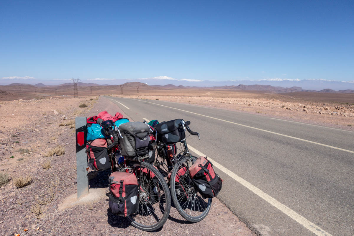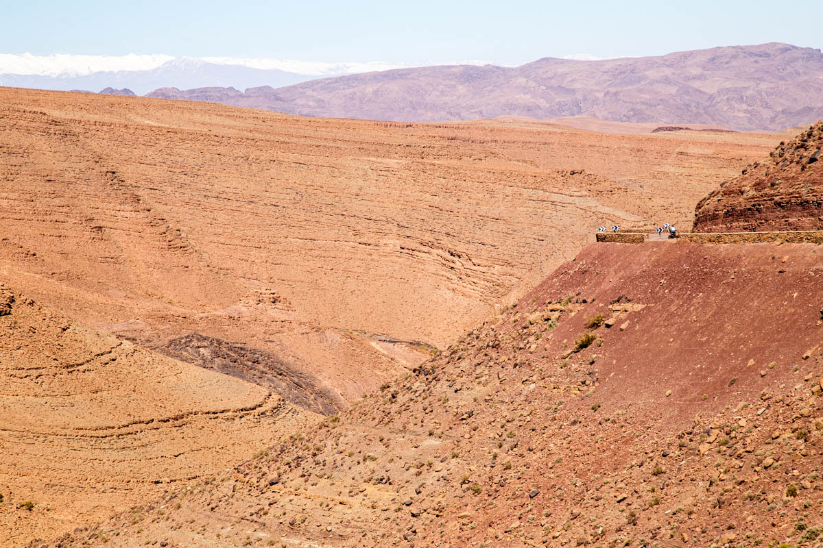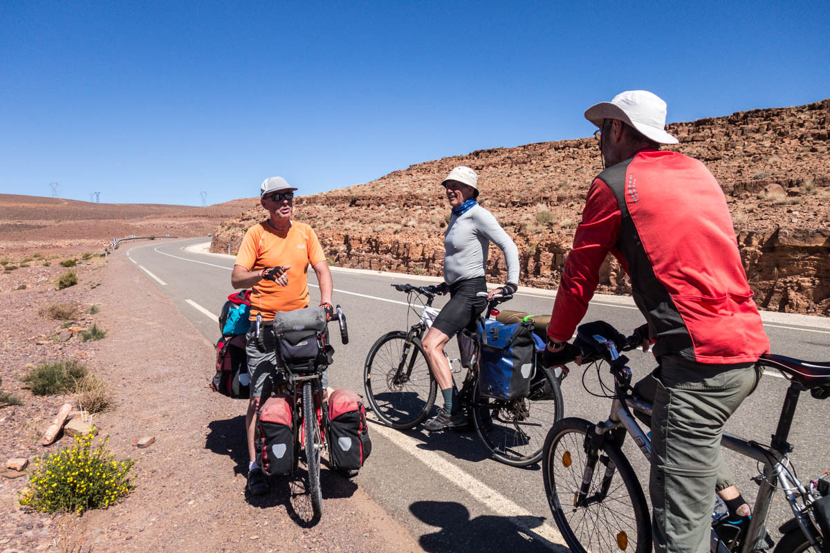 After an initial steep section it flattens out a bit, but we have about 1100 meters of climbing today, all this to gain about 500 meters to the high point at Tizi’n Tinafifft. This means we’ll climb and loose altitude. At about 35km we reach a false pass (we were expecting it) and start a downhill to a small town. Behind it we can see the road form a huge hairpin up the mountain range. Halfway down we meet two cyclists from Austria, Thomas and Wolfgang. We chat for a while. At the bottom of the last climb we stop at a café for a rest. We buy some small bottles of Fanta, but as we start eating our own bread and cheese the guy quickly brings us plates and glasses and a small bin for the trash.