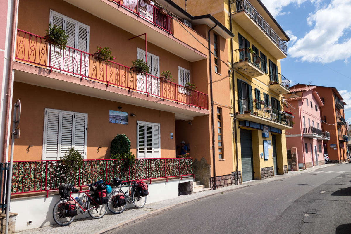 We arrive in Bosa at 1pm, just perfect for checking into the B&B. The man is here to give us the key and he even helps carry the gear to the room. The bikes are easily stored in the outer room. It's a shared bathroom, but then we are the only guests so shouldn't be a problem. Patrick also arranged that the breakfast can be moved up to 7am. This will help us get on the road early as the first section tomorrow is a climb.