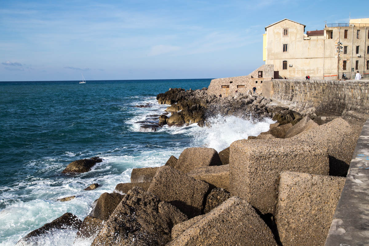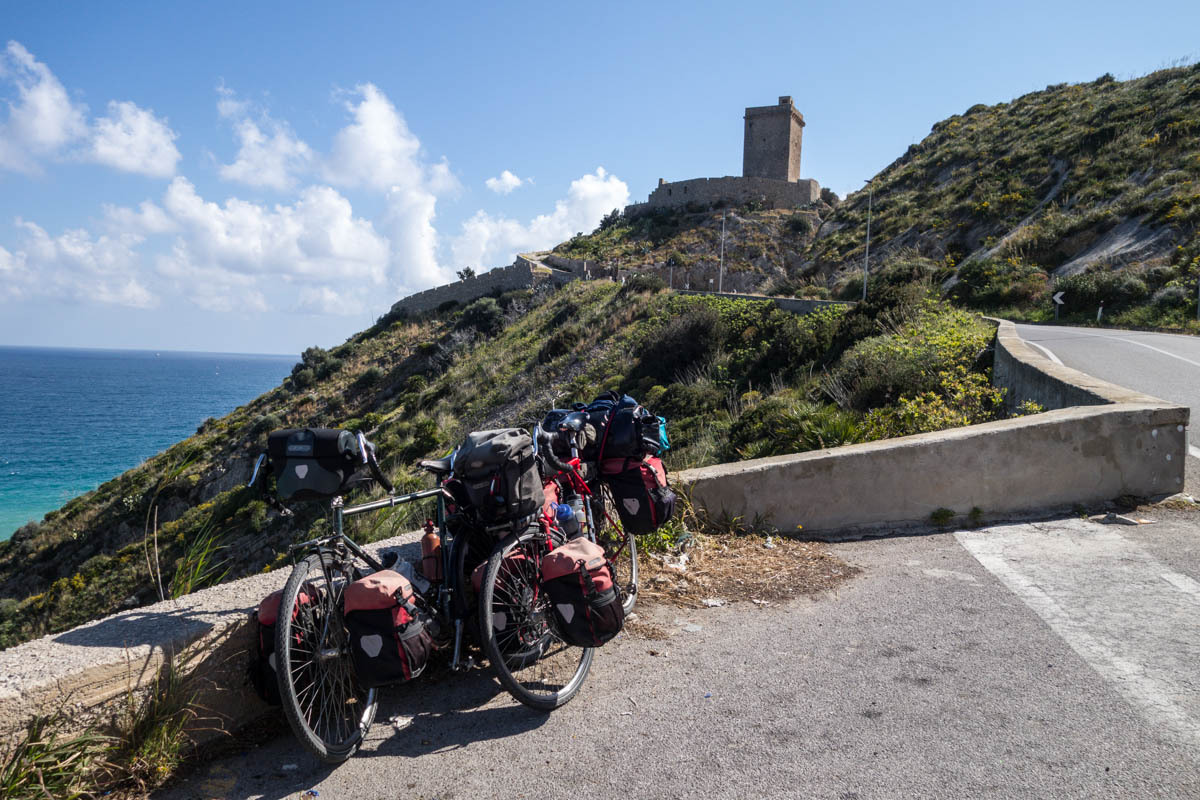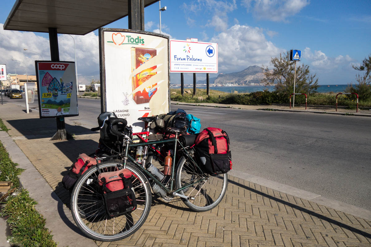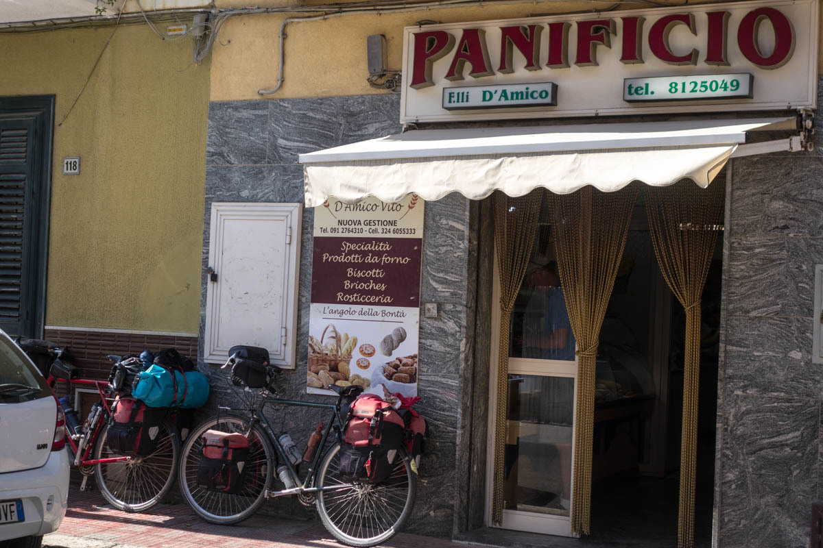 Like getting away from any urban area, this morning is no different leaving Palermo. We ride the wrong way down the main pedestrian shopping street, skirt past the train station and drop down to the sea shore. There we pick up route 113 that will take us all the way to Messina. There is fairly heavy traffic at first on very bad road surface so we have to pay attention weaving around. We are not the only cyclists; there are quite a few racers out for a morning ride. Eventually we lose some of the traffic when we stay on 113 and a newer interstate like highway starts towards Messina. We stop at a bakery for some nice, still warm fresh bread and a little further at the Trabini Roman Bridge we make our sandwiches.