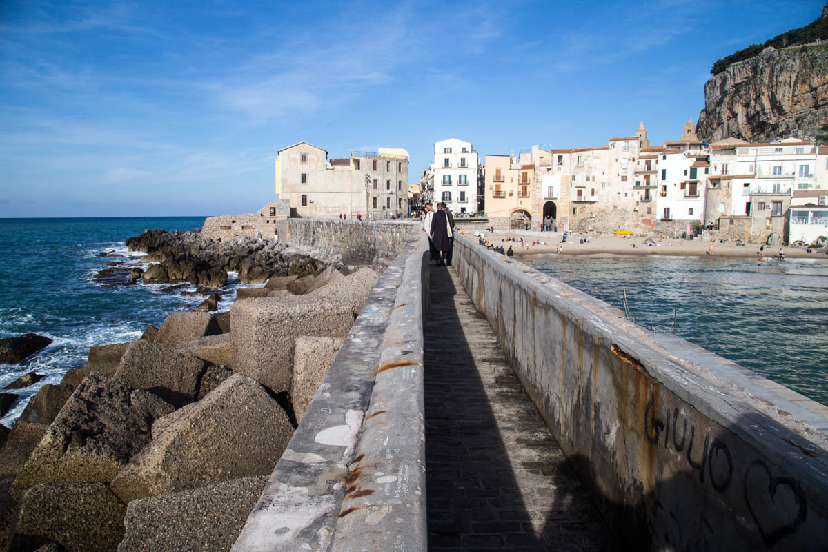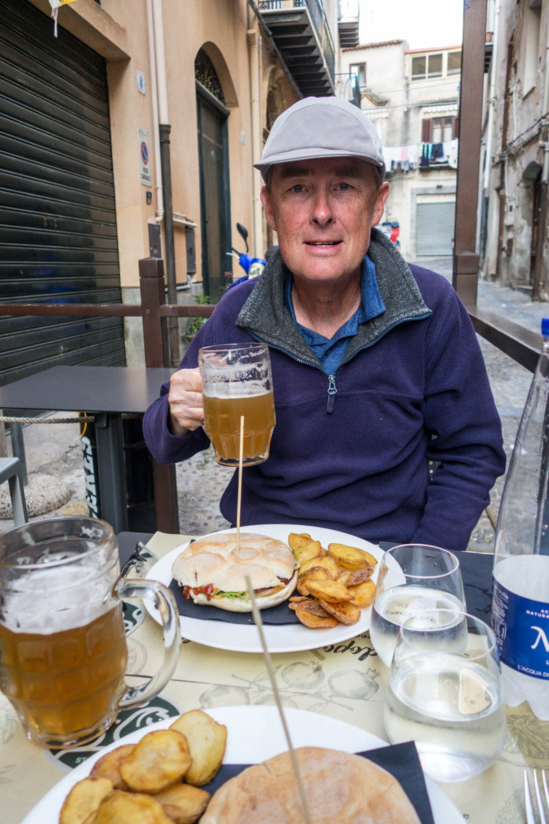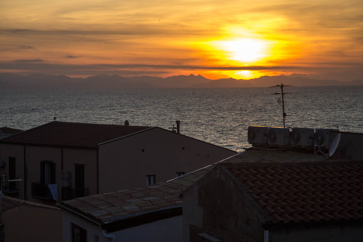 Later in the afternoon we walk the city streets and have decent burgers at the “George Pub”. The Messina lager is very nice on draft. Patrick’s sister took a vacation in Cefalu last year and highly recommended an ice-cream sandwich place in front of the Cathedral. It is closed today though, and after we finish our large beers at the pub we are too cold for ice-cream. We make it back to the hotel just in time to catch the sunset from the roof terrace.
