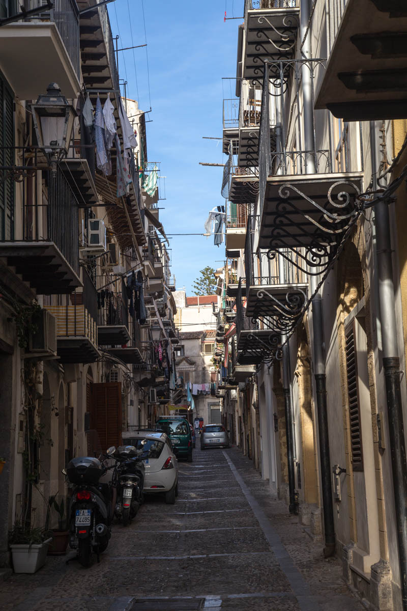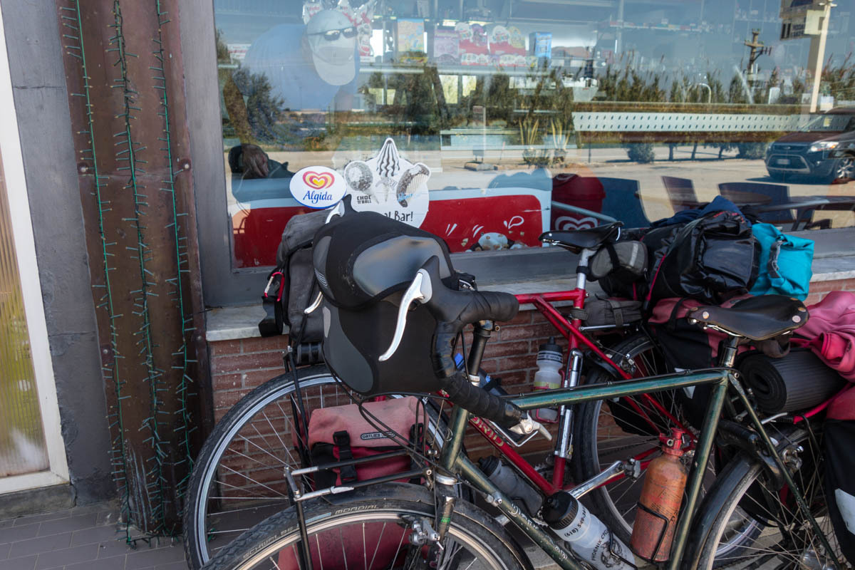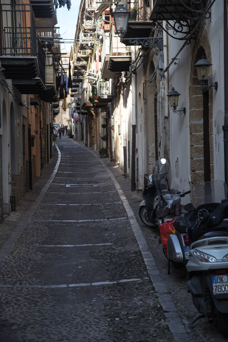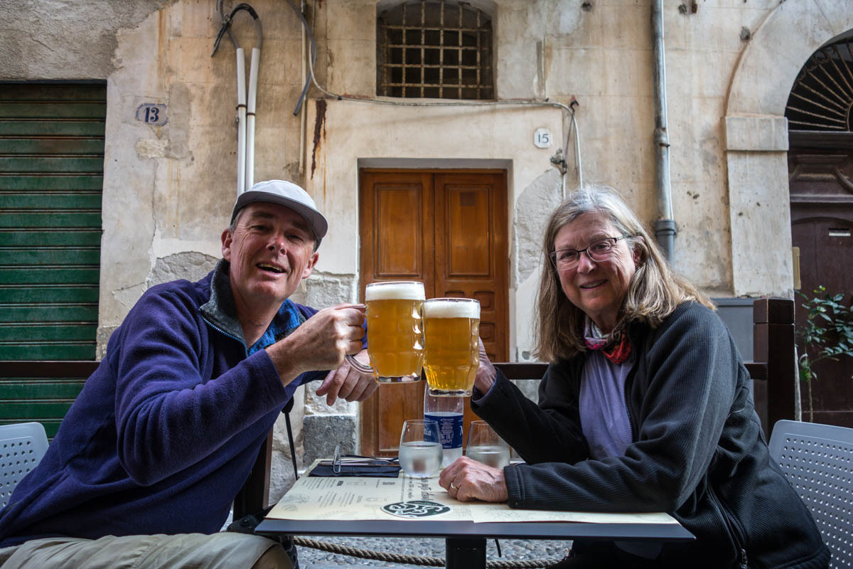 The old center of town is closed to most traffic, the roads are narrow, paved with large granite stones (very slick when wet) and filled with pedestrians. Our hotel has a good location only one road from the shore but right in the middle of things. The bikes are no problem, just down the street, under a derelict building is a cellar locked with a steel gate. Our bikes get parked in there. There is an elevator and we get a nice room on the third floor with a balcony overlooking the street. On the fourth floor is a large roof terrace with a view over the town and Mediterranean Sea. Patrick finds beer and potato chips and we rest up a while.