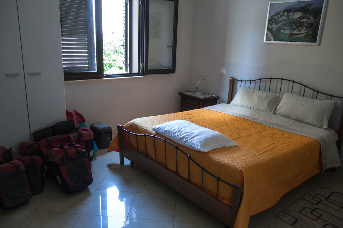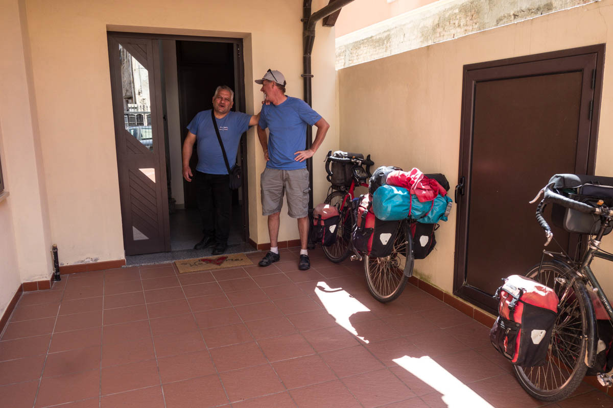 “We are early,” Patrick answers the man who welcomes us from the window above. Peppe is very friendly, even helps with carrying some of the gear to the room. The bikes are in the hallway, very secure. There are 4 keys needed to get into the room: the outside gate, the bottom floor door, the door to the suite of rooms and kitchen/sitting area, and the room.