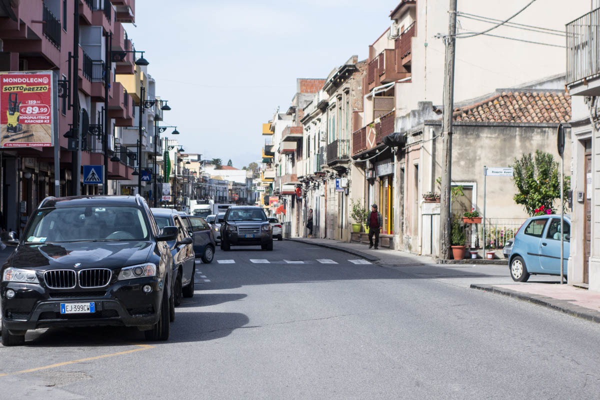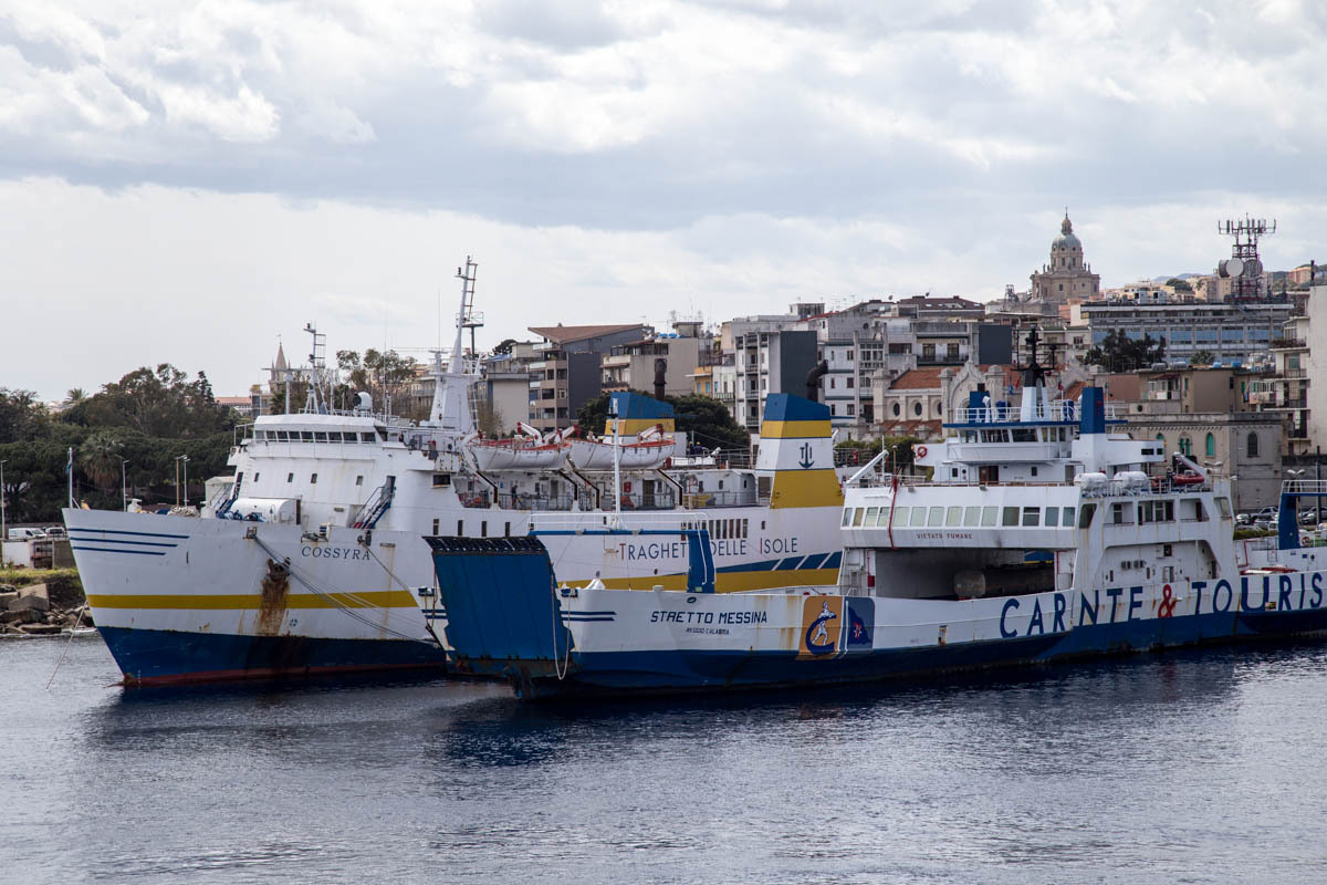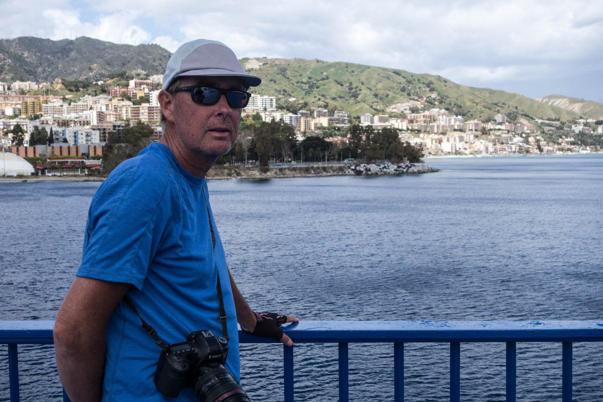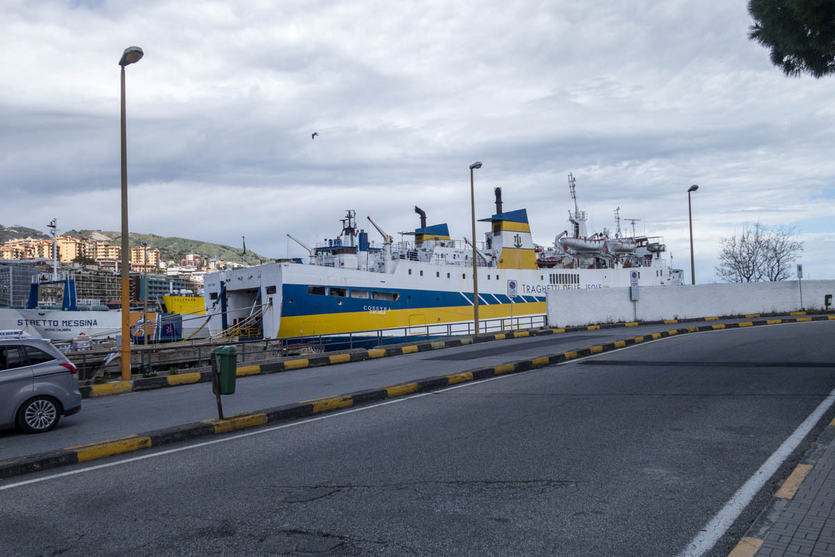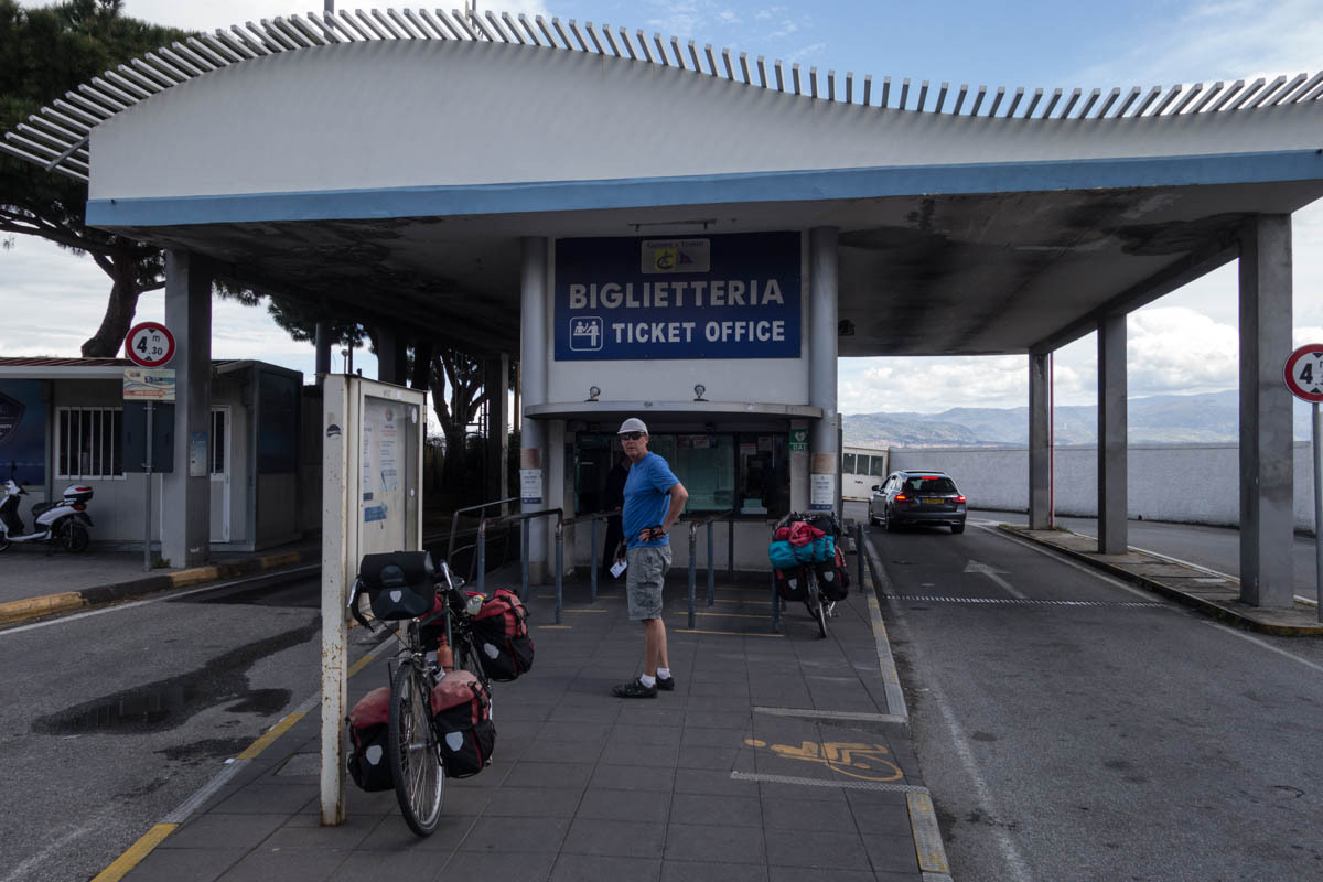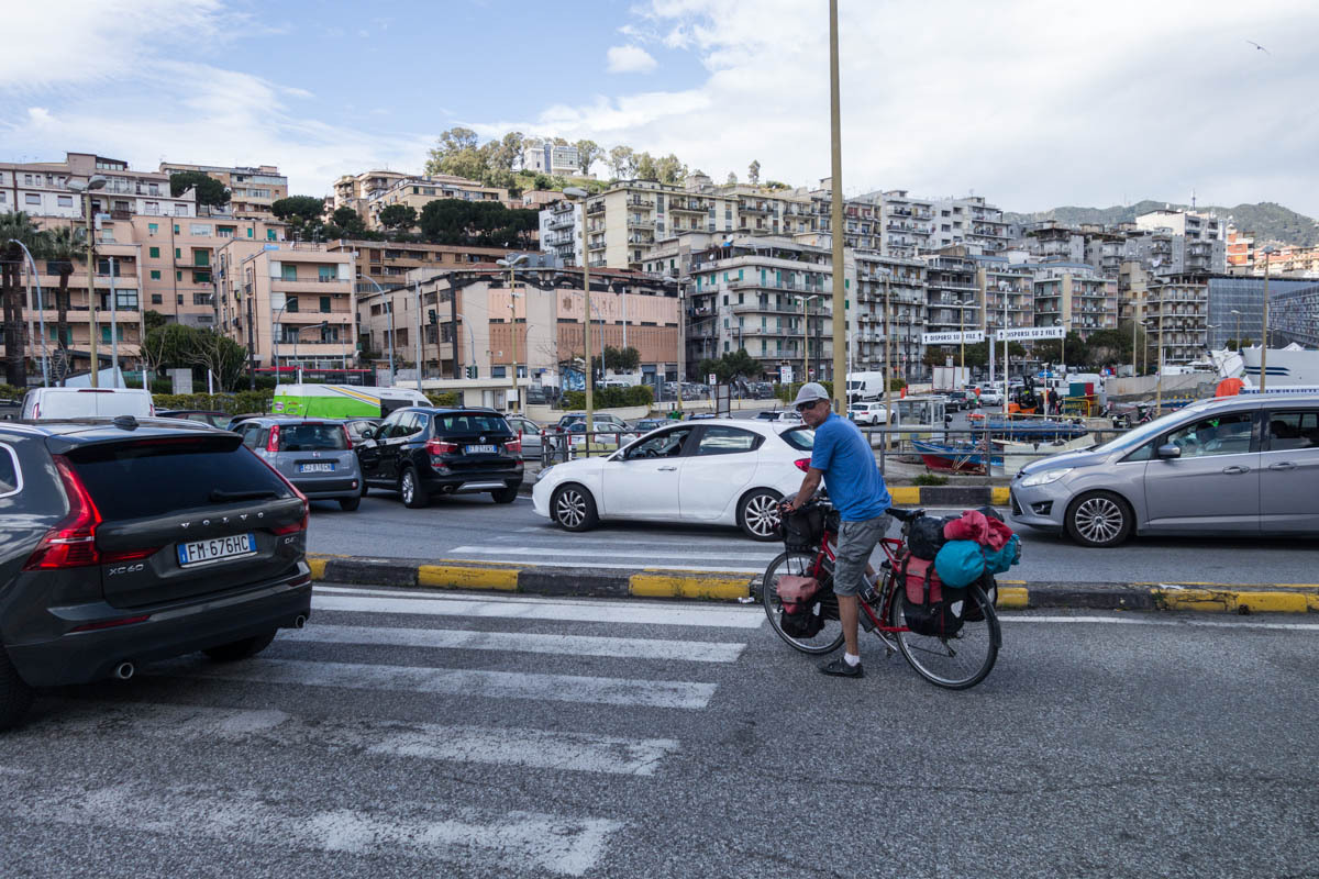 Once the direct road to Messina leaves the coast and heads up into the mountains the last section that is much more pleasant begins. We decide to ride an extra 15km or so and avoid the big climb over the ridge and go all the way around the eastern tip of the island. We lose much of the traffic, until we reach the outskirts of Messina. We have one big climb, helped by a tailwind then finally a nice downhill. About 15km to the ferry terminal, we stop at an intersection and make ham and cheese sandwiches. We continue on, and there is a bike path for a big chunk of the way to the terminal. We have to ride past the terminal and make a u-turn to the ticket booth. We ride to the front of the line of cars and after only a few minutes wait, ride onto the ferry and park our bikes. Only later do we realize the ferry loads and unloads at both ends and we parked at the back. It’s a quick crossing, only about 20 minutes. After docking the unloading goes very quickly and we ride a few blocks to the B&B Paradise.