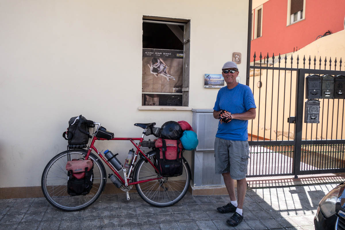 We clean up, rest then walk to the supermarket to buy tonight’s dinner of Spaghetti Bolognese. Rain is coming. Even though there is not much to do in this town we decide to take a rest day tomorrow and on Sunday try to take the train to Cosenza. This will get us ahead of schedule somewhat and over the big hills along the coast and inland. Italian trains are set-up to take bikes, but it is always and adventure trying to get on.
