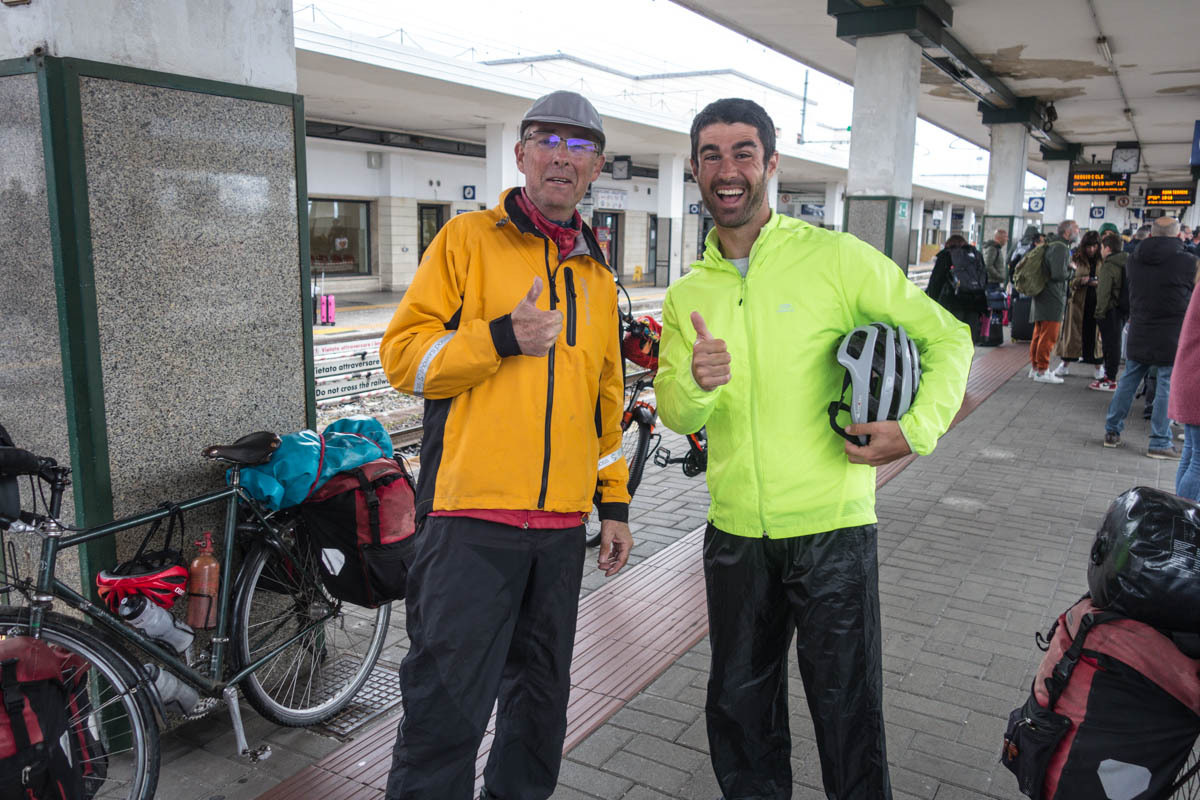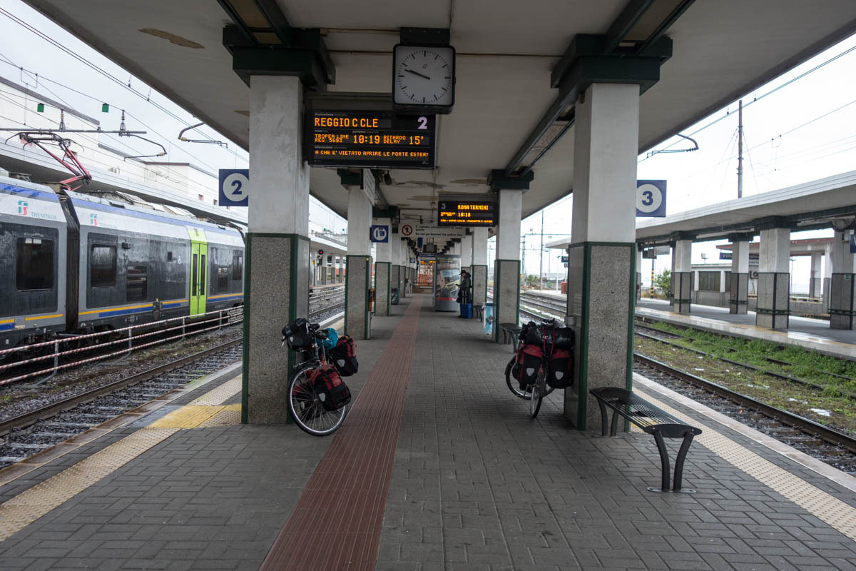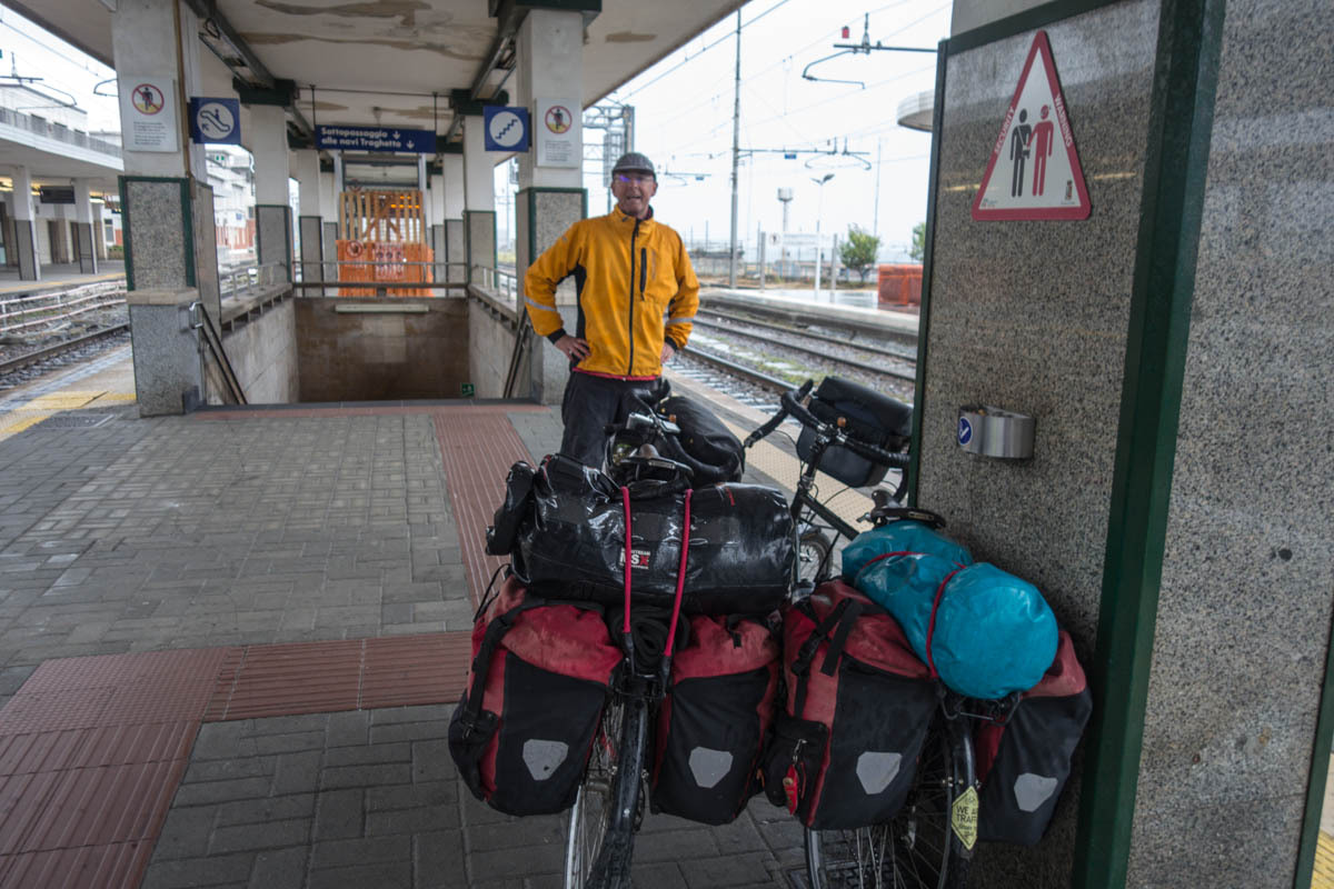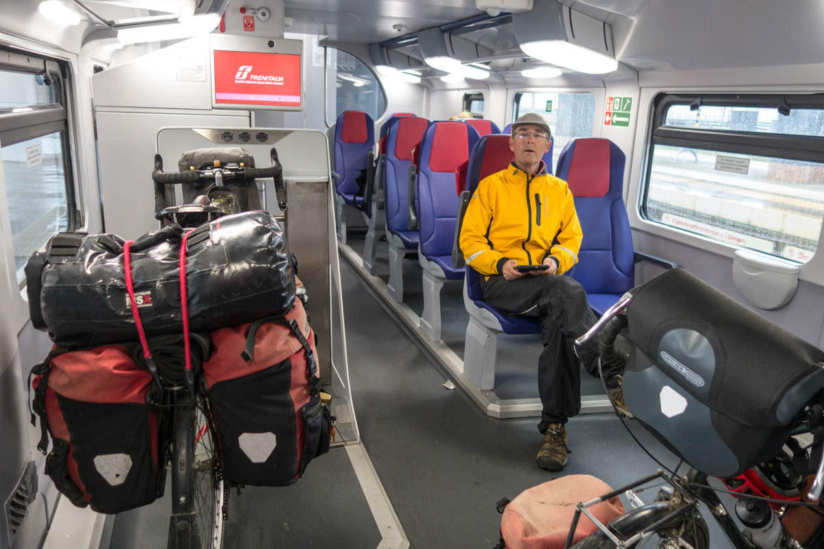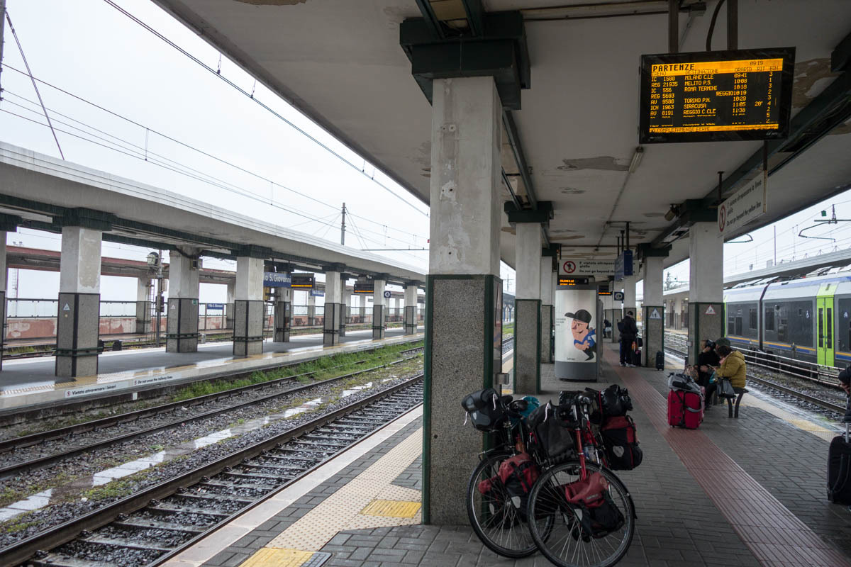 The train is scheduled to leave at 10:18. We wait until 9 to set out for the train station just as the rain starts again. We maneuver the bikes down the stairs through the tunnel and then up to the train platform. An Northern-Irish man travelling in Italy talks with us that helps pass the wait time until he leaves on a train.
