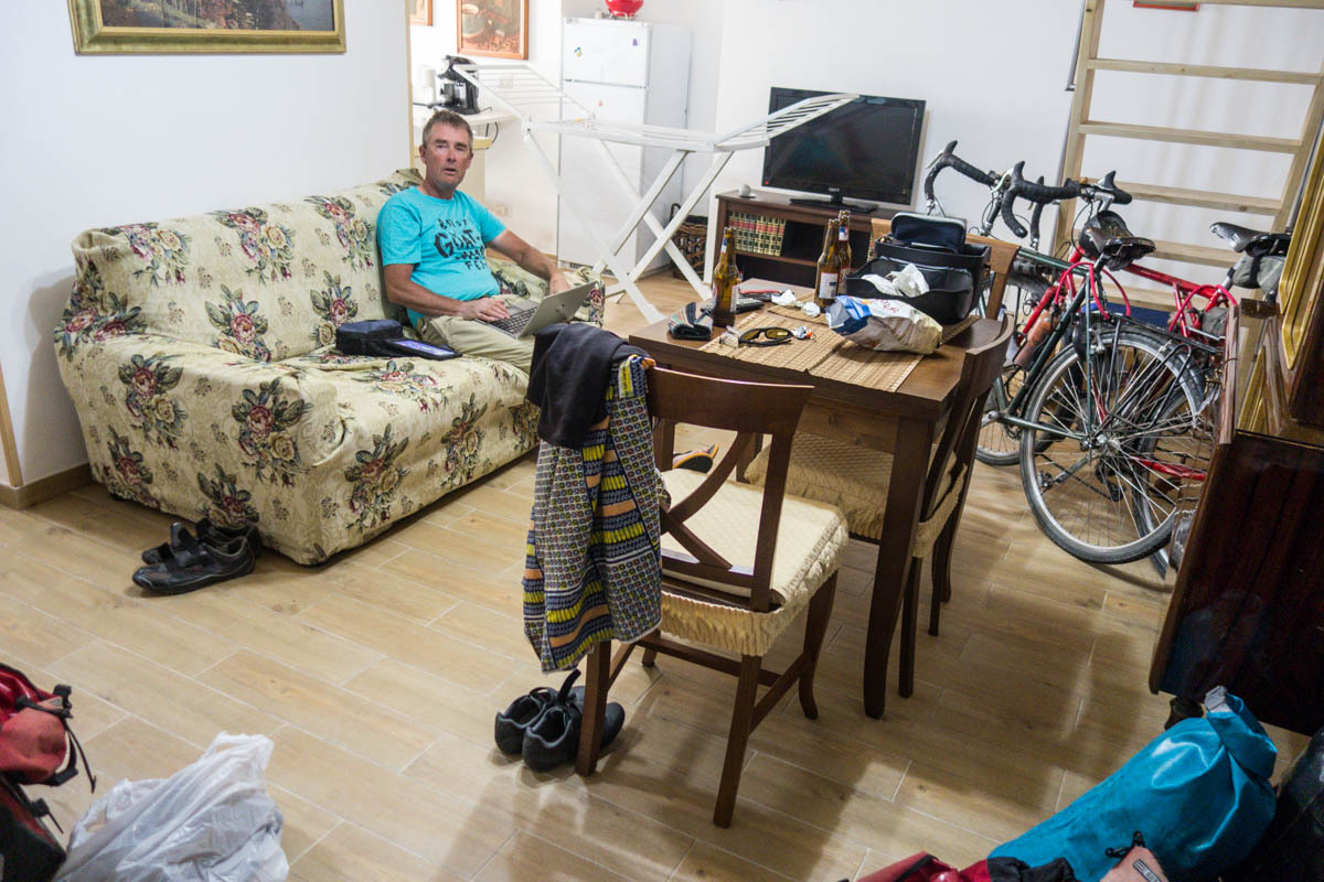 First though, there is a downhill and then a final climb into Bernalda. We arrive at about 2:30 and find the street the apartment is located on, but there is no house number. As we backtrack from the square, the family comes out and invites us in. They have their shy teenage daughter to translate, but the father and mother take great effort to show us every feature of the unit. Then we get the keys, more instructions on how to leave the keys tomorrow. On their way out they point out a nearby food place. Patrick walks over and finds a bakery that also sells cold beer.