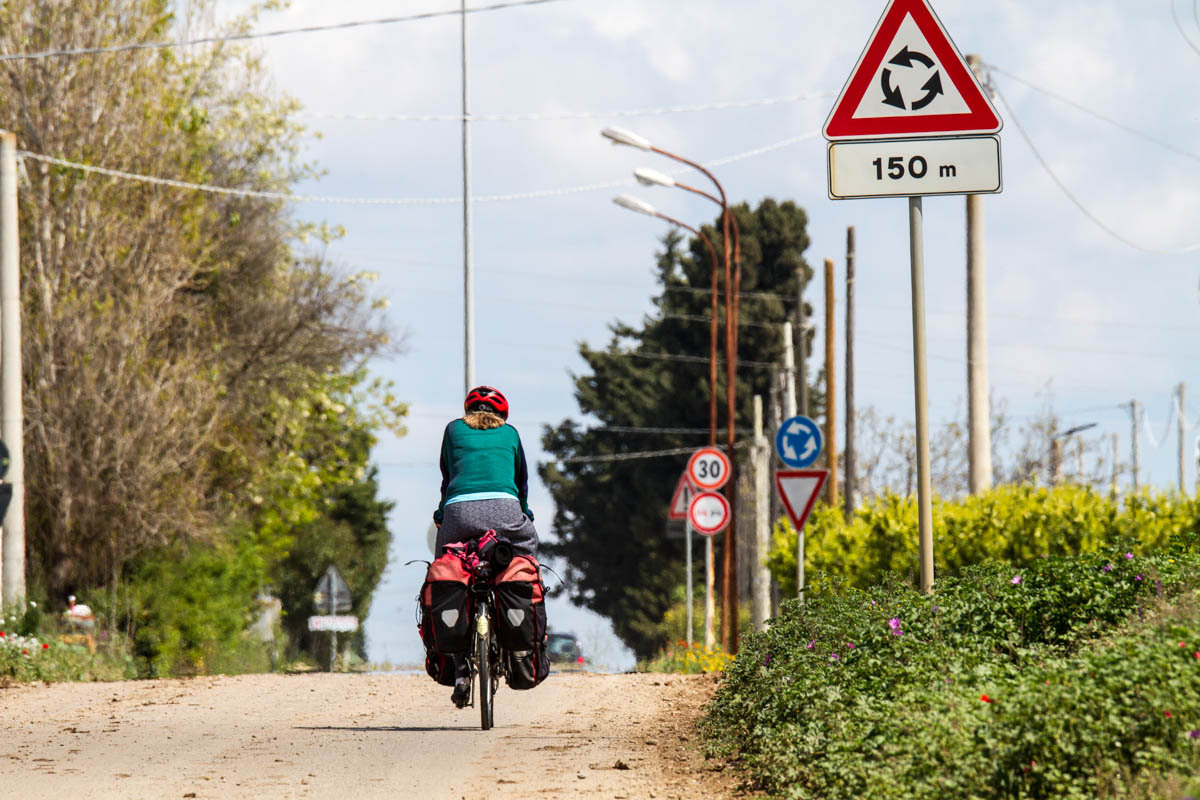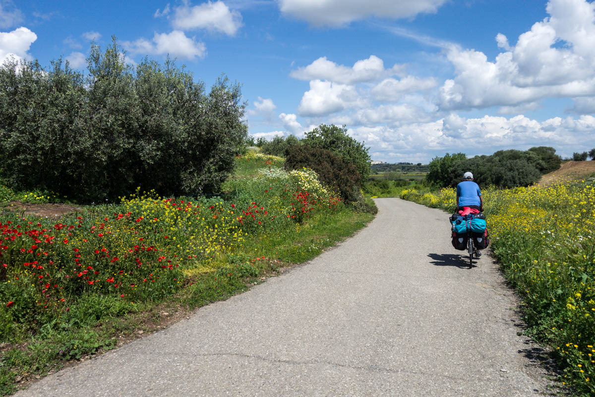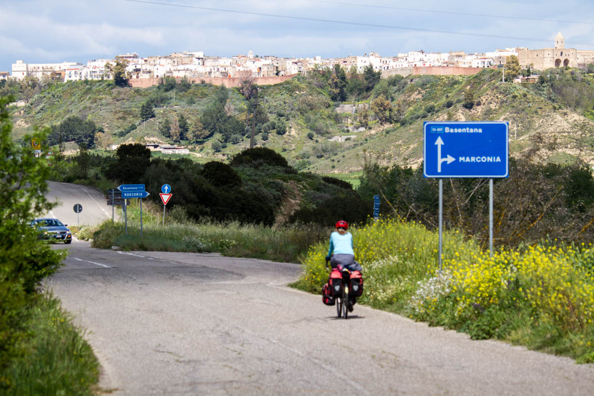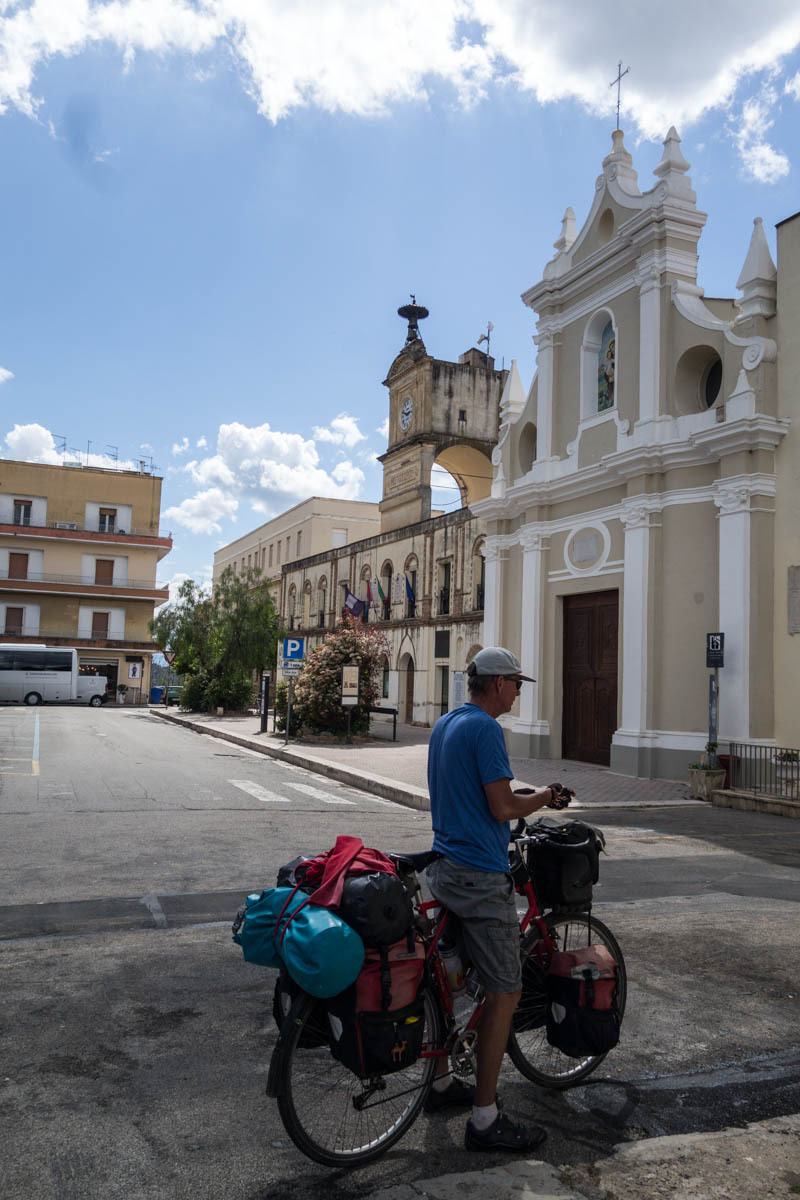 We eat our bowl of cereal in the apartment, load up the bikes and head out. Another nice morning with possible thunderstorms predicted for the afternoon. As we leave the Marina part of Rocca Imperiale, we can see the other part of town draped over a nearby hilltop with a castle perched on top. Too bad the weather yesterday prevented us from making the effort for exploring.