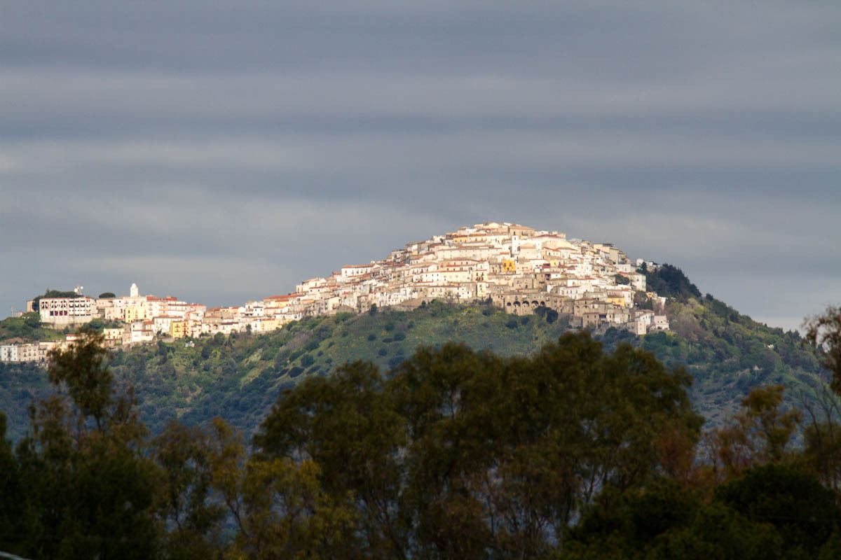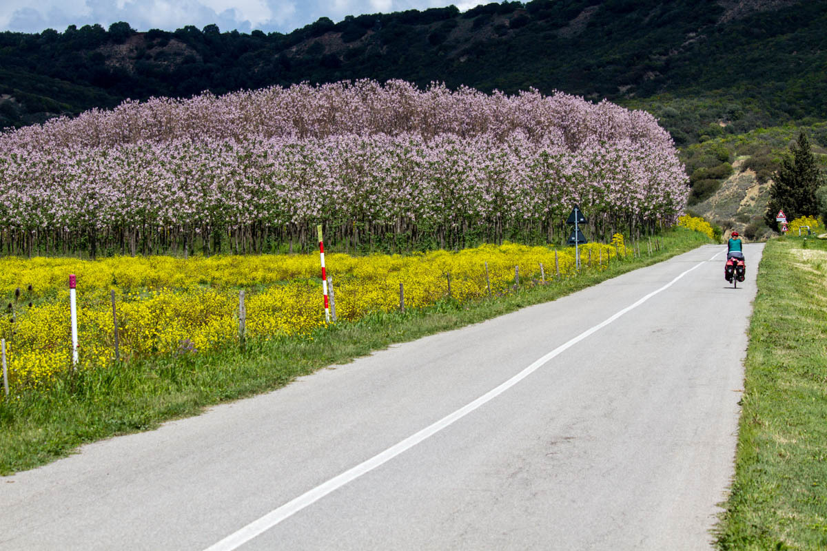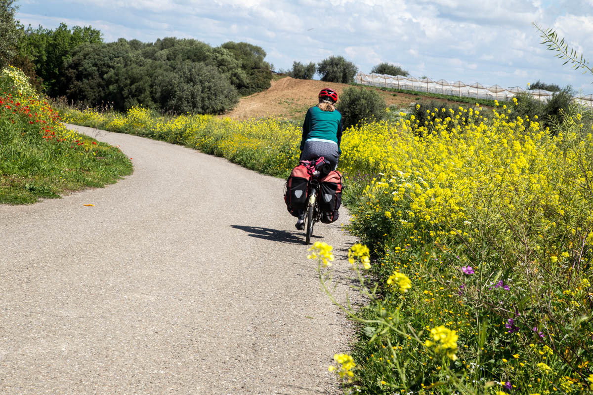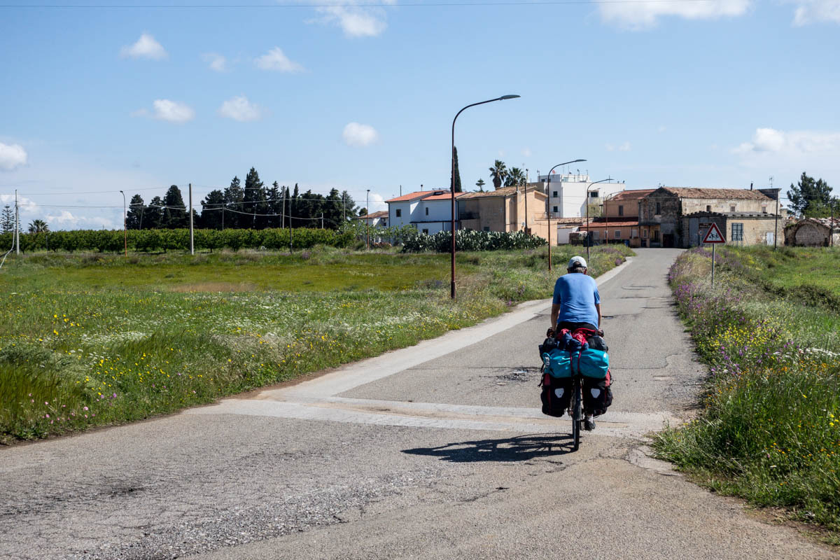 We eat our bowl of cereal in the apartment, load up the bikes and head out. Another nice morning with possible thunderstorms predicted for the afternoon. As we leave the Marina part of Rocca Imperiale, we can see the other part of town draped over a nearby hilltop with a castle perched on top. Too bad the weather yesterday prevented us from making the effort for exploring.