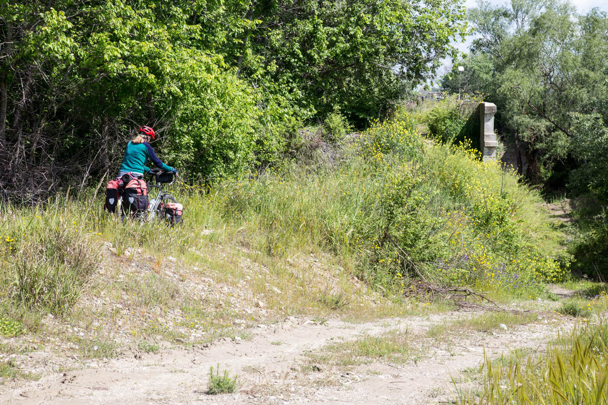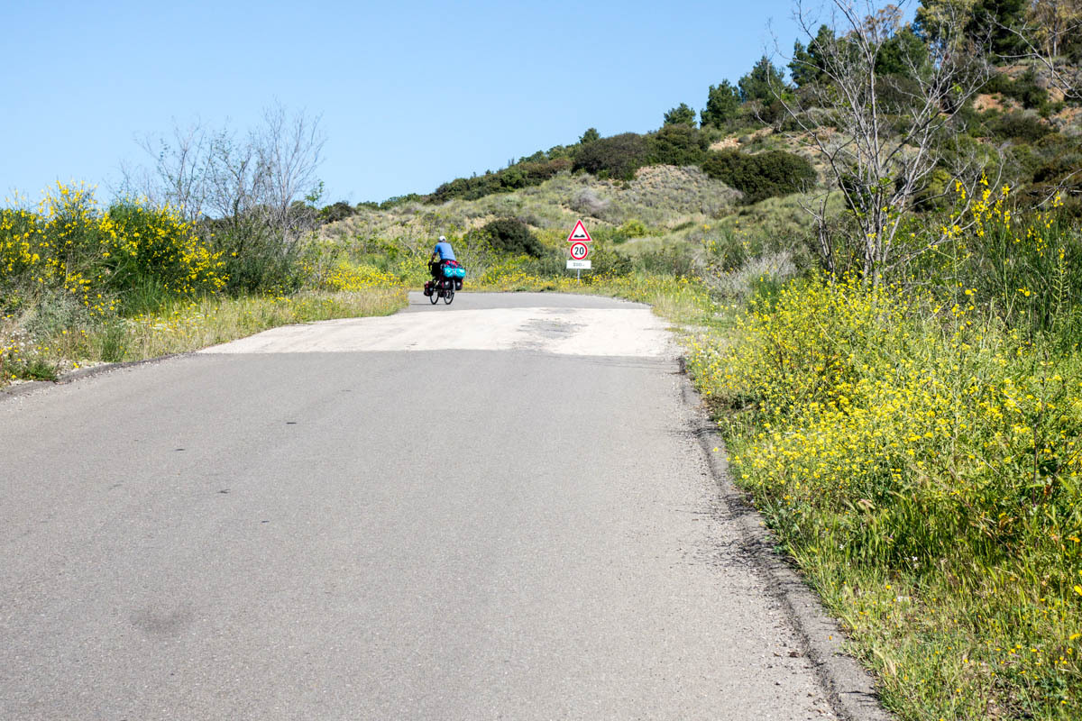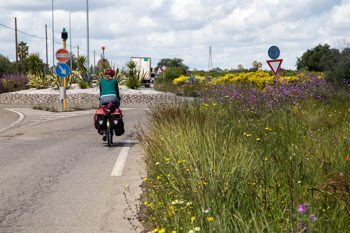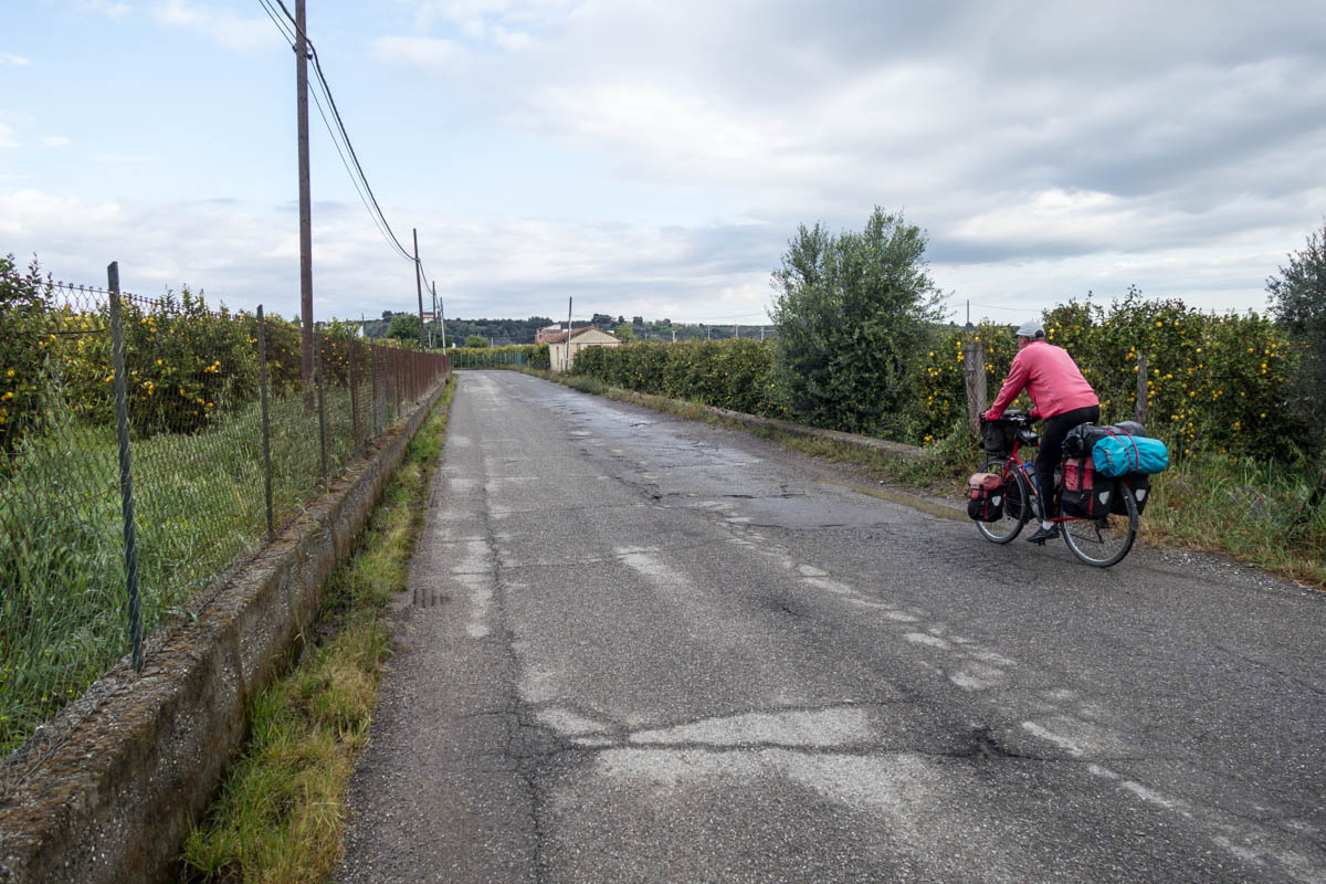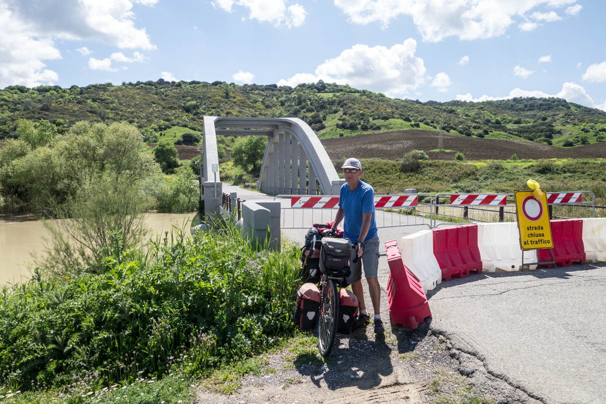 One more surprise as we near Bernalda. The last bridge where we need to get across one more river is blocked off. We would have to go further upstream, then backtrack on a very busy road. A road crew passing by stops to watch us as Patrick is already between two barriers. One guy says something, but we don’t understand. The thing about not understanding a language, one can always imagine they are saying something positive, “Like keep going through the barriers”. After they drive on we haul our stuff around the first barrier. The bridge looks fine to us, but there probably is an unknown issue. The blockade on the other side is a little sturdier, but the tie-wires holding the metal barriers can be undone by hand. The plastic barriers were never filled with water so are easily moved. We get through one more time.