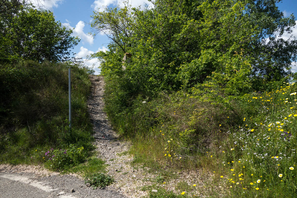 Back at the coast we stop for a nice cappuccino and pastry. We’ll miss this once we get to the Balkans. Then back to playing hide and seek with the Interstate. We are sent down a dead-end road once again, and this time it seems like it truly just ends at a river bank. But wait, behind the bushes is an abandoned bridge and a faint trail leading towards it. “I remember seeing this in the Anderson's journal from 2019,” Patrick says. We push over it. Some more zigzags, and then we leave the coast for good. Can’t say we are sorry. Inland has been much prettier, but also harder because it is either up or down. We climb another hill and can see our destination on the next ridge.