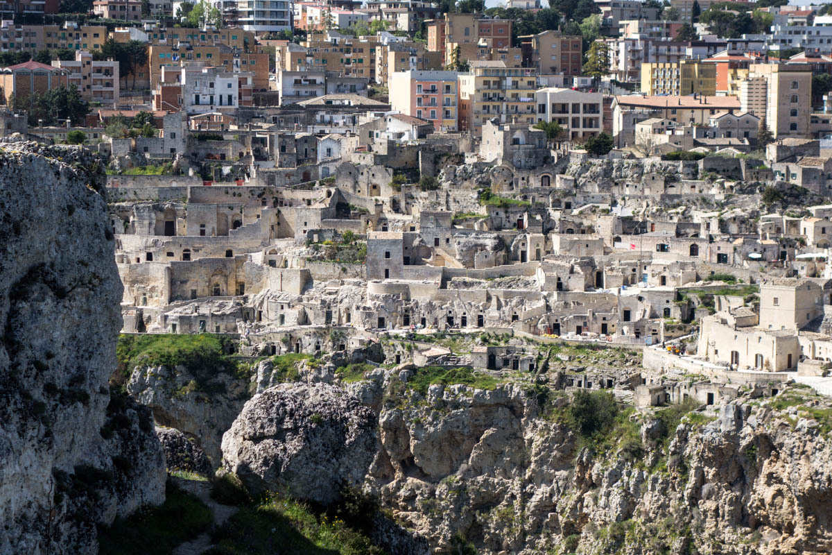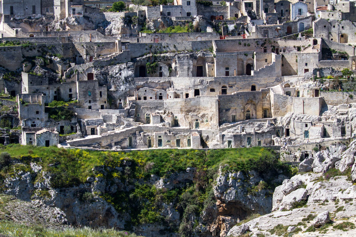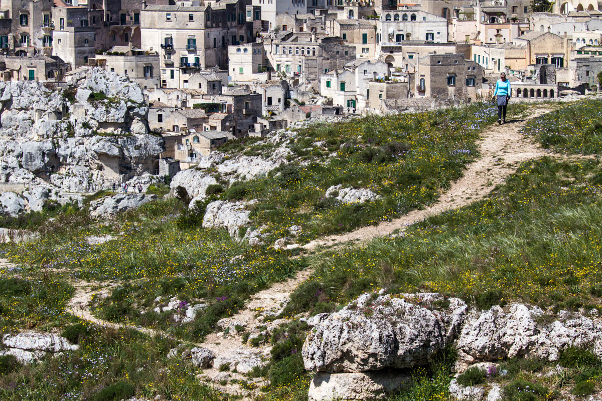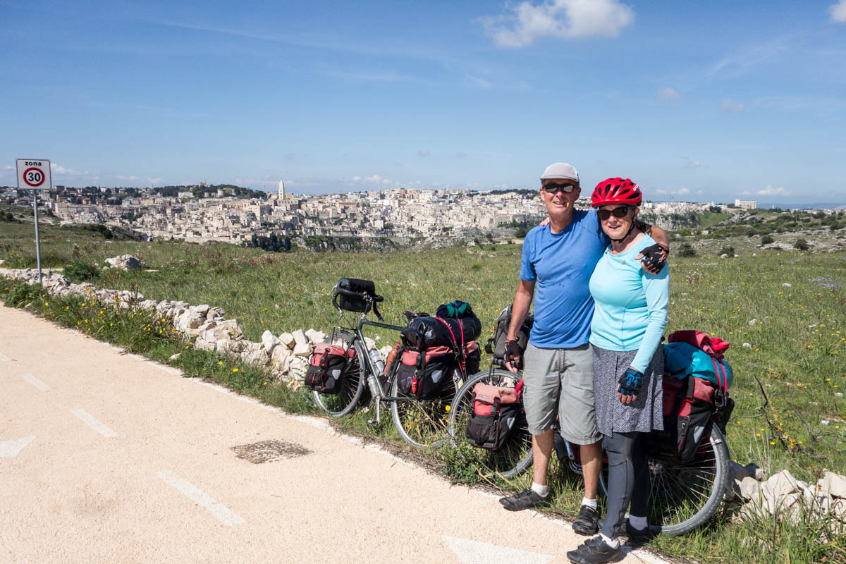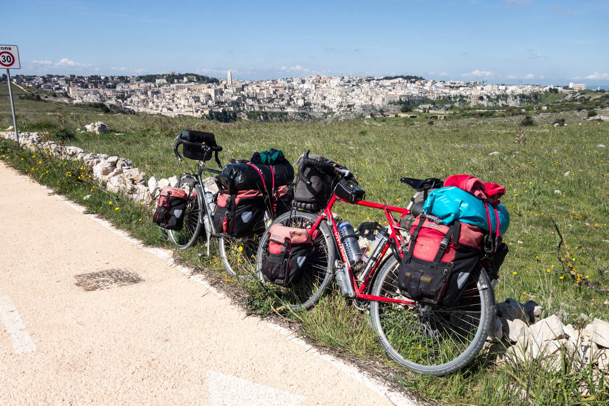 Then a significant hill up to the viewpoint across the ravine from Matera. We take turns walking the paths so one of us can watch the bikes. We plan to hang out here for a while, enjoying the view and eating a sandwich for lunch.