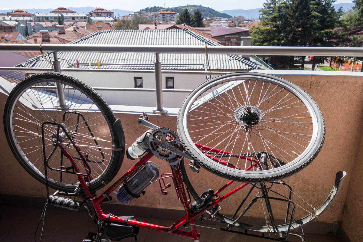 After the sightseeing, we return to the hotel. Patrick rips up his bike shorts to clean the chains. He finds the sprockets on the freewheel are loose. We've walked past a bike shop several times on our way to the city center. He quickly takes the wheel to the small bike shop where he is able to tighten it up.