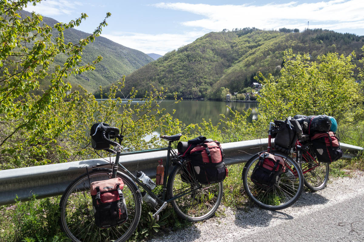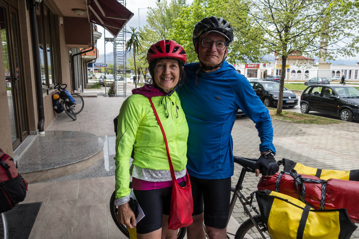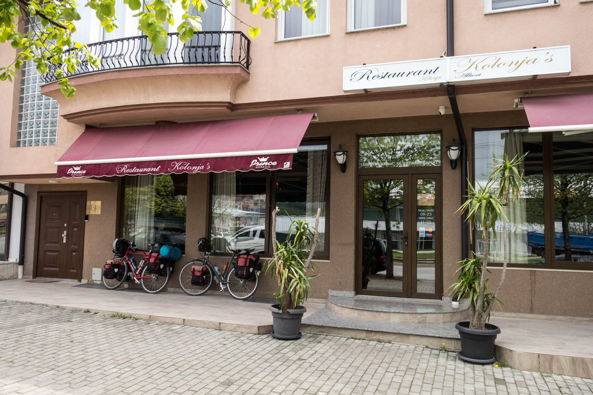 While Patrick is checking in to Hotel Kolonja’s, Rachel sees two loaded bikes coming down the street and they are headed this way. It’s Todd and Luciana we know from a CGOAB journal Back to the Balkans. We knew they were in Ohrid but thought they would probably take a restday so we might be a day ahead. We can’t comment on their journal, so instead Patrick sent a message this morning to Michael and Joanna Kepinski asking if they would comment on their journal for us. “Fun running into you just before I got the CGOAB guestbook message,” Todd says after riding up. They check in also. Our bikes are stored in the garage behind the Hotel.