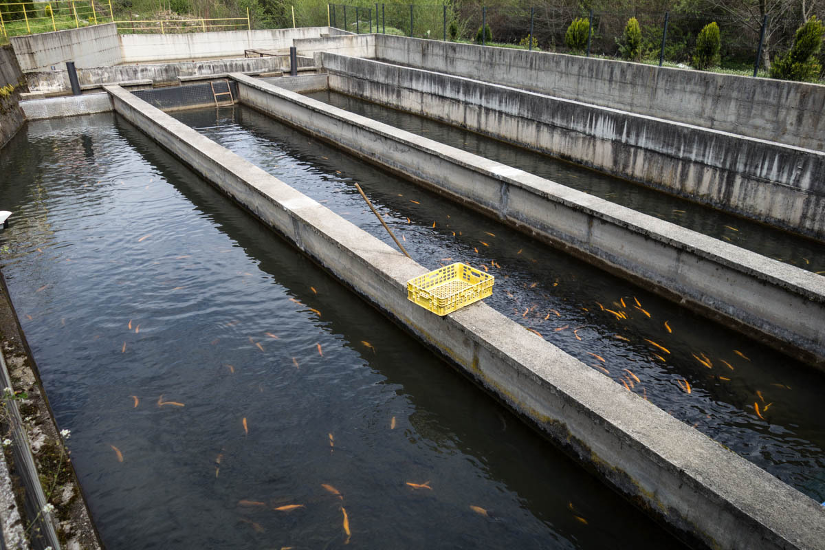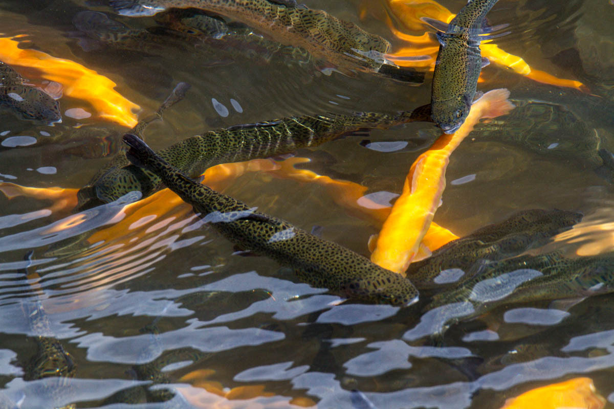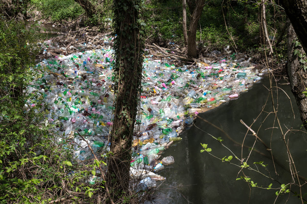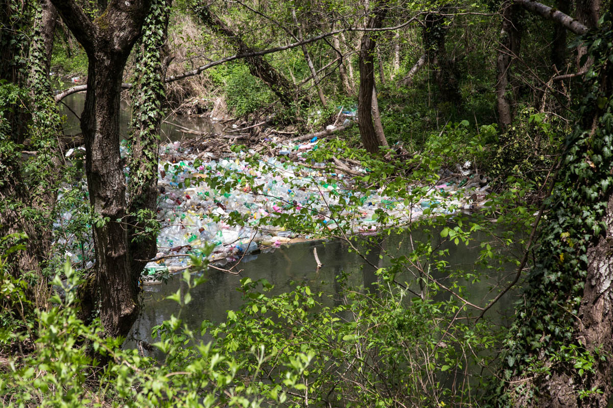 Our next stop is at a fish restaurant. Our cappuccino comes with whipped cream and a drizzle of chocolate on top. Adjacent to the river there are three rectangle concrete tanks with rainbow trout. Some of the trout are genetically modified to be orange and yellow colored. We start to see rock cliffs and forests. The river shows signs of flash flooding, lots of plastic stuck to trees. The saddest thing though are several logjams made from plastic bottles. An amazing sight: thousands of bottles damming up the river. It actually makes sound as bottles get crushed by the water pressure. We have never seen a sight like this. Can this ever be turned around, or are we doomed to destroy every beautiful place?