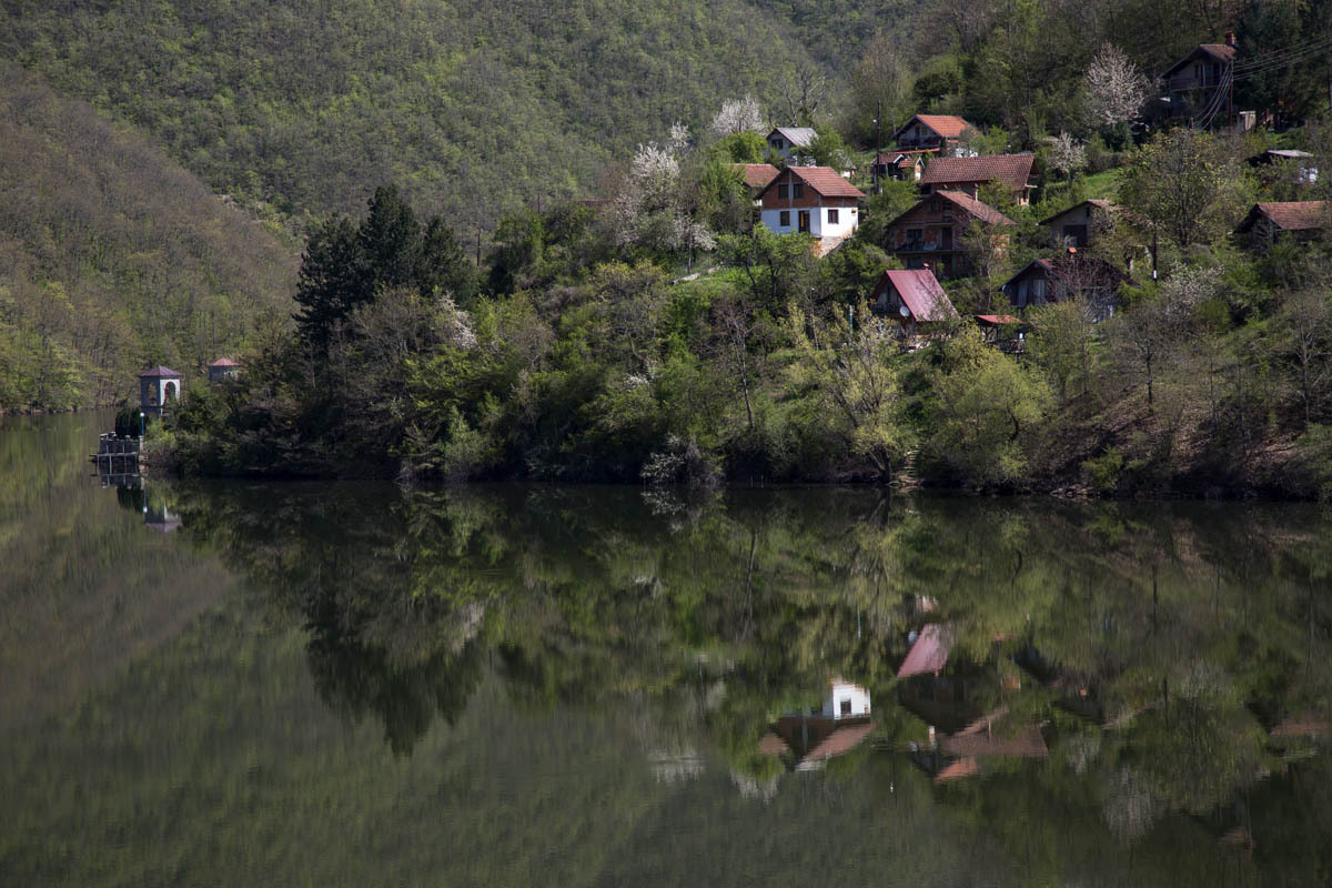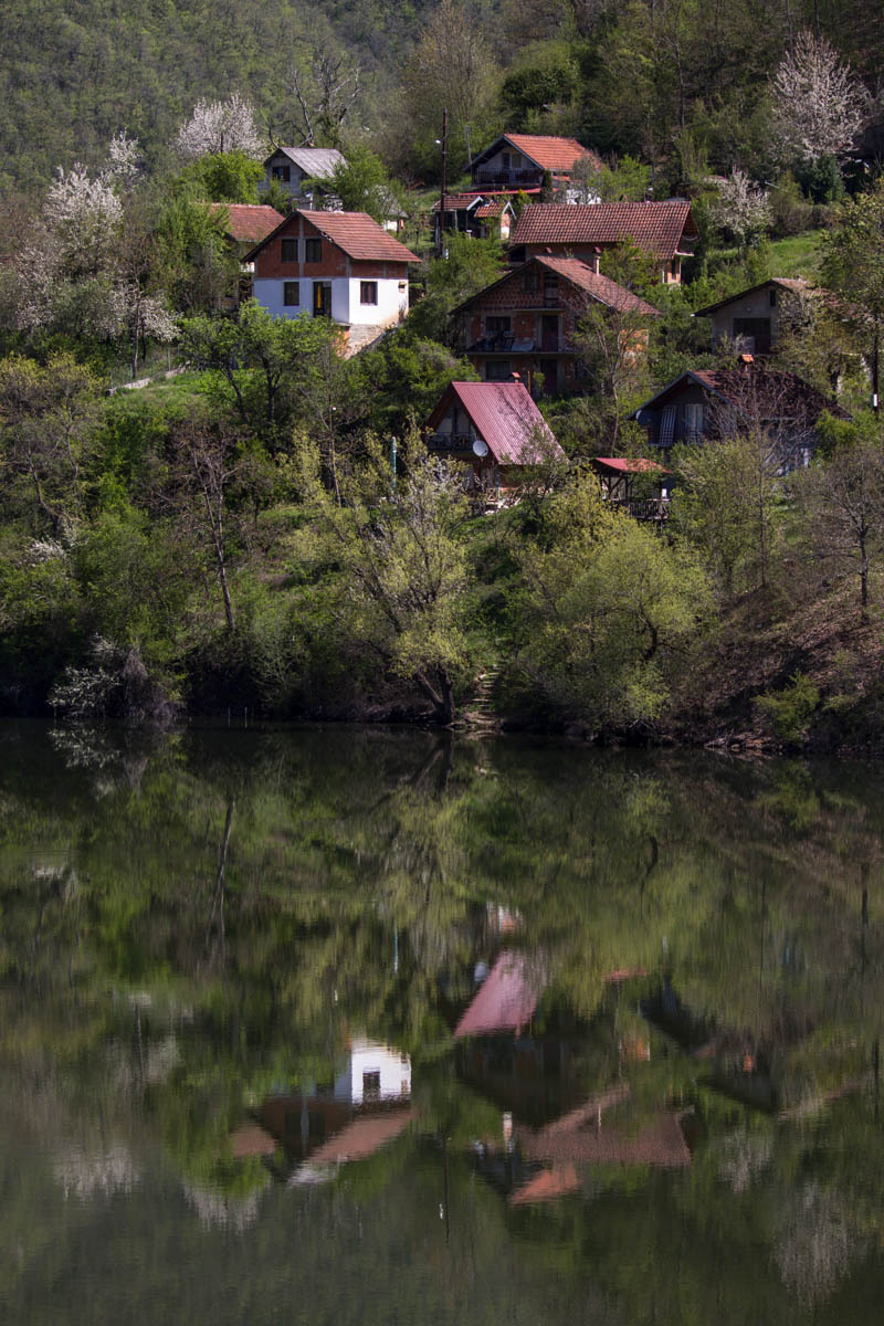 We follow a pretty river that turns into a reservoir. The scenery is nice, but it is marred by the enormous amount of discarded trash and floating debris. We pass a dam with “no photo” road signs, then drop down and follow the river downstream.
