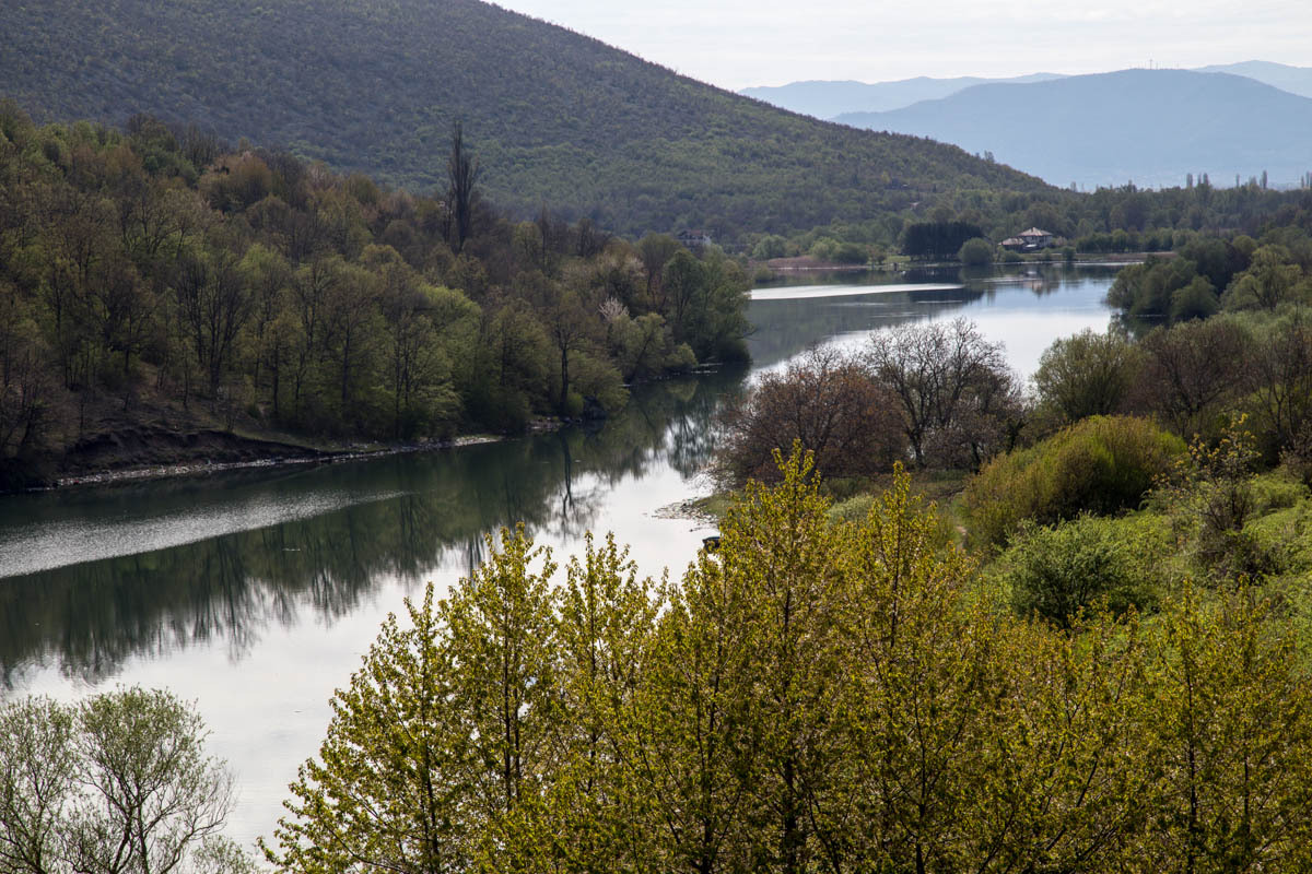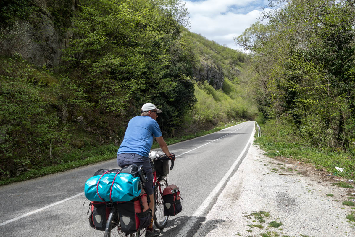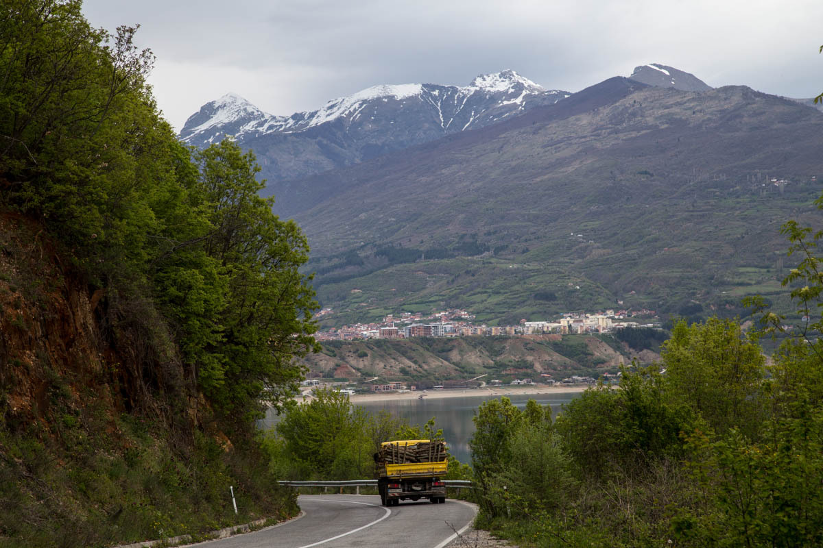 The sky is slightly overcast as we retrace the 12km along the lake back to Struga. Then we turn north up the valley. The road is very busy with most traffic coming into town. After we pass a junction and the last two bigger towns, the traffic lessens. We stop at a gas station and from a machine have a small cup of cappuccino. We stopped just in time, because after this there is not much until we reach Debar.