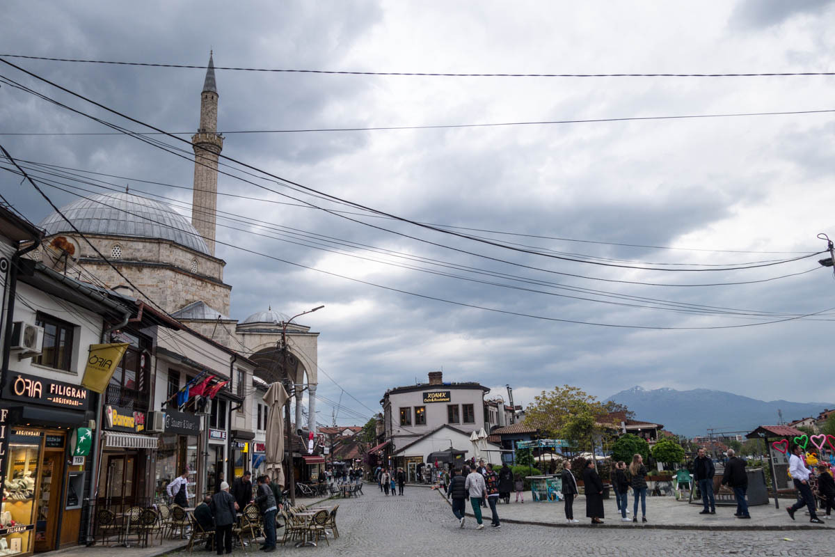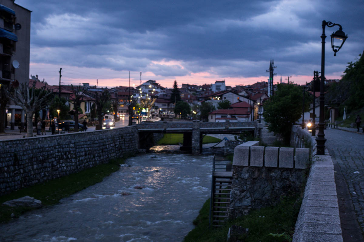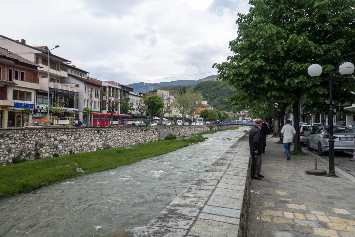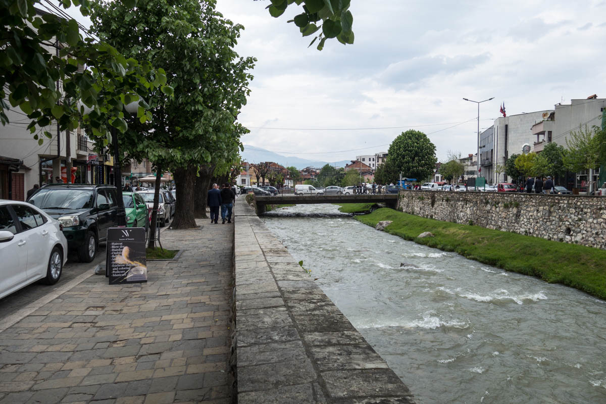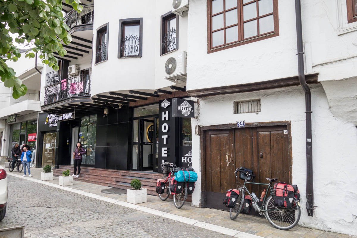 On the outskirts of Prirzen, we stop for lunch of a kebab. We don’t want to arrive at the hotel hungry like in Debar. Our hotel is right downtown along the river that flows through town. It is busy, may tourists seem to be walking the roads. We get a room on the second floor, carry our gear up and store the bikes in a fenced-in driveway around the corner. There are two other bikes already, we had heard that Todd and Luciana arrived here yesterday after two long days of riding.