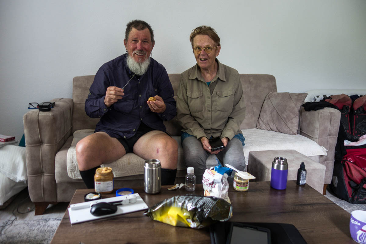 “Are you ready to sacrifice your shirt?” Patrick asks Rachel. He uses the blue shirt to clean the chains. The light morning rain becomes more stormy weather in the afternoon. It’s good to be inside. Rachel fixes chicken fried rice for all of us for dinner. Chuck had asked a man with a truck to drop by to discuss taking us up to the border. The discussion ended quickly when he charges 100Euro.