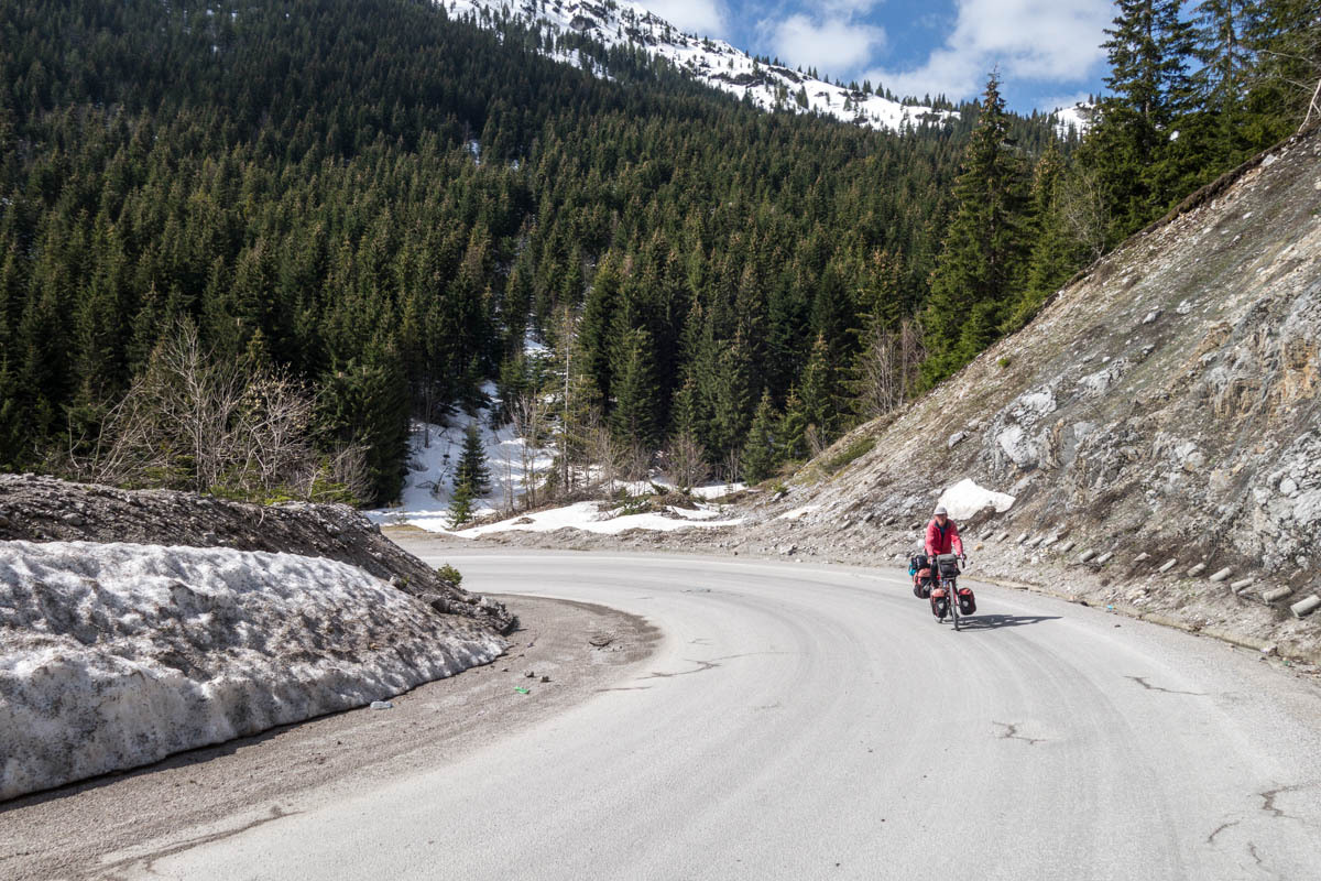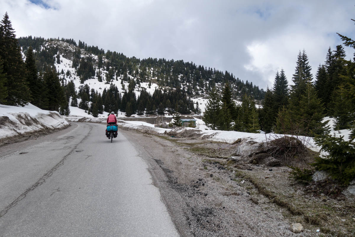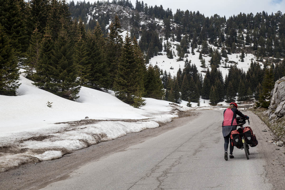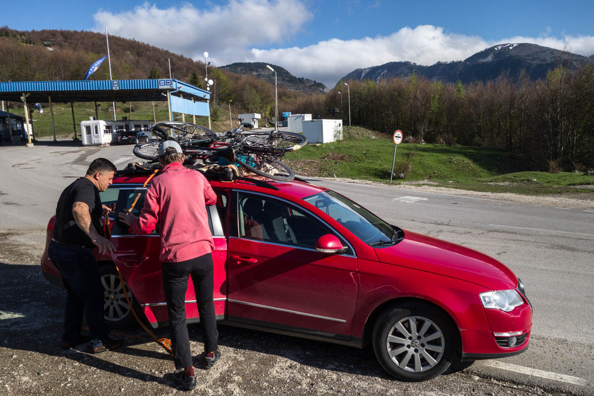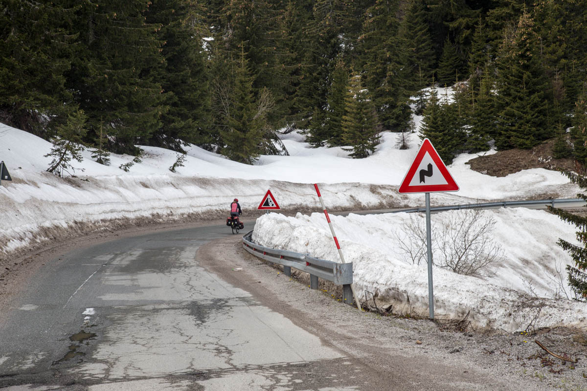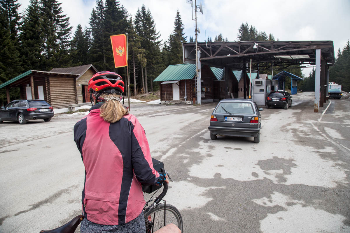The very friendly woman at the immigration post indicates with her hand that the road is still going up and then says giving us our passports back “10km.” And it was, 10km of climbing to the high point that still has snow. The Montenegro border post is 3km after the high point. The grade is sometimes manageable at about 7% and sometimes just a little too steep for us to ride, so we walk. It is slow going and we regret getting off the taxi, but on the other hand at least we are working for it and are experiencing these mountains. Eventually the pass summit comes in view and we put some extra layers on for the downhill. About 3km down is the Montenegro border post with a bunch of freezing border guards.