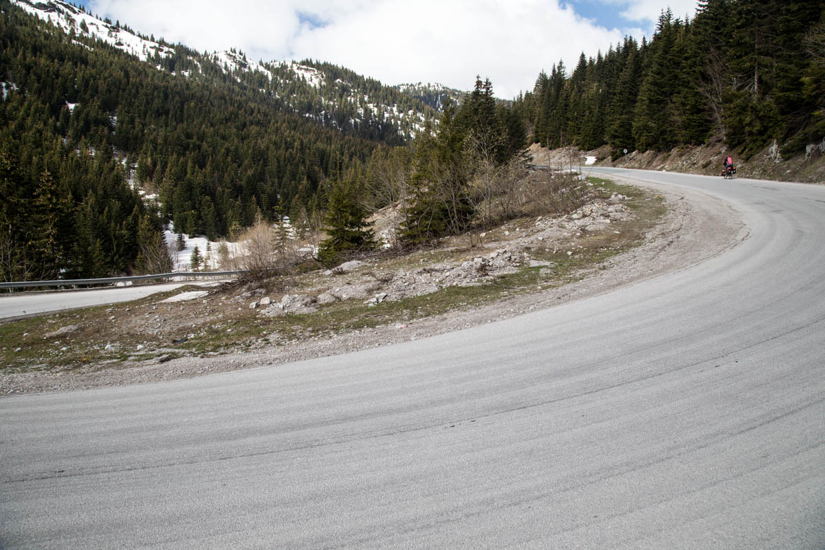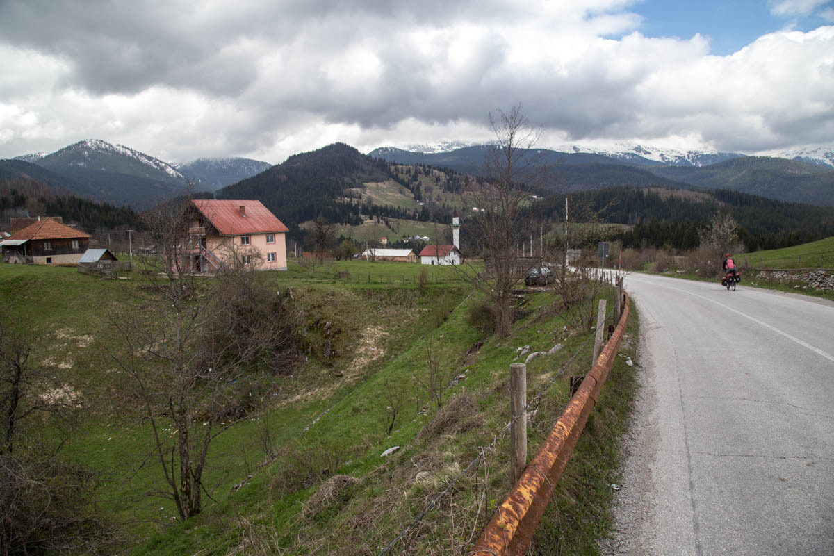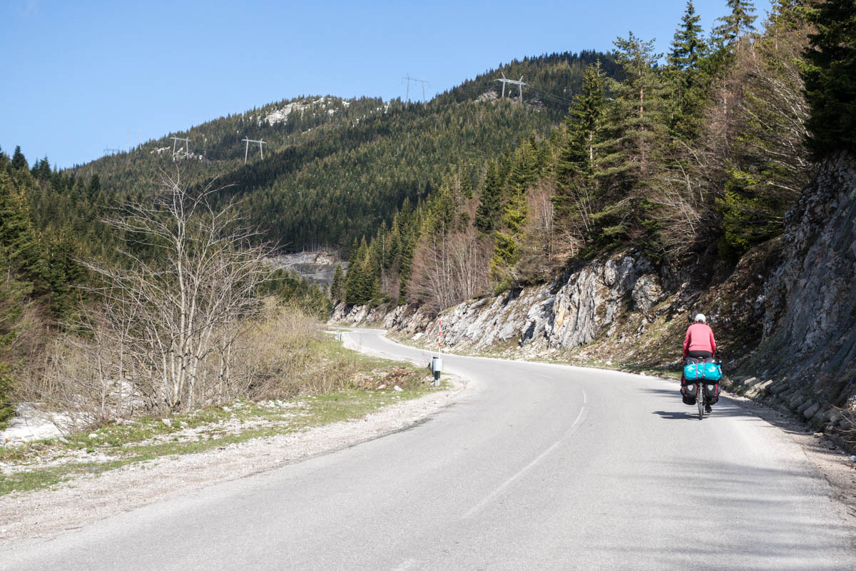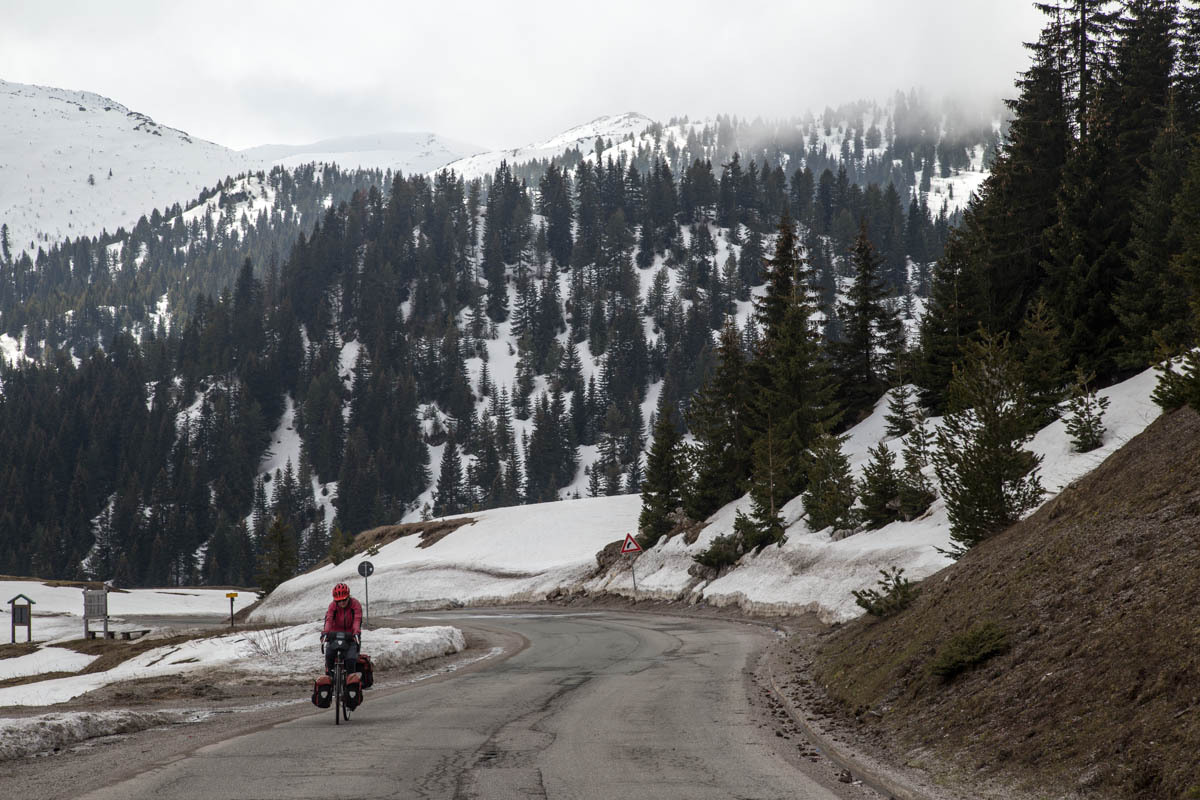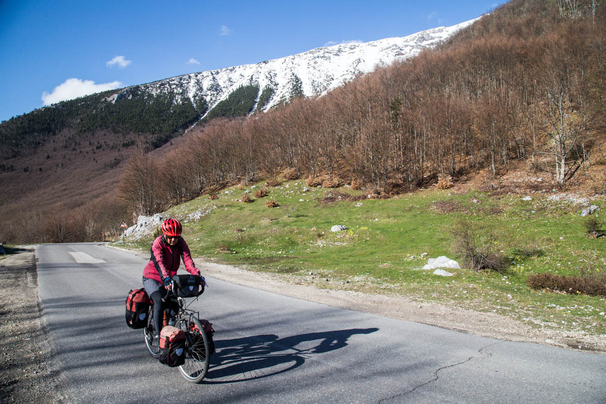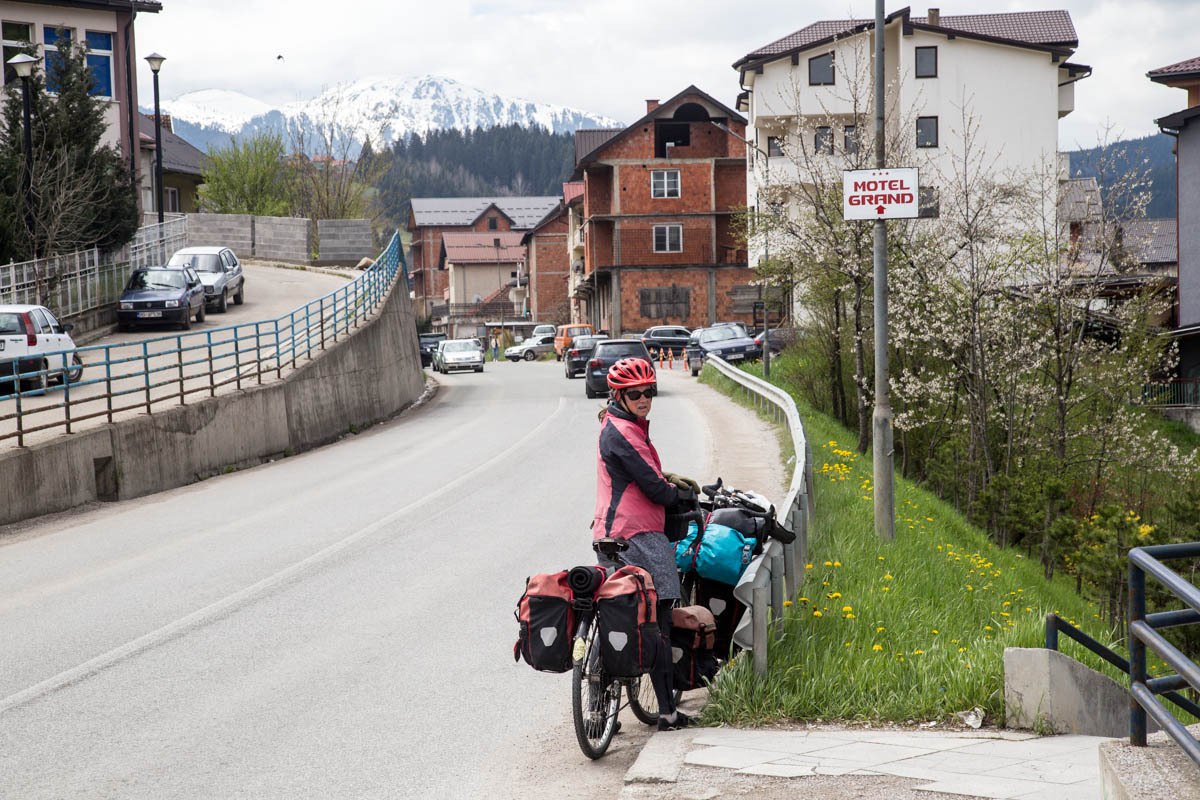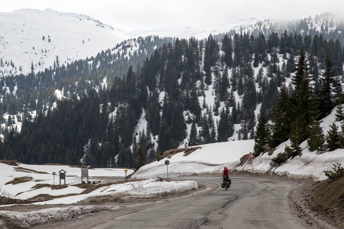 The very friendly woman at the immigration post indicates with her hand that the road is still going up and then says giving us our passports back “10km.” And it was, 10km of climbing to the high point that still has snow. The Montenegro border post is 3km after the high point. The grade is sometimes manageable at about 7% and sometimes just a little too steep for us to ride, so we walk. It is slow going and we regret getting off the taxi, but on the other hand at least we are working for it and are experiencing these mountains. Eventually the pass summit comes in view and we put some extra layers on for the downhill. About 3km down is the Montenegro border post with a bunch of freezing border guards.