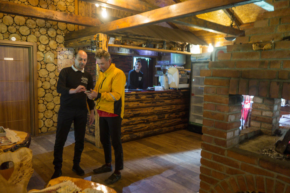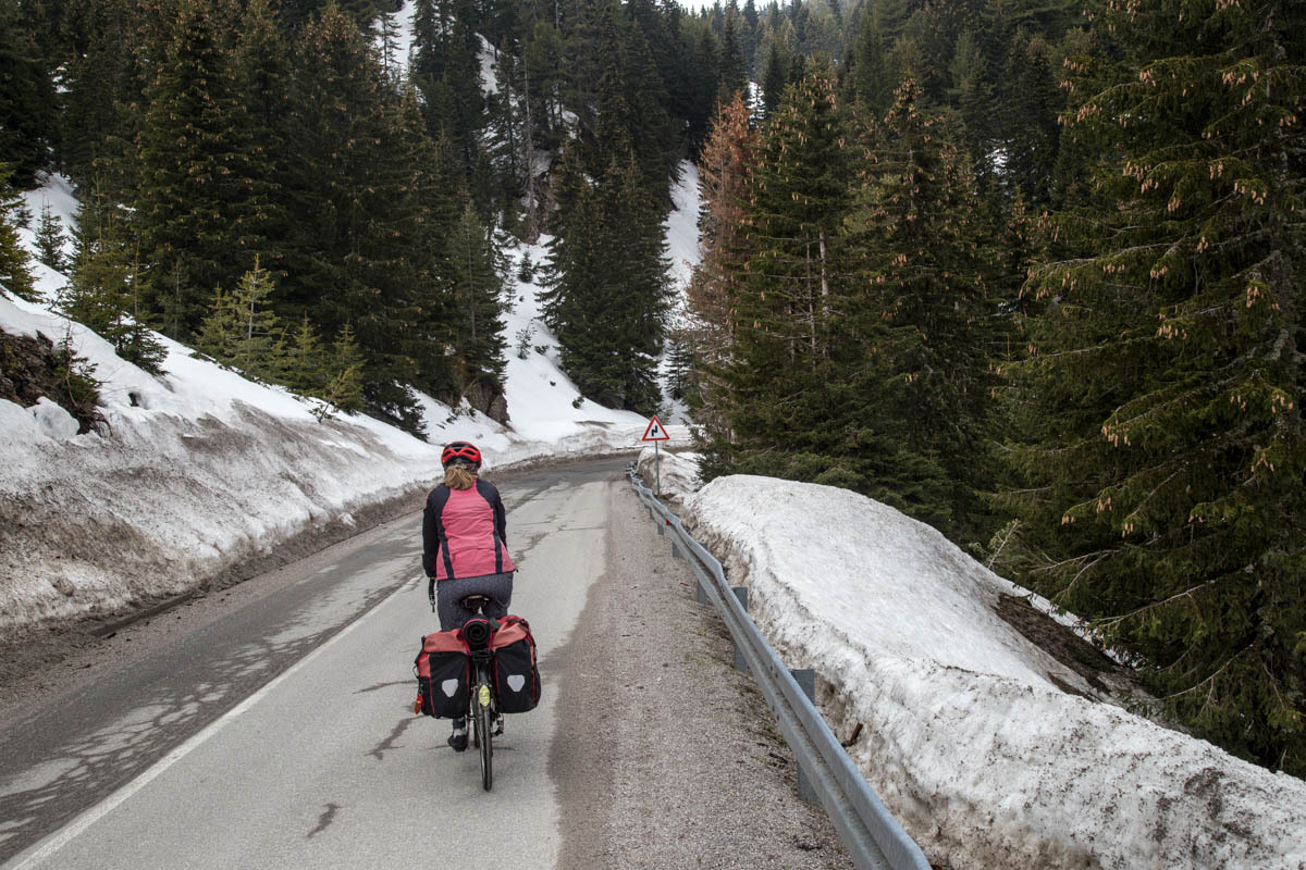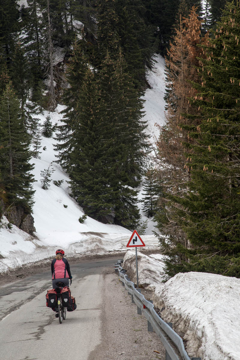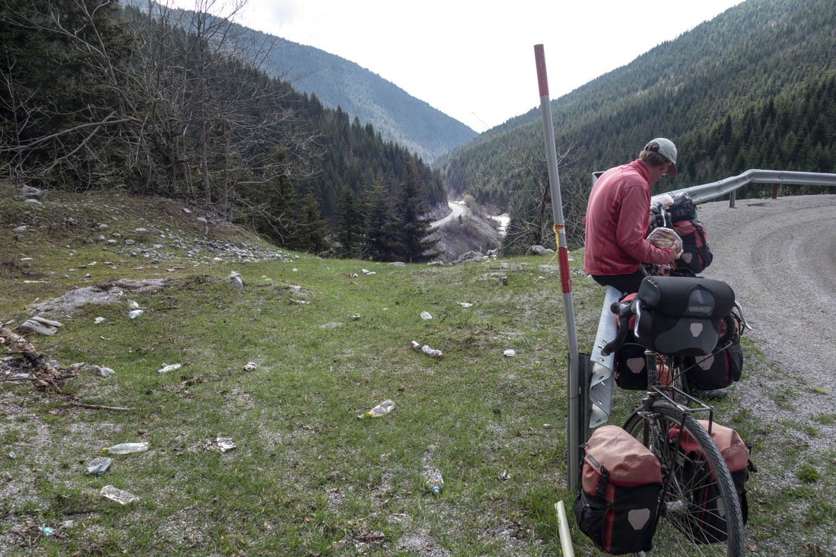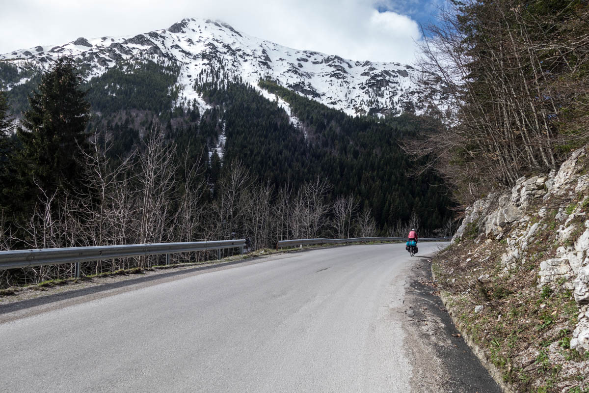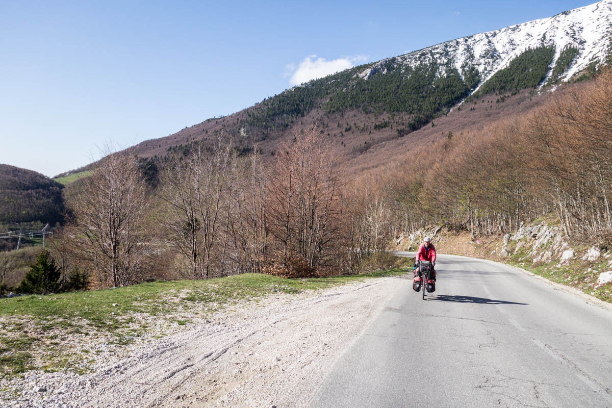 The very friendly woman at the immigration post indicates with her hand that the road is still going up and then says giving us our passports back “10km.” And it was, 10km of climbing to the high point that still has snow. The Montenegro border post is 3km after the high point. The grade is sometimes manageable at about 7% and sometimes just a little too steep for us to ride, so we walk. It is slow going and we regret getting off the taxi, but on the other hand at least we are working for it and are experiencing these mountains. Eventually the pass summit comes in view and we put some extra layers on for the downhill. About 3km down is the Montenegro border post with a bunch of freezing border guards.