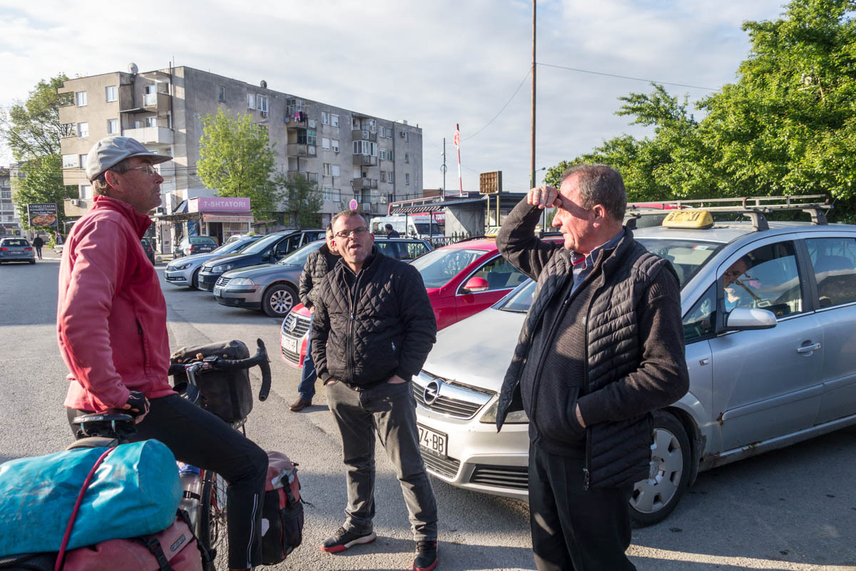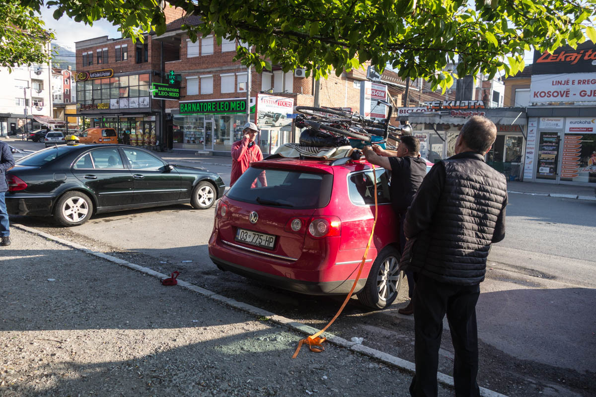 “Let’s circle the bus station,” Patrick navigates us to the side where taxis are parked. “Do you speak English?” a no head shake and then a question from the taxi driver “German?” Speaking German, Patrick negotiates a fare of $40 to the Kosovo Border with a taxi that has a roof rack.