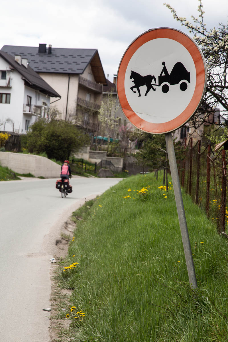 As we wait at the immigration post, a fox walks through and on top of the garbage dumpster, then goes and sits by a car, the guard tells us there are black bears around. Montenegro still stamps passports. We set off downhill through a forest. For the first time in a long time, we see a traffic sign with a picture of a deer leaping. Maybe we will be lucky to see some wildlife besides giant snails.