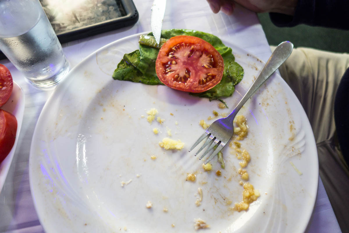 The Hotel breakfast is superb with Omelet and cheese, juice and coffee, and bread. Also served is a plate of thick tomato slices and black olives that we didn’t even try to eat. “I’m still full from last night’s dinner,” Patrick confesses. He ate the whole plate of chicken schnitzel, thick potato slices, grilled zucchini and peppers, and salad.