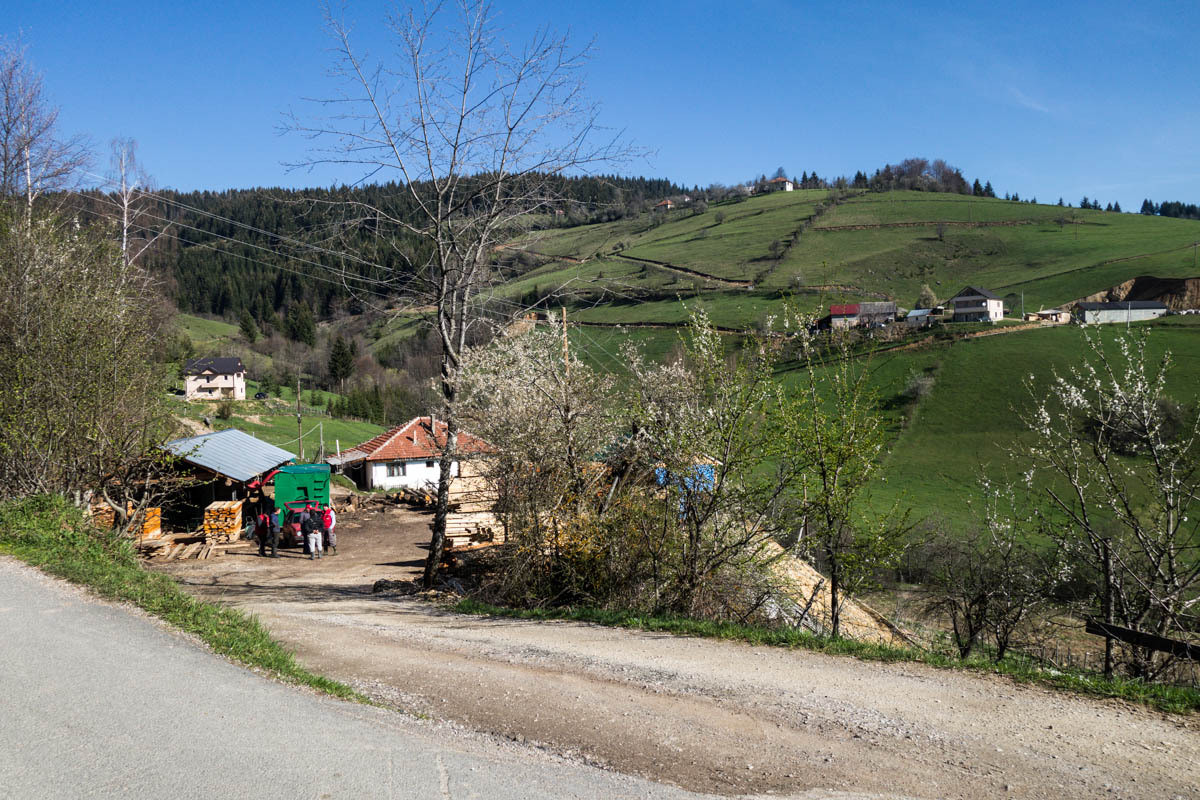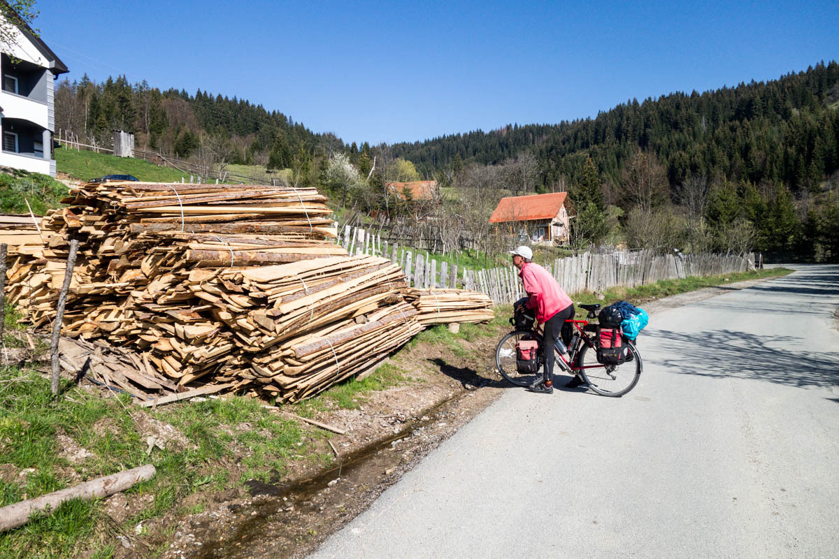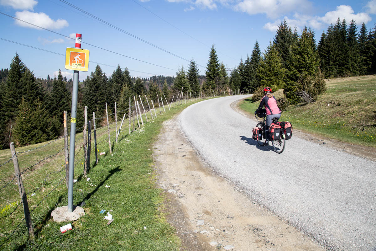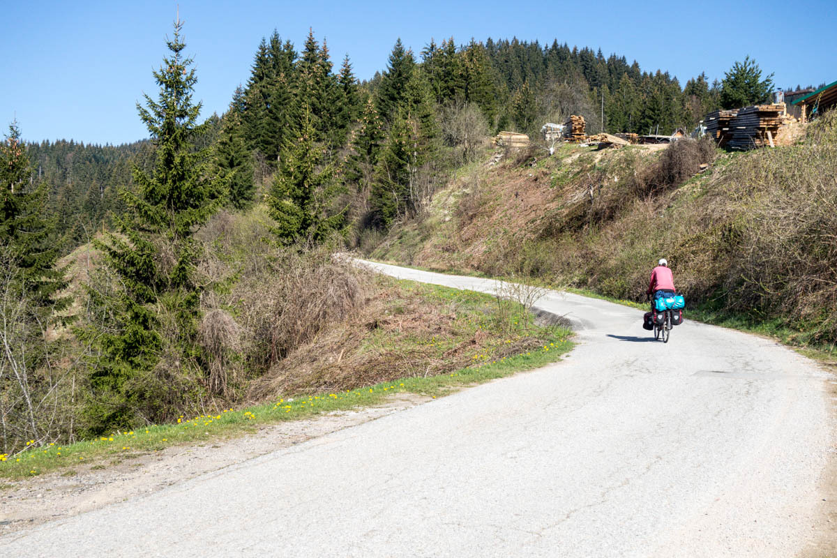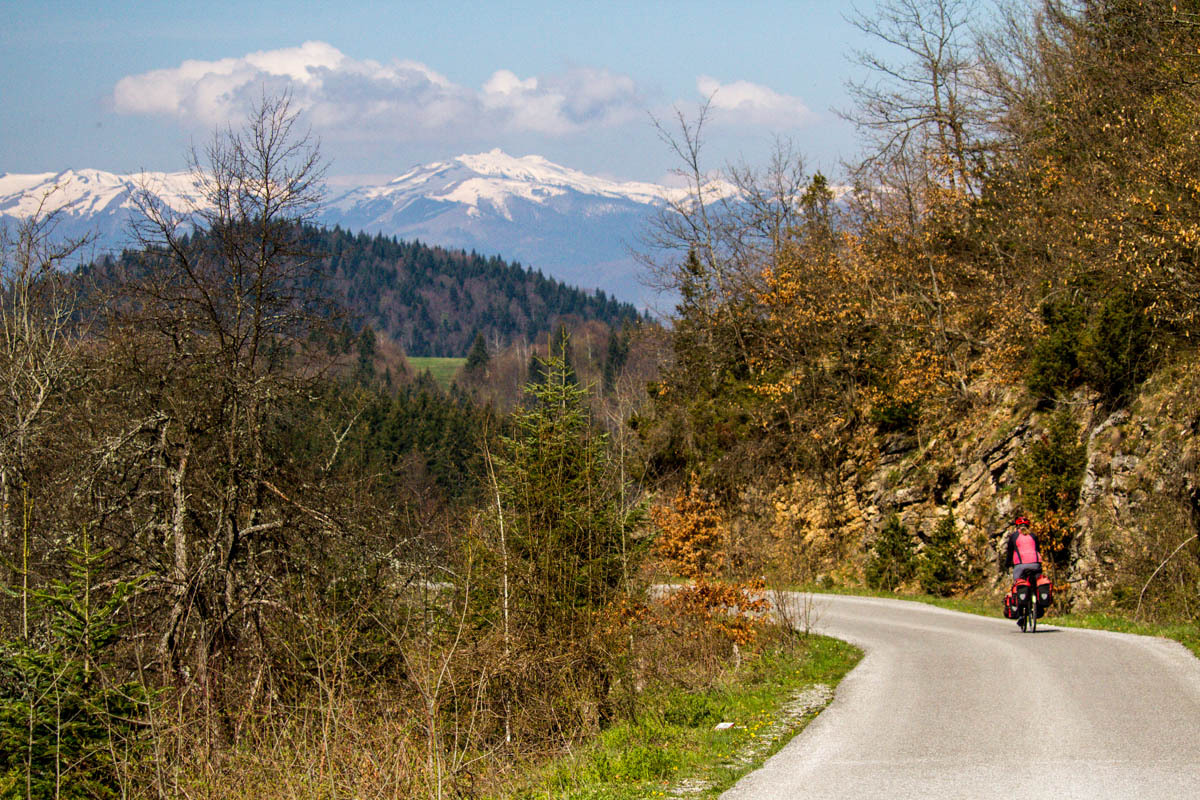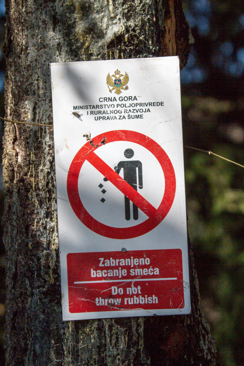 The first 5km are on the main road and at a slight incline. We reach the turnoff to P20 and start a 5% climb for the next 6km. This is a quiet road and as we pass by we get glimpses of life in rural Montenegro: a man chopping wood, a woman with a bucket headed to the barn, hearing a chain saw in the forest, laundry hanging from the second floor balcony, and cows in the meadow. The 6km is bliss through a forest and views of the snow covered mountains. At close to the high point, there is a road side water fountain and a park around a war monument. If camping, this would be a great spot.