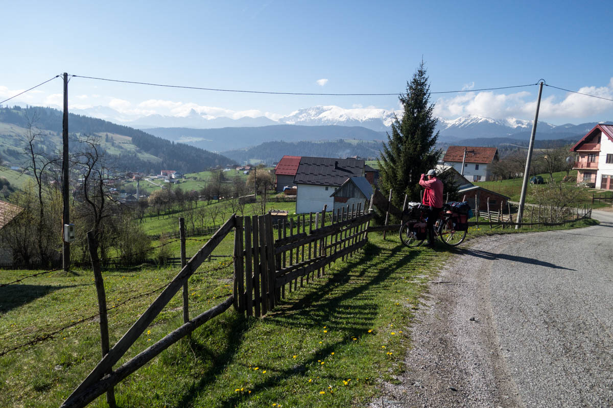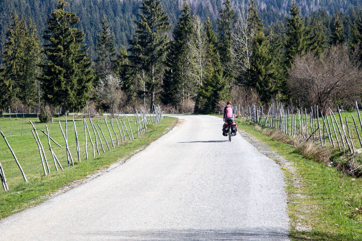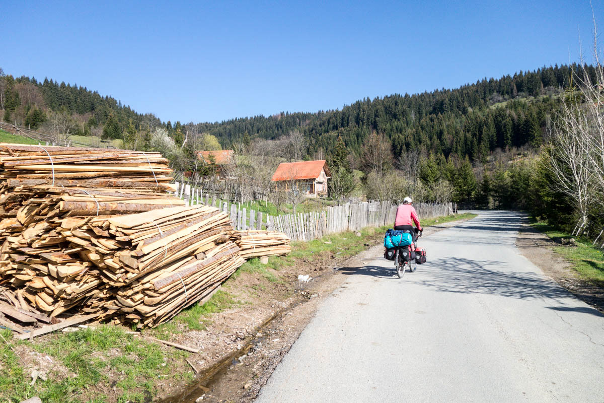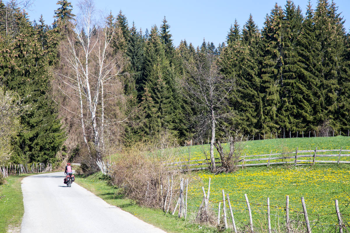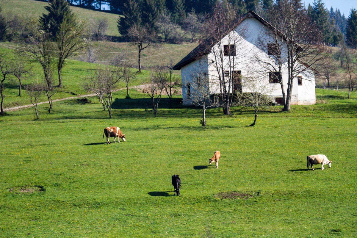 The first 5km are on the main road and at a slight incline. We reach the turnoff to P20 and start a 5% climb for the next 6km. This is a quiet road and as we pass by we get glimpses of life in rural Montenegro: a man chopping wood, a woman with a bucket headed to the barn, hearing a chain saw in the forest, laundry hanging from the second floor balcony, and cows in the meadow. The 6km is bliss through a forest and views of the snow covered mountains. At close to the high point, there is a road side water fountain and a park around a war monument. If camping, this would be a great spot.