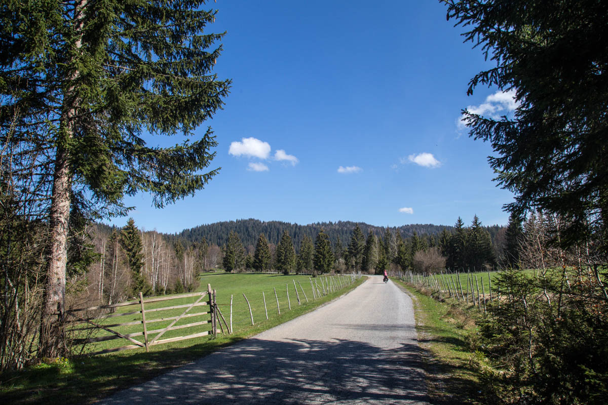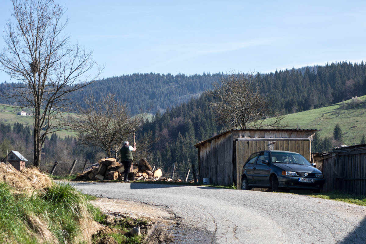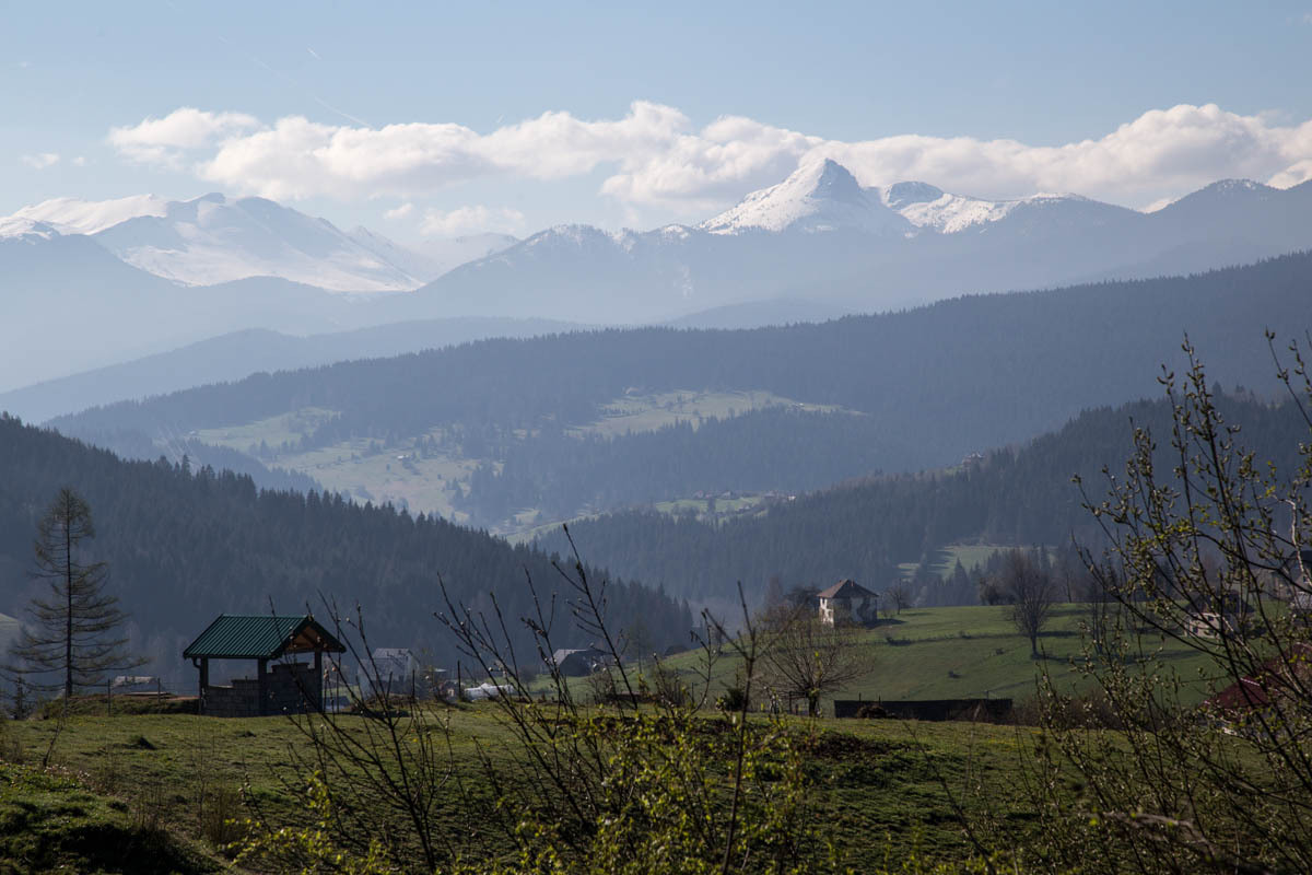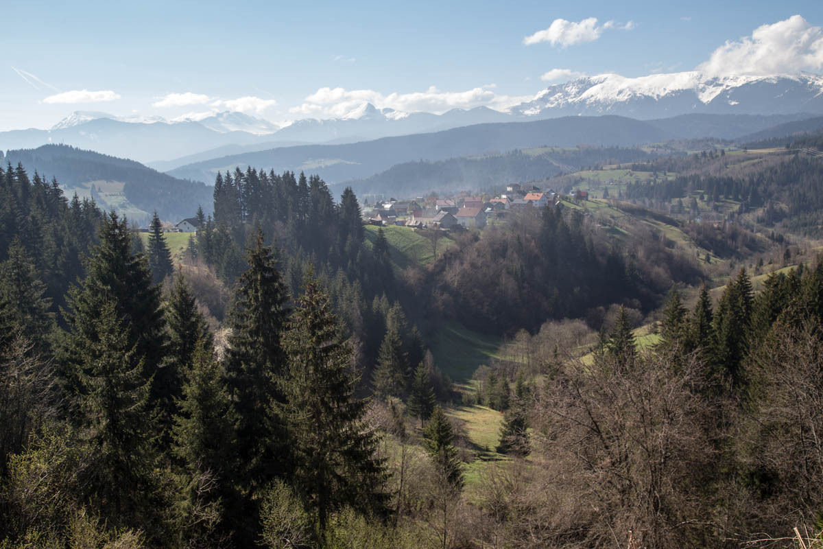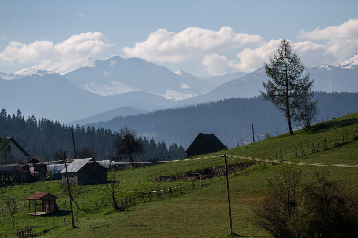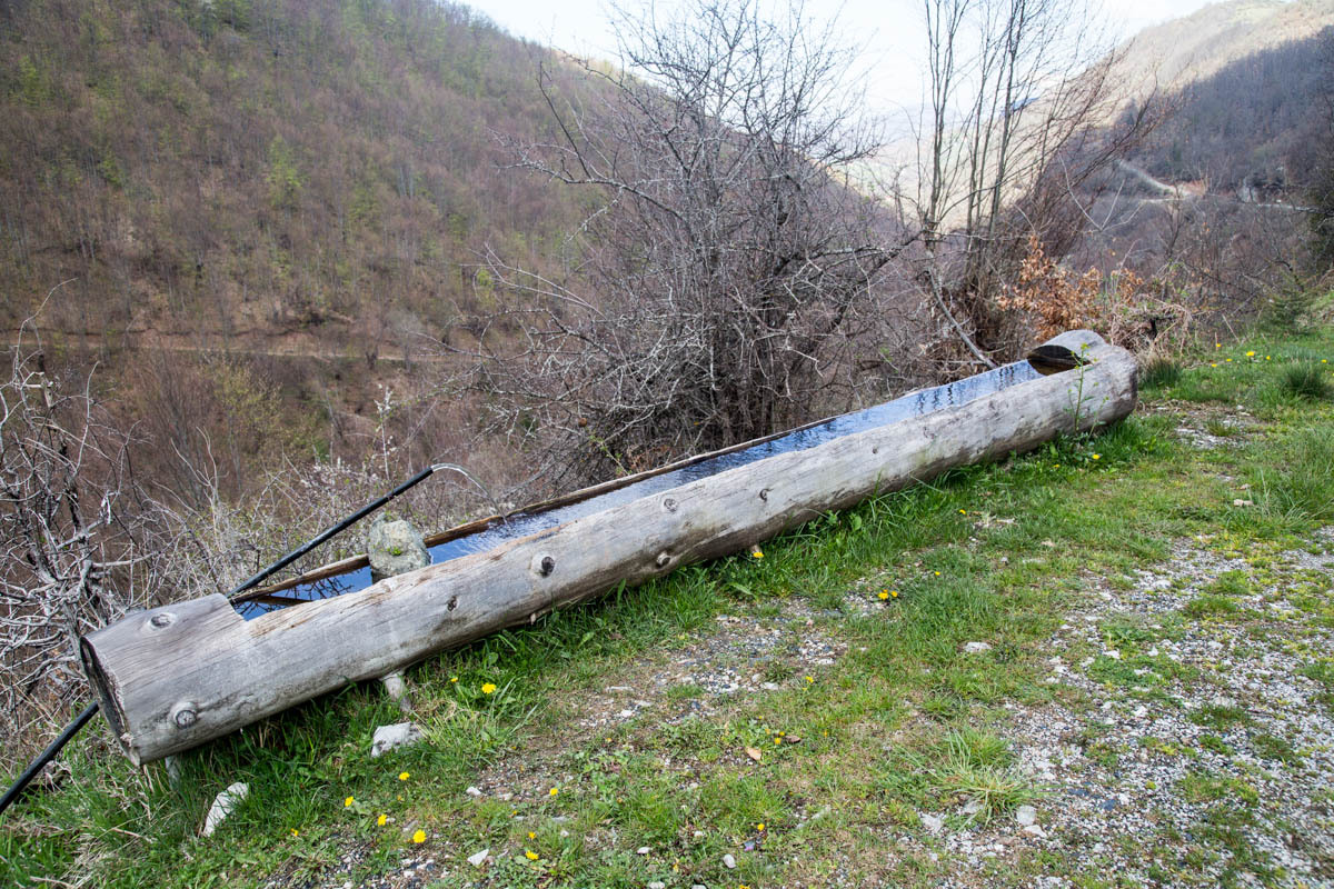 The first 5km are on the main road and at a slight incline. We reach the turnoff to P20 and start a 5% climb for the next 6km. This is a quiet road and as we pass by we get glimpses of life in rural Montenegro: a man chopping wood, a woman with a bucket headed to the barn, hearing a chain saw in the forest, laundry hanging from the second floor balcony, and cows in the meadow. The 6km is bliss through a forest and views of the snow covered mountains. At close to the high point, there is a road side water fountain and a park around a war monument. If camping, this would be a great spot.
