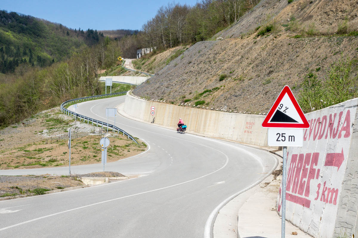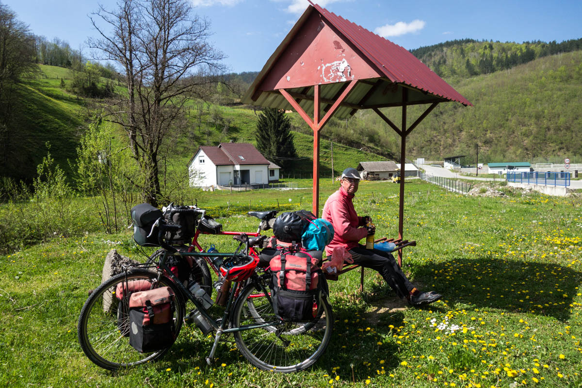 We reach the junction to Petjnica. There is a 9% grade sign, not a welcome sight after 12km of downhill. But it is short. Around the bend is the next turnoff to the main road between Berane and Bijelo Polje and we stop to eat our second breakfast of an omelet sandwich. We watch a policeman at the intersection periodically stop cars by waving a stop sign. Those he knows he waves and shakes hands, those he doesn’t he asks for license and registration.